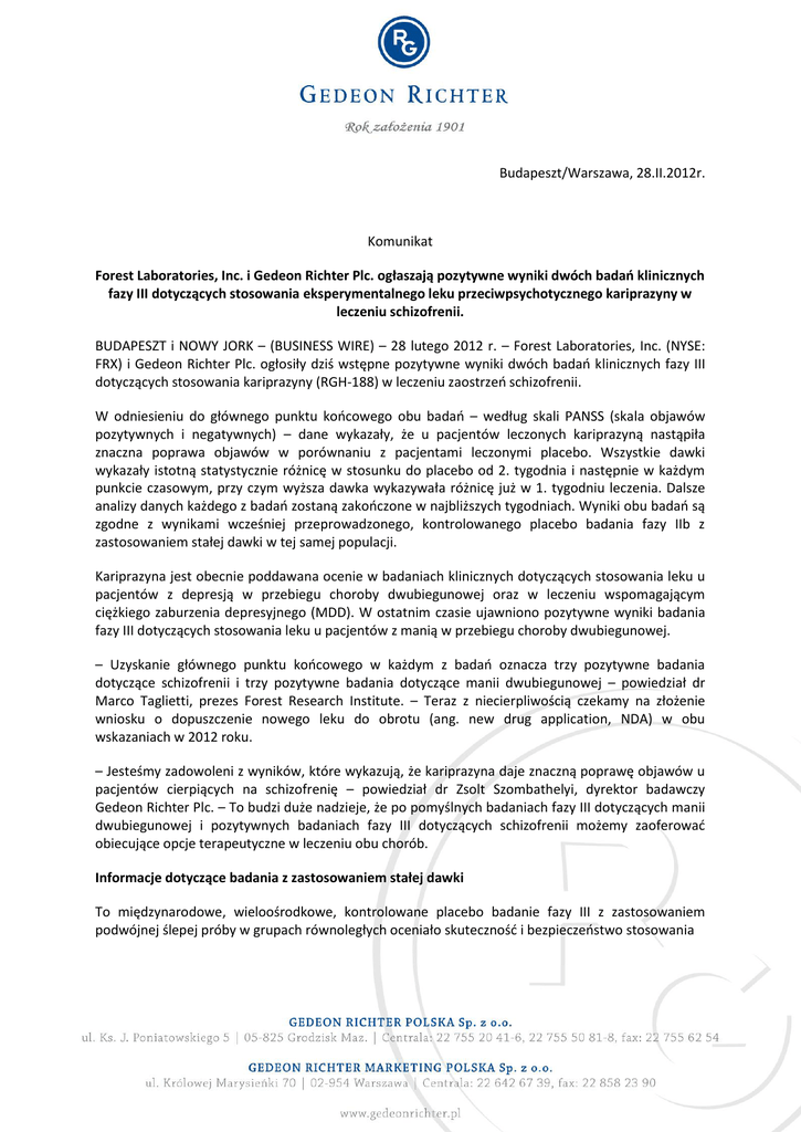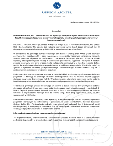 Budapeszt/Warszawa, 28.II.2012r. Komunikat Forest Laboratories, Inc. i Gedeon Richter Plc. ogłaszają pozytywne wyniki dwóch badao klinicznych fazy III dotyczących stosowania eksperymentalnego leku przeciwpsychotycznego kariprazyny w leczeniu schizofrenii. BUDAPESZT i NOWY JORK – (BUSINESS WIRE) – 28 lutego 2012 r. – Forest Laboratories, Inc. (NYSE: FRX) i Gedeon Richter Plc. ogłosiły dziś wstępne pozytywne wyniki dwóch badao klinicznych fazy III dotyczących stosowania kariprazyny (RGH-188) w leczeniu zaostrzeo schizofrenii. W odniesieniu do głównego punktu koocowego obu badao – według skali PANSS (skala objawów pozytywnych i negatywnych) – dane wykazały, że u pacjentów leczonych kariprazyną nastąpiła znaczna poprawa objawów w porównaniu z pacjentami leczonymi placebo. Wszystkie dawki wykazały istotną statystycznie różnicę w stosunku do placebo od 2. tygodnia i następnie w każdym punkcie czasowym, przy czym wyższa dawka wykazywała różnicę już w 1. tygodniu leczenia. Dalsze analizy danych każdego z badao zostaną zakooczone w najbliższych tygodniach. Wyniki obu badao są zgodne z wynikami wcześniej przeprowadzonego, kontrolowanego placebo badania fazy IIb z zastosowaniem stałej dawki w tej samej populacji. Kariprazyna jest obecnie poddawana ocenie w badaniach klinicznych dotyczących stosowania leku u pacjentów z depresją w przebiegu choroby dwubiegunowej oraz w leczeniu wspomagającym ciężkiego zaburzenia depresyjnego (MDD). W ostatnim czasie ujawniono pozytywne wyniki badania fazy III dotyczących stosowania leku u pacjentów z manią w przebiegu choroby dwubiegunowej. – Uzyskanie głównego punktu koocowego w każdym z badao oznacza trzy pozytywne badania dotyczące schizofrenii i trzy pozytywne badania dotyczące manii dwubiegunowej – powiedział dr Marco Taglietti, prezes Forest Research Institute. – Teraz z niecierpliwością czekamy na złożenie wniosku o dopuszczenie nowego leku do obrotu (ang. new drug application, NDA) w obu wskazaniach w 2012 roku. – Jesteśmy zadowoleni z wyników, które wykazują, że kariprazyna daje znaczną poprawę objawów u pacjentów cierpiących na schizofrenię – powiedział dr Zsolt Szombathelyi, dyrektor badawczy Gedeon Richter Plc. – To budzi duże nadzieje, że po pomyślnych badaniach fazy III dotyczących manii dwubiegunowej i pozytywnych badaniach fazy III dotyczących schizofrenii możemy zaoferowad obiecujące opcje terapeutyczne w leczeniu obu chorób. Informacje dotyczące badania z zastosowaniem stałej dawki To międzynarodowe, wieloośrodkowe, kontrolowane placebo badanie fazy III z zastosowaniem podwójnej ślepej próby w grupach równoległych oceniało skutecznośd i bezpieczeostwo stosowania kariprazyny u pacjentów z zaostrzeniem schizofrenii. Warunkiem dopuszczenia do badania było spełnianie kryteriów rozpoznania schizofrenii określone w Podręczniku Diagnostyczno-Statystycznym Chorób Psychicznych, wydanie IV zmienione (DSM-IV-TR) i ogólny wynik w skali PANSS w zakresie 80 do 120 w okresie przesiewowym i w stanie początkowym. Po okresie wypłukania, w którym przez okres do 7 dni nie stosowano żadnego leczenia przeciwpsychotycznego, w sposób randomizowany przydzielono łącznie 617 pacjentów w wieku od 18 do 60 lat do jednej z następujących grup terapeutycznych: 3 mg/dobę kariprazyny, 6 mg/dobę kariprazyny, 10 mg/dobę aripiprazolu lub placebo podawanych raz dziennie przez 6 tygodni, po których następował dwutygodniowy okres oceny bezpieczeostwa, kiedy nie podawano żadnych leków. Pacjentów hospitalizowano w trakcie całego okresu wypłukania oraz przez pierwsze 4 tygodnie leczenia z podwójnie zaślepioną próbą. Następnie pacjenci byli objęci kontrolą w leczeniu zamkniętym lub otwartym, zgodnie z decyzją badacza i na podstawie stanu pacjenta. Głównym punktem koocowym określonym w protokole była zmiana ogólnego wyniku w skali PANSS po 6 tygodniach leczenia w stosunku do stanu początkowego w grupach leczonych wyłącznie kariprazyną, w porównaniu z grupą leczoną placebo, na podstawie analiz przeprowadzonych według modelu efektów mieszanych wielokrotnych pomiarów (MMRM). PANSS to ogólnie przyjęta skala stosowana do oceny nasilenia objawów schizofrenii. Na podstawie analizy metodą MMRM stwierdzono istotną statystycznie poprawę ogólnego wyniku w skali PANSS w każdej grupie pacjentów otrzymujących kariprazynę (w dawce 3 mg/dobę: o -6,1 punktu, p <0,0044 i w dawce 6 mg/dobę: o -8,8 punktu, p < 0,0001) w porównaniu z grupą otrzymującą placebo. Zmiana ogólnego wyniku w skali PANSS w stosunku do stanu początkowego była istotna statystycznie w każdym punkcie czasowym od 1. tygodnia w grupie przyjmującej kariprazynę 6 mg/dobę i od 3. tygodnia w grupie przyjmującej kariprazynę 3 mg/dobę. W każdym tygodniu badania odnotowano również istotną statystycznie poprawę ogólnego wyniku w skali PANSS w grupie przyjmującej aripiprazol w stosunku do grupy placebo. Ogółem badanie ukooczyło 67% pacjentów. Wskaźnik przypadków przedwczesnego przerwania leczenia (z dowolnej przyczyny, w tym w związku ze zdarzeniem niepożądanym) wynosił 33% w grupie pacjentów otrzymujących kariprazynę w dawce 3 mg/dobę, 38% w grupie pacjentów otrzymujących kariprazynę w dawce 6 mg/dobę, 25% w grupie pacjentów otrzymujących aripiprazol w dawce 10mg/dobę i 38% w grupie pacjentów otrzymujących placebo. Kariprazyna była zasadniczo dobrze tolerowana, przy czym najczęstsze zdarzenia niepożądane (≥10%) obserwowane w każdej grupie obejmowały akatyzję, bezsennośd i ból głowy. Informacje na temat badania z zastosowaniem stałej i zmiennej dawki To międzynarodowe, wieloośrodkowe, kontrolowane placebo badanie fazy III z zastosowaniem podwójnej ślepej próby w grupach równoległych oceniało skutecznośd i bezpieczeostwo stosowania kariprazyny u pacjentów z zaostrzeniem schizofrenii. Pacjenci włączeni do bada