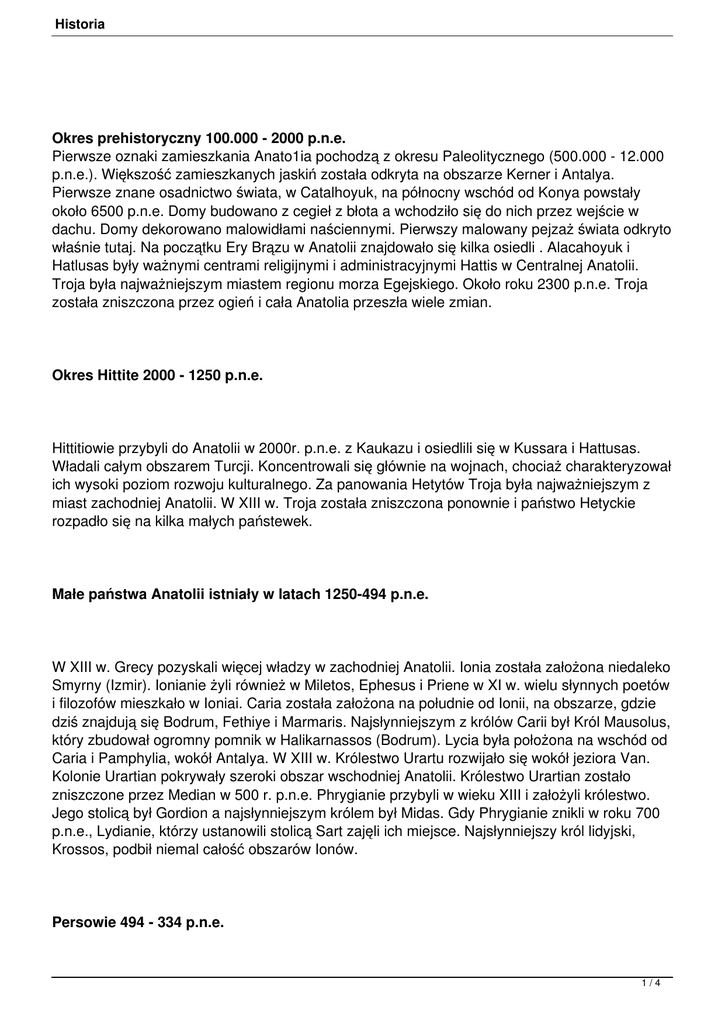 Historia Okres prehistoryczny 100.000 - 2000 p.n.e. Pierwsze oznaki zamieszkania Anato1ia pochodzą z okresu Paleolitycznego (500.000 - 12.000 p.n.e.). Większość zamieszkanych jaskiń została odkryta na obszarze Kerner i Antalya. Pierwsze znane osadnictwo świata, w Catalhoyuk, na północny wschód od Konya powstały około 6500 p.n.e. Domy budowano z cegieł z błota a wchodziło się do nich przez wejście w dachu. Domy dekorowano malowidłami naściennymi. Pierwszy malowany pejzaż świata odkryto właśnie tutaj. Na początku Ery Brązu w Anatolii znajdowało się kilka osiedli . Alacahoyuk i Hatlusas były ważnymi centrami religijnymi i administracyjnymi Hattis w Centralnej Anatolii. Troja była najważniejszym miastem regionu morza Egejskiego. Około roku 2300 p.n.e. Troja została zniszczona przez ogień i cała Anatolia przeszła wiele zmian. Okres Hittite 2000 - 1250 p.n.e. Hittitiowie przybyli do Anatolii w 2000r. p.n.e. z Kaukazu i osiedlili się w Kussara i Hattusas. Władali całym obszarem Turcji. Koncentrowali się głównie na wojnach, chociaż charakteryzował ich wysoki poziom rozwoju kulturalnego. Za panowania Hetytów Troja była najważniejszym z miast zachodniej Anatolii. W XIII w. Troja została zniszczona ponownie i państwo Hetyckie rozpadło się na kilka małych państewek. Małe państwa Anatolii istniały w latach 1250-494 p.n.e. W XIII w. Grecy pozyskali więcej władzy w zachodniej Anatolii. Ionia została założona niedaleko Smyrny (Izmir). Ionianie żyli również w Miletos, Ephesus i Priene w XI w. wielu słynnych poetów i filozofów mieszkało w Ioniai. Caria została założona na południe od Ionii, na obszarze, gdzie dziś znajdują się Bodrum, Fethiye i Marmaris. Najsłynniejszym z królów Carii był Król Mausolus, który zbudował ogromny pomnik w Halikarnassos (Bodrum). Lycia była położona na wschód od Caria i Pamphylia, wokół Antalya. W XIII w. Królestwo Urartu rozwijało się wokół jeziora Van. Kolonie Urartian pokrywały szeroki obszar wschodniej Anatolii. Królestwo Urartian zostało zniszczone przez Median w 500 r. p.n.e. Phrygianie przybyli w wieku XIII i założyli królestwo. Jego stolicą był Gordion a najsłynniejszym królem był Midas. Gdy Phrygianie znikli w roku 700 p.n.e., Lydianie, którzy ustanowili stolicą Sart zajęli ich miejsce. Najsłynniejszy król lidyjski, Krossos, podbił niemal całość obszarów Ionów. Persowie 494 - 334 p.n.e. 1/4 Historia Persja była pierwszym zdobywcą który władał całością obszaru dzisiejszej Turcji. Ciągłe wojny z Grekami powodowały, że status Persów pogarszał się. Kultura była zachowywa na wewnątrz pałaców, więc perski wpływ w regionie nie był znaczący. Okres helleński 334 - 133 p.n.e. Król Macedoński, Aleksander Wielki podbił Grecję, Anatolię i w 331r. p.n.e., całą Persję. Helleni władali regionem od zachodniej Grecji po dzisiejszą granicę Pakistanu. W okresie helleńskim rozwinięte zostały miasta. Miały swoje własne prawa, autonomię i system obrony a utrzymywały się z rolnictwa. Imperium Rzymskie 133 p.n.e. - 395 n.e. Rzymianie podbili wszystkie państwa Anatolii w latach 133 -129 p.n.e. Imperium Rzymskie przyniosło ze sobą Pax Romana, okres pokoju. Imperator rzymski, Konstantyn ustanowił stolicą Konstantynopol w roku 330 n.e. i uznał Chrześcijaństwo religią urzędową. Stopniowo zachodnia 2/4 Historia i wschodnia część imperium odsuwały się od siebie i w r. 395 Imperium podzieliło się na dwie części. Bizancjum 395-1453 n.e. Bizancjum panowało w VI w. nad całością obszaru śródziemnomorskiego, od Palestyny po Półwysep Iberyjski, granice jednakże stale się zmieniały. Na wschodzie Persowie, Arabowie i Turcy stanowili zagrożenie a na zachodzie zagrożeniem byli Bułgarzy i Słowianie. W 1071 r. tureccy Seldżukowie podbili Bizancjum. W wyniku krucjat związki pomiędzy wschodnimi i zachodnimi Chrześcijanami pogarszały się i w roku 1201 zachodnia armia podbiła Konstantynopol. Miasto znajdowało się pod panowaniem łacińskim do roku 1261, gdy Imperator Micael I odbił je z powrotem na rzecz Bizancjum. Bizancjum upadło całkowicie gdy Sułtan Wiary Ottomańskiej Mehmet (Mehmet Zdobywca) podbił Konstantynopol w roku 1453. Państwo Seldżuckie. W latach 1038 - 1318 Islam, który narodził się na Półwyspie Arabskim w VII w. próbował podbić Środkowy Wschód, lecz bezskutecznie aż do roku 1071, gdy Seldżukowie podbili armię bizantyjską w Manzikent. Po tym zwycięstwie ustanowiono kilka małych państw tureckich w Anatolii. Oprócz tureckiego języka i religii islamskiej, Seldżukowie zostawili po sobie również wysoki standard architektury. Imperium Ottomańskie 1299 - 1923 3/4 Historia Podczas, zostało Anatolii. Ottomańskie północy śródziemnego. założone po Gdy gdy Egipt rozprzestrzeniało Otomanowie Chrześcijanie na wokół południu. Nikea podbili na (lznik), W się zachodzie latach Konstantynopol, od rosnąc 1400 iW wschodzie na – siłę 1500 wschód stał istoi stopniowo Imperium walczyli się od on Algierii było ze rozprzestrzeniając sobą, na całego zachodzie Imperium Morza Imperium. okultura się Ottomańskie na Imperium całość na Imperium nauka. władania wprowadzono Niemców. Alianci okupowali W ludem. Otomańskie czasie Turcja reformy, W panowania była Stambuł roku aliantem trwało było 1870 i UE planowali już Imperium ustanowiono Niemiec na lat aZatoki podział nastał pod podczas iroku władza konstytucję jego upadek panowaniem Pierwszej wpadła a niektórym iRady państwo w Wojny rozkwitała władcom uzyskało sztuka, parlament. zabrakło Francuzów talentu Gdy iwojnę. ido Grecja został Brytyjczyków Generał kraju którzy uzyskała i Inönü. podzielony założył założyli okupowała Mustafa swoje arząd. armię Turcja obecne Kemal pomiędzy zachodnią Ustanowił okupacyjną zarządzała granice. wyruszył Anglię, Anatolię również Aliantów. do jedyni