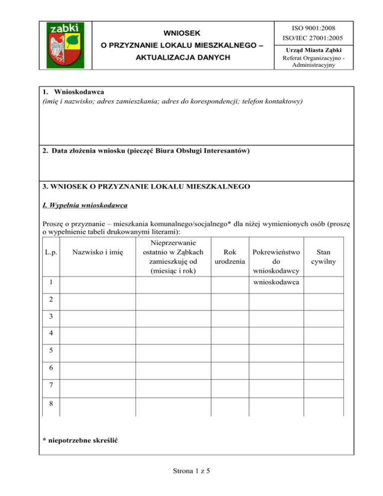 WNIOSEK O PRZYZNANIE LOKALU MIESZKALNEGO – AKTUALIZACJA DANYCH ISO 9001:2008 ISO/IEC 27001:2005 Urząd Miasta Ząbki Referat Organizacyjno Administracyjny 1. Wnioskodawca (imię i nazwisko; adres zamieszkania; adres do korespondencji; telefon kontaktowy) 2. Data złożenia wniosku (pieczęć Biura Obsługi Interesantów) 3. WNIOSEK O PRZYZNANIE LOKALU MIESZKALNEGO I. Wypełnia wnioskodawca Proszę o przyznanie – mieszkania komunalnego/socjalnego* dla niżej wymienionych osób (proszę o wypełnienie tabeli drukowanymi literami): L.p. Nazwisko i imię Nieprzerwanie ostatnio w Ząbkach zamieszkuję od (miesiąc i rok) 1 Rok Pokrewieństwo urodzenia do wnioskodawcy wnioskodawca 2 3 4 5 6 7 8 * niepotrzebne skreślić Strona 1 z 5 Stan cywilny Ponadto w mieszkaniu, w którym obecnie mieszkam – na stałe zamieszkują (proszę o wypełnienie tabeli drukowanymi literami): L.p. Nazwisko i imię Nieprzerwanie ostatnio Rok Pokrewieństwo w Ząbkach zamieszkuję urodzenia do od (miesiąc i rok) wnioskodawcy 1 x x 2 x x 3 x x 4 x x 5 x x 6 x x 7 x x 8 x x Jednocześnie informuję, że: 1. Zamieszkuję w lokalu w charakterze: najemcy / członka rodziny / podnajemcy (właściwe podkreślić). Zajmowany lokal stanowi własność: osoby obcej dla mnie / osoby spokrewnionej (właściwe podkreślić). Proszę wpisać stopień pokrewieństwa …............................................................... Lokal składa się z …................... pokoju/pokoi, o łącznej powierzchni ….........................m² oraz kuchni o powierzchni ….................... m². Powierzchnia mieszkalna lokalu wynosi …..................... m². 2. Mieszkanie wyposażone jest w instalację wodną, kanalizacyjną, elektryczną, gazową, centralne ogrzewanie, łazienkę, WC (właściwe podkreślić). 3. Adres poprzedniego miejsca zamieszkania …........................................................................................................................................................... ............................................................................................................................................................... 4. Adres aktualnego miejsca zameldowania wnioskodawca - ….................................................................................................................................... współmałżonek - ................................................................................................................................... Strona 2 z 5 …...................................... ……......................................... Data Podpis wnioskodawcy OŚWIADCZENIE Świadomy/a jestem odpowiedzialności karnej, wynikającej z art. 233 § 1 Kodeksu karnego (ustawa z dnia 6 czerwca 1997 r. - Kodeks karny Dz. U. z 1997 r. Nr 88, poz. 553 ze zm.) za złożenie niezgodnego z prawdą oświadczenia. Stwierdzam również, że: 1. moje warunki mieszkaniowe są bardzo trudne, 2. nie posiadam tytułu prawnego do lokalu mieszkalnego (jak i inne osoby wyszczególnione we wniosku), 3. nie posiadam prawa własności nieruchomości lub prawa użytkowania wieczystego gruntu, 4. ostatnio nieprzerwanie w Ząbkach …................................................................ zamieszkuję od (miesiąc i rok) Jednocześnie oświadczam, że jestem świadomy/a, że podanie nieprawdziwych danych spowoduje niezakwalifikowanie mnie do przyznania prawa do najmu lokalu mieszkalnego. Ponadto oświadczam, że wyrażam zgodę na przeprowadzenie kontroli moich warunków zamieszkiwania przez Społeczną Komisję Mieszkaniową. …............................... …................................................. Data Podpis oświadczającego Wyrażam zgodę na przetwarzanie przedstawionych danych osobowych, dla potrzeb związanych ze złożonym wnioskiem, zgodnie z ustawą z dnia 29 sierpnia 1997 r. o ochronie danych osobowych, oraz na prowadzenie postępowania sprawdzającego przedstawione dane. …................................ .................................................... Data Podpis wyrażającego zgodę Strona 3 z 5 II. Wypełnia pracownik Referatu Organizacyjno – Administracyjnego Urzędu Miasta Ząbki 1. Powierzchnia mieszkalna lokalu wynosi ….................. m². 2. Powierzchnia pokoi przypadająca na jednego członka rodziny to …......................... m². 3. Dochód brutto za rok poprzedzający złożenie wniosku o przyznanie lokalu mieszkalnego …..................................... 4. Dochód brutto przypadający na jednego członka rodziny w roku poprzedzającym złożenie wniosku o przyznanie lokalu mieszkalnego …..................................... 5. Posiadanie tytułu prawnego do innego lokalu lub domu wnioskodawcy lub współmałżonka …...................................................................................................................................................... 6. Posiadanie prawa własności nieruchomości lub prawa użytkowania wieczystego gruntu wnioskodawcy lub współmałżonka …............................................................................................. ….............................. ….........…........................................ Data Podpis pracownika Referatu Organizacyjno Administracyjnego III. Wypełnia Społeczna Komisja Mieszkaniowa Opinia Komisji: …...................................................................................................................................................... .......................................................................................................................................................... ......................................................................................................................................................... …….................................................................................................................................................. ......
