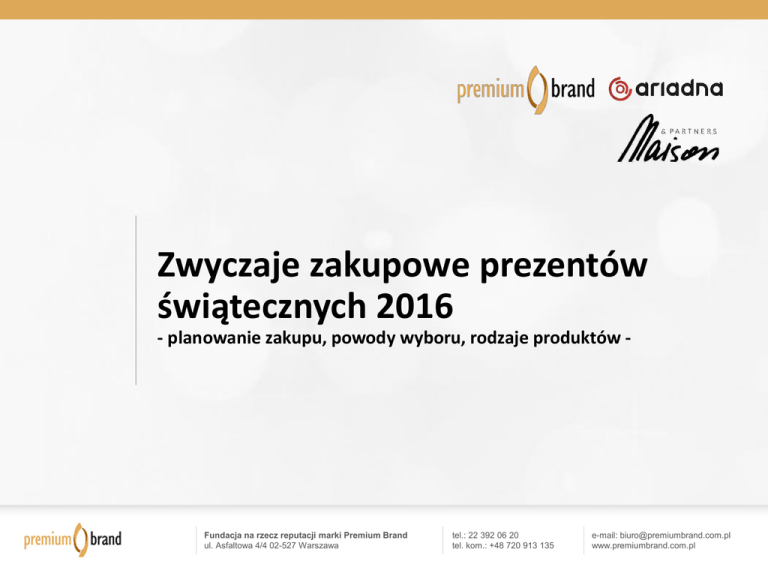 Zwyczaje zakupowe prezentów świątecznych 2016 - planowanie zakupu, powody wyboru, rodzaje produktów - Fundacja na rzecz reputacji marki Premium Brand ul. Asfaltowa 4/4 02-527 Warszawa tel.: 22 392 06 20 tel. kom.: +48 720 913 135 e-mail: [email protected] www.premiumbrand.com.pl Podsumowanie wyników Badanie przeprowadzone dla Fundacji Premium Brand na panelu Ariadna przez agencję Maison&Partners wskazuje, że większość Polaków (77%) lubi kupować prezenty pod choinkę i większość zamierza je kupić w bieżącym roku (70%). Ponad połowa z planujących zakup świątecznych prezentów (51%) zamierza wydać na nie ponad 300 zł, a pozostali planują zmieść się w kwocie 101-300 zł (37%) lub do 100 zł (12%). Główne kryterium jakimi się kierują Polacy kupując prezenty świąteczne, to oczekiwania obdarowywanych (83%), ale także wysoka jakość prezentów (53%) i promocje świąteczne (52%). A co czwarta osoba (24%) wskazuje także reputacja marki (24%), a co piąta (19%) polskie pochodzenie produktu. Zdaniem profesor Dominiki Maison z Wydziału Psychologii Uniwersytetu Warszawskiego „Uzyskane wyniki potwierdzają tezę, że jakość produktu to nie wszystko. Coraz większego znaczenia nabiera reputacja marek i firm oraz etnocentryzm konsumencki, nazywany także patriotyzmem gospodarczym.”. Do najczęściej planowanych kategorii prezentów należą zabawki dla dzieci (46%), perfumy (45%), kosmetyki (44%), odzież (40%), książki (29%) i biżuteria (24%). Większość badanych planuje kupić prezenty choinkowe najpóźniej do końca drugiego tygodnia grudnia (83%), ale też nie brakuje osób, które zakupy zostawią na ostatnią chwilę, niemal tuż przed Wigilią. Odpowiadają wszyscy badani (N=1075). Badanie przeprowadzone w dniach 25-29 listopada 2016 roku na ogólnopolskiej próbie liczącej N=1075 osób, dobranej z panelu Ariadna metodą CAWI. Kwoty dobrane wg reprezentacji w populacji Polaków w wieku 18 lat i więcej dla płci, wieku, wykształcenia i wielkości miejscowości zamieszkania. Nota metodologiczna Raport prezentuje wyniki badania przeprowadzonego na zlecenie Fundacji na rzecz reputacji marki „Premium Brand” przez agencję badawczą Maison&Partners na panelu Ariadna. Próba ogólnopolska licząca N=1075 osób. Kwoty dobrane wg reprezentacji w populacji Polaków w wieku 18 lat i więcej dla płci, wieku, wykształcenia i wielkości miejscowości zamieszkania. Realizacja w dniach 25-29 listopada 2016 roku. Metoda: CAWI. Fundacja na rzecz reputacji marki Premium Brand ul. Asfaltowa 4/4 02-527 Warszawa tel.: 22 392 06 20 tel. kom.: +48 720 913 135 e-mail: [email protected] www.premiumbrand.com.pl Czy Ty osobiście lubisz kupować prezenty pod choinkę dla swoich bliskich lub przyjaciół? 37% 40% 14% Zdecydowanie tak Raczej tak Raczej nie 9% Zdecydowanie nie Odpowiadają wszyscy badani (N=1075). Badanie przeprowadzone w dniach 25-29 listopada 2016 roku na ogólnopolskiej próbie liczącej N=1075 osób, dobranej z panelu Ariadna metodą CAWI. Kwoty dobrane wg reprezentacji w populacji Polaków w wieku 18 lat i więcej dla płci, wieku, wykształcenia i wielkości miejscowości zamieszkania. Czy w tym roku zamierzasz kupić prezenty świąteczne (pod choinkę)? 14% Tak 16% Nie 70% Nie wiem Odpowiadają wszyscy badani (N=1075). Badanie przeprowadzone w dniach 25-29 listopada 2016 roku na ogólnopolskiej próbie liczącej N=1075 osób, dobranej z panelu Ariadna metodą CAWI. Kwoty dobrane wg reprezentacji w populacji Polaków w wieku 18 lat i więcej dla płci, wieku, wykształcenia i wielkości miejscowości zamieszkania. Jak Ci się wydaje – ile maksymalnie wydasz pieniędzy na prezenty pod choinkę w tym roku? 37% 25% 17% 12% Mniej niż 100 zł 5% 101 - 300 zł 301 - 500 zł 501 - 1000 zł 4% 1001 - 2000 zł Powyżej 2000 zł Odpowiadają badani, którzy zamierzają kupić w tym roku prezenty świąteczne (N=822). Badanie przeprowadzone w dniach 25-29 listopada 2016 roku na ogólnopolskiej próbie liczącej N=1075 osób, dobranej z panelu Ariadna metodą CAWI. Kwoty dobrane wg reprezentacji w populacji Polaków w wieku 18 lat i więcej dla płci, wieku, wykształcenia i wielkości miejscowości zamieszkania. Jakie są najważniejsze powody, którymi kierujesz się wybierając prezenty pod choinkę? oczekiwania osoby, dla której kupuję 83% wysoka jakość 53% promocje świąteczne 52% niska cena 35% reputacja marki 24% polskie pochodzenie produktu 19% opinia znajomych 17% prestiż 8% wysoka cena 2% zagraniczne pochodzenie produktu 2% inne 4% Odpowiadają badani, którzy zamierzają kupić w tym roku prezenty świąteczne (N=822). Badanie przeprowadzone w dniach 25-29 listopada 2016 roku na ogólnopolskiej próbie liczącej N=1075 osób, dobranej z panelu Ariadna metodą CAWI. Kwoty dobrane wg reprezentacji w populacji Polaków w wieku 18 lat i więcej dla płci, wieku, wykształcenia i wielkości miejscowości zamieszkania. Jak sądzisz – jakiego rodzaju będą prezenty, które kupisz pod choinkę? Zabawka dla dzieci Perfumy Kosmetyki pielęgnacyjne Odzież Książka Biżuteria Zegarek Obuwie AGD Akcesoria sportowe Smartfon RTV Tablet Laptop Konsola do gier Bilet na koncert Bilet do teatru Bilet do kina Aparat fotograficzny Akcesoria erotyczne Meble Komputer stacjonarny inne 46% 45% 44% 40% 29% 24% 12% 10% 7% 7% 4% 4% 3% 2% 2% 2% 2% 1% 1% 1% 1% 1% 10% Odpowiadają badani, którzy kupują w tym roku prezenty świąteczne i są już zdecydowani jakie i komu (N=505). Badanie przeprowadzone w dniach 25-29 listopada 2016 roku na ogólnopolskiej próbie liczącej N=1075 osób, dobranej z panelu Ariadna metodą CAWI. Kwoty dobrane wg reprezentacji w populacji Polaków w wieku 18 lat i więcej dla płci, wieku, wykształcenia i wielkości miejscowości zamieszkania. Czy w tej chwili wiesz komu i jakie prezenty kupisz pod choinkę? 64% 36% Tak Nie Jak sądzisz – kiedy podejmiesz decyzję komu i jakie prezenty kupić pod choinkę? 38% 42% 11% 3% do koń