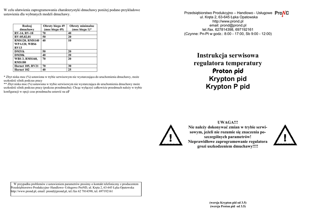 W celu ułatwienia zaprogramowania charakterystyki dmuchawy poniżej podano przykładowe ustawienia dla wybranych modeli dmuchawy. Rodzaj dmuchawy RV-14, RV-18 RV-05,02,01 RMS120, RMS140 WPA120, WBS6 RV13 DM31k DM30k WBS 3, RMS160, RMS180 Hornet 105, RV21 Hornet 102 Obroty biegu 49 (moc biegu 49) 70 50 40 Obroty minimalne (moc biegu 1)* 40 20 10 50 40 70 20 20 20 70 40 30 25 * Zbyt niska moc (%) ustawiona w trybie serwisowym nie wystarczająca do uruchomienia dmuchawy, może uszkodzić silnik podczas pracy ** Zbyt niska moc (%) ustawiona w trybie serwisowym nie wystarczająca do uruchomienia dmuchawy może uszkodzić silnik podczas pracy (podczas przedmuchu). Chcąc wyłączyć całkowicie przedmuch należy w trybie konfiguracji w opcji czas przedmuchu ustawić na oF Przedsiębiorstwo Produkcyjno – Handlowo - Usługowe ul. Kręta 2, 63-645 Łęka Opatowska http://www.prond.pl email: [email protected] tel./fax. 627814398, 697192161 (Czynne: Pn-Pt w godz.: 8:00 - 17:00, Sb 9:00 - 12:00) Instrukcja serwisowa regulatora temperatury Proton pid Krypton pid Krypton P pid UWAGA!!! Nie należy dokonywać zmian w trybie serwisowym, jeżeli nie rozumie się znaczenia poszczególnych parametrów! Nieprawidłowe zaprogramowanie regulatora grozi uszkodzeniem dmuchawy!!!! W przypadku problemów z ustawieniem parametrów prosimy o kontakt telefoniczny z producentem Przedsiębiorstwo Produkcyjno–Handlowo–Usługowe ProND, ul. Kręta 2, 63-645 Łęka Opatowska http://www.prond.pl, email: [email protected], tel./fax 62 7814398, tel. 697192161 (wersja Krypton pid od 3.5) (wersja Proton pid od 3.5) Instrukcja programowania Regulator Proton pid /Krypton pid oprócz trybu konfiguracji dostępnego dla każdego użytkownika posiada specjalny tryb, który umożliwia ustawienie parametrów serwisowych. Parametry serwisowe należy dostosować do indywidualnych wymagań: rodzaju wentylatora, rodzaju kotła, jakości paliwa, ciągu kominowego i itp.. Powrót do ustawień fabrycznych– serwisowych: – wyłączyć regulator – trzymając przycisk „+” załączyć regulator włącznikiem – na wyświetlaczu pojawi się napis dE – w momencie jak na wyświetlaczu jest napis dE należy nacisnąć przycisk „–„ – ukaże się napis FA i w tym momencie należy nacisnąć i puścić przycisk P – Przy ustawianiu biegu 49 należy tak dobrać moc (%) aby przy dalszym zwiększaniu mocy była wyczuwalna tylko nieznaczna zmiana obrotów dmuchawy wentylatora. Ustawienie parametru moc biegu 49 na „on” umożliwia podłączenie pod wyjście „dmuchawa” przekaźnika albo stycznika, dmuchawa cały czas będzie chodziła z pełną mocą. Przed podłączeniem przekaźnika lub stycznika należy skontaktować się z producentem regulatora PPHU ProND w celu modyfikacji gasika znajdującego się na wyjściu „dmuchawa” w regulatorze. Mocy biegu 50 się nie ustawia, ponieważ bieg 50 dostępny dla użytkowników odpowiada pełnemu napięciu zasilającemu z sieci (nie ma sterowania fazowego). Użytkownik ma możliwość zmniejszenia obrotów maksymalnych np. na 49, wtedy to właśnie regulator nie będzie pracował z większą mocą niż ta nastawiona w trybie serwisowym. Różnice pomiędzy dwoma trybami programowania A Tryb konfiguracji - wejście: podczas pracy regulatora przytrzymanie przez 3 sekundy przycisk P - przeznaczenie: dla użytkowników B Tryb serwisowy - wejście: z wciśniętym przyciskiem P załączyć regulator - przeznaczenie: dla kotlarzy, serwisantów, instalatorów, monterów Rys. 1. 1. Wejście do trybu serwisowego. Przy wyłączonym regulatorze nacisnąć klawisz P i trzymając go włączyć regulator. W trybie serwisowym miga lampka PRACA przemiennie z lampką: numer lampki 1 2 3 4 5 6 PILOT zakres ustawienie charakterystyki dmuchawy – moc biegu 49 obroty minimalne dmuchawy – moc biegu 1 minimalna temperatura nastawiana temperatura wyłączenia regulatora przedłużenie pracy dmuchawy, załączenie regulacji PID człon proporcjonalny KP (nie zmieniać) człon całkujący KI (nie zmieniać) 06-80%*…on 1-75%* 30-60C oF...20-50C 0-5C 10-99 10-80 ustawienia fabryczne 50% 20% 35C 30C 5C 48 21 *minimalna różnica pomiędzy mocą biegu 1 a 49 wynosi 5%, np. moc biegu 49 ustawiona na 50%, to moc biegu 1 można ustawić w zakresie od 1 do 45%, np. moc biegu 1 ustawiona na 20% to moc biegu 49 można ustawić w zakresie od 25-90% Podczas ustawiania charakterystyki wentylatora, oraz mocy wentylatora podczas przedmuchu mamy możliwość obserwacji danych obrotów wentylatora (podczas programowania), więc łatwo dobrać te parametry. 2. Wyjście z trybu serwisowego Po zaprogramowaniu parametrów serwisowych należy zapisać ustawienia przytrzymując przez 6 sekund przycisk „P”. Wyłączenie regulatora podczas programowania trybu serwisowego lub samoczynne wyjście regulatora z trybu serwisowego (po 30 sekundach od wciśnięcia ostatniego klawisza) nie powoduje zapisania wprowadzonych zmian. 3. Objaśnienie do ustawień charakterystyki dmuchawy. W zależności od rodzaju zastosowanej dmuchawy, oraz kotła na jakim będzie ona pracowała należy dobrać prędkość minimalną, oraz moc biegu 49. Obok przedstawiono dwie poglądowe charakterystyki dmuchaw. Na rysunku 1 przedstawiono charakterystykę dmuchawy dla której najlepiej jest ustawić obroty minimalne (biegu 1) na 20% a obroty biegu 49 na 70%. Dla dmuchawy, której charakterystyka przedstawiona jest na rys. 2. najlepiej obroty minimalne ustawić na 10%, a maksymalne na 40%. Regulator podczas pracy sterując dmuchawą będzie wykorzystywał tylko ten zakres od obrotów minimalnych do maksymalnych (ustawionych w parametrze WYDAJNOŚĆ DMUCHAWY). Dochodząc do temperatury zadanej będzie zwalniał od obrotów maksymalnych (parametr WYDAJNOŚĆ DMUCHAWY ustawiona w parametrach konfiguracyjnych) do obrotów minimalnych. Najlepiej obroty dmuchawy ustawić po zamontowaniu dmuchawy na piec, lub w warunkach zbliżonych. –Obroty minimalne ustaw