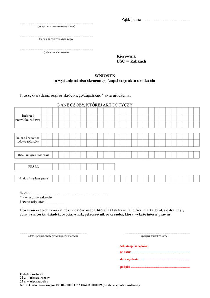 Ząbki, dnia ........................................................................................... ......................................................................................................................................... (imię i nazwisko wnioskodawcy) ......................................................................................................................................... (seria i nr dowodu osobistego) ......................................................................................................................................... (adres zameldowania) Kierownik USC w Ząbkach WNIOSEK o wydanie odpisu skróconego/zupełnego aktu urodzenia Proszę o wydanie odpisu skróconego/zupełnego* aktu urodzenia: DANE OSOBY, KTÓREJ AKT DOTYCZY Imiona i nazwisko rodowe Imiona i nazwiska rodowe rodziców Data i miejsce urodzenia PESEL Nr aktu / wydany przez W celu: ................................................................................................................................................ * - właściwe zakreślić Liczba odpisów: .................................. Uprawnieni do otrzymania dokumentów: osoba, której akt dotyczy, jej ojciec, matka, brat, siostra, mąż, żona, syn, córka, dziadek, babcia, wnuk, pełnomocnik oraz osoba, która wykaże interes prawny. .............................................................................................................................. ........................................................................................................................... (data i podpis osoby przyjmującej wniosek) (podpis wnioskodawcy) Adnotacje urzędowe: nr aktu: .............................................................................................................. data wydania: .............................................................................................. podpis: ................................................................................................................ Opłata skarbowa: 22 zł – odpis skrócony 33 zł – odpis zupełny Nr rachunku bankowego: 45 8006 0000 0013 0462 2000 0019 (tutułem: opłata skarbowa)