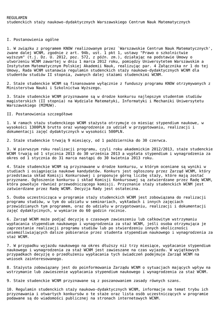 REGULAMIN studenckich staży naukowo-dydaktycznych Warszawskiego Centrum Nauk Matematycznych I. Postanowienia ogólne 1. W związku z programem KNOW realizowanym przez `Warszawskie Centrum Nauk Matematycznych', zwane dalej WCNM, zgodnie z art. 94b, ust. 1 pkt 1, ustawy "Prawo o szkolnictwie wyższym" (t.j. Dz. U. 2012, poz. 572, z późn. zm.), działając na podstawie Umowy o utworzeniu WCNM zawartej w dniu 1 marca 2012 roku, pomiędzy Uniwersytetem Warszawskim a Instytutem Matematycznym Polskiej Akademii Nauk, realizując par. 4 Załącznika nr 1 do tej Umowy, Rada WCNM ustanawia regulamin studenckich staży naukowo-dydaktycznych WCNM dla studentów studiów II stopnia, zwanych dalej stażami studenckimi WCNM. 2. Staże studenckie WCNM są finansowane wyłącznie z funduszy programu KNOW otrzymywanych z Ministerstwa Nauki i Szkolnictwa Wyższego. 3. Staże studenckie WCNM przyznawane są w drodze konkursu najlepszym studentom studiów magisterskich (II stopnia) na Wydziale Matematyki, Informatyki i Mechaniki Uniwersytetu Warszawskiego (MIMUW). II. Postanowienia szczegółowe 1. W ramach stażu studenckiego WCNM stażysta otrzymuje co miesiąc stypendium naukowe, w wysokości 1300PLN brutto oraz wynagrodzenie za udział w przygotowaniu, realizacji i dokumentacji zajęć dydaktycznych w wysokości 500PLN. 2. Staże studenckie trwają 9 miesięcy, od 1 października do 30 czerwca. 3. W pierwszym roku realizacji programu, czyli roku akademickim 2012/2013, staże studenckie WCNM trwają od 1 stycznia 2013 do 30 września 2013 a wypłata stypendium i wynagrodzenia za okres od 1 stycznia do 31 marca nastąpi do 30 kwietnia 2013 roku. 4. Staże studenckie WCNM są przyznawane w drodze konkursu, w którym oceniane są wyniki w studiach i osiągnięcia naukowe kandydatów. Konkurs jest ogłoszony przez Zarząd WCNM, który przedstawia skład Komisji Konkursowej i proponuje górną liczbę staży, które mają zostać przyznane. Ogłoszenie konkursu i skład Komisji Konkursowej są zatwierdzane przez Radę WCNM, która powołuje również przewodniczącego komisji. Przyznanie staży studenckich WCNM jest zatwierdzane przez Radę WCNM. Decyzja Rady jest ostateczna. 5. Osoba uczestnicząca w programie programu studiów, w tym do udziału przewidzianych tym programem, oraz zajęć dydaktycznych, w wymiarze do staży studenckich WCNM jest zobowiązana do realizacji w seminariach, wykładach i innych zajęciach do udziału w przygotowaniu, realizacji i dokumentacji 60 godzin rocznie. 6. Zarząd WCNM może podjąć decyzję o czasowym zawieszeniu lub całkowitym wstrzymaniu wypłacania stypendium naukowego i wynagrodzenia za staż WCNM, jeśli osoba otrzymująca je zaprzestanie realizacji programu studiów lub po stwierdzeniu innych okoliczności uniemożliwiających dalsze pobieranie przez studenta stypendium naukowego i wynagrodzenia za staż WCNM. 7. W przypadku wyjazdu naukowego na okres dłuższy niż trzy miesiące, wypłacanie stypendium naukowego i wynagrodzenia za staż WCNM jest zawieszane na czas wyjazdu. W wyjątkowych przypadkach decyzję o przedłużeniu wypłacania tych świadczeń podejmuje Zarząd WCNM na wniosek zainteresowanego. 8. Stażysta zobowiązany jest do poinformowania Zarządu WCNM o sytuacjach mających wpływ na wstrzymanie lub zawieszenie wypłacania stypendium naukowego i wynagrodzenia za staż WCNM. 9. Staże studenckie WCNM przyznawane są z poszanowaniem zasady równych szans. 10. Regulamin studenckich staży naukowo-dydaktycznych WCNM, informacje na temat trybu ich przyznawania i otwartych konkursów o te staże oraz lista osób uczestniczących w programie podawane są do wiadomości publicznej na stronach internetowych WCNM. 11. Regulamin studenckich staży naukowo-dydaktycznych WCNM wchodzi w życie z dniem zatwierdzenia przez Radę WCNM, z mocą obowiązującą od 1 stycznia 2013.
