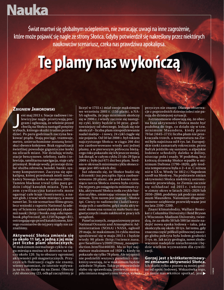 Nauka Świat martwi się globalnym ociepleniem, nie zwracając uwagi na inne zagrożenie, które może pojawić się nagle ze strony Słońca. Gdyby potwierdził się nakreślony przez niektórych naukowców scenariusz, czeka nas prawdziwa apokalipsa. Te plamy nas wykończą J est maj 2013 r. Stacje radiowe i telewizyjne nagle przerywają program i ogłaszają, że właśnie przed chwilą na Słońcu nastąpił potężny wybuch, którego skutki trudno przewidzieć. Po paru godzinach zaczyna brakować prądu. Stają pociągi, tramwaje, metro, unieruchomione zostaną lotniska i dworce kolejowe. Brak sygnalizacji świetlnej powoduje gigantyczne korki na ulicach miast. Nie działają windy, stacje benzynowe, telefony, radio i telewizja, satelitarna nawigacja, staje cały przemysł. Brakuje wody, przestaje działać służba zdrowia, handel, banki, systemy komputerowe. Zaczyna się apokalipsa, której przedsmak mieli mieszkańcy Nowego Jorku w sierpniu 2003 r. Tamten blackout trwał tylko parę godzin i objął kawałek miasta. Tym razem cy w ilizacy jna katastrofa może ogarnąć całe kraje i kontynenty, a nawet glob, i trwać wiele miesięcy, a może nawet lat. To nie scenariusz filmu grozy, lecz wnioski z raportu National Academy of Sciences (amerykańskiej akademii nauk) (http://books.nap.edu/openbook.php?record_id=12507&page=R1), ostrzegającego przed kataklizmem, którego rozmiarów do tej pory nigdy nie zaznaliśmy. Aktywność Słońca zmienia się co około 11 lat, a jedną z jej miar jest liczba plam słonecznych. W maksimum normalnego cyklu w ciągu miesiąca można ich dostrzec na tarczy około 120. Są to obszary ogromnej aktywności pól magnetycznych. Przyczyn ich f luktuacji ciągle nie znamy, wiemy natomiast, że istotnie wpływają na to, co dzieje się na Ziemi. Obecny cykl słoneczny (23, odkąd zaczęliśmy je liczyć w 1755 r.) miał swoje maksimum we wrześniu 2001 r. (150 plam), a NASA ogłosiła, że jego minimum skończy się w 2006 r. i wtedy zacznie się następny cykl, który będzie o 50 proc. gwałtowniejszy od obecnego. Jednak się nie skończył – liczba plam niespodziewanie nadal maleje – i nowy, 24 cykl ciągle się nie pojawia. Od 50 lat 2008 r. był rokiem najczystszego Słońca: w ciągu 266 dni nie zaobserwowano wtedy ani jednej plamy, a w pierwszym półroczu bieżącego roku pokazało się ich jeszcze mniej. Jak dotąd, w całym cyklu 23 (do 29 lipca 2009 r.) było już 671 dni bez plam. Średnio w okresach minimum cyklu słonecznego jest 485 takich dni. Już zdawało się, że Słońce budzi się z drzemki (na początku lipca zaobserwowano 20 plam), ale pod koniec miesiąca tarcza Słońca znowu była czysta. Do tej pory, po osiągnięciu minimum cyklu, aktywność Słońca rosła zwykle bardzo szybko, zmierzając stromo ku maksimum. Tym razem jest inaczej – Słońce śpi. Cieszy to radiowców i ludzi korzystających z satelitów, gdyż mała aktywność słoneczna oznacza mało burz magnetycznych i mało zakłóceń w pracy ich urządzeń. Panel uczonych, zorganizowany przez National Oceanic and Atmospheric Administration (NOA A) i NASA, ogłosił 29 maja, że maksimum 24 cyklu można spodziewać się w maju 2013 r. i będzie w tedy 90 plam (http://science.nasa. gov/headlines/y2009/29may_noaaprediction.htm?list46030). Ma to być najsłabsze maksimum od 1928 r., kiedy to pokazało się tylko 78 plam. Ale tej opinii nie podzielili wszyscy paneliści – niektórzy uważają, że w maksimum będzie zaledwie 70 plam. Takie przepowiednie słabo się sprawdzają, ponieważ nastąpiła zmiana magnetyzmu Słońca, której p ol i t y k a nr 33 (2718), 15 sierpnia 2009 przyczyn nie znamy. Dlatego obserwacje z poprzednich dziesięcioleci nie pasują do dzisiejszej sytuacji. Astronomowie obawiają się, że obecna faza akty wności Słońca może być podobna do tego, co działo się w tzw. m i n i mu m Mau nder a, k iedy pr z ez 70 lat (1645–1715) liczba plam nie przekraczała trzech, a temperatura na Ziemi była najniższa od 8 tys. lat. Europejskie rzeki zamarzały rokrocznie, przez Bałtyk jeździło się saniami, a alpejskie lodowce schodził y da leko w doliny, niszcząc pola i osady. W podobną, lecz krótszą drzemkę Słońce wpadło w minimum Daltona (1790–1820), gdy średnia temperatura była o 2–4 st. C niższa niż w XX w. Wtedy (w 1812 r.) Napoleon szedł na Moskwę. Na podstawie zmian aktywności Słońca niektórzy astronomowie przewidują, że Ziemia zacznie się och ład zać od 2015 r. i wk rocz y w zimny okres w latach 2021–2026 lub 2050–2060, podobny jak podczas minimum Maundera. Natomiast długoterminowe oziębienie przewidywane jest na lata 2100–2200. Znani klimatolodzy, Wallace Broecker z Columbia University i Reid Bryson z Wisconsin-Madison University, twierdzą, że za około 50 lub 500 lat może nadejść nowa epoka lodowa – taka, jaka skończyła się około 10 tys. lat temu, gdy znaczna część półkuli północnej naszego globu pokryta była lodem grubości 3 tys. m. Jak uczy geologia, nowe zlodowacenie nadejdzie nieuchronnie i będzie wielkim w yzwaniem dla cy wilizacji. Gorzej jest z krótkoterminowymi zmianami aktywności Słońca. Ich skutki tylko z pozoru są mniej groźne od epoki lodowej. Wskazówką tego, co może nas wkrótce spotkać, jest © nasa Zbigniew Jaworowski 59 Nauka tzw. rozbłysk Carringtona z 1859 r. Wtedy minimum poprzed zające 10 cykl słoneczny miało 654 dni bez plam, a więc mniej niż w obecnym cyklu. 1 września 1859 r. brytyjski astronom Richard Carrington zaobserwował w nowej wielkiej grupie plam (10 razy większej od średnicy Ziemi) ogromny rozbłysk białego światła, trwający około 60 sekund. Kilka minut później tsunami wysokoenergetycznych protonów słonecznych dotarło do Ziemi i zostawiło trwały ślad w rdzeniach lodowych (jako ogromny wzrost azotanów), najsilniejszy od 450 lat, kilkakrotnie większy niż cywilizacja. Skutki tamtego słonecznego impulsu magnetyc