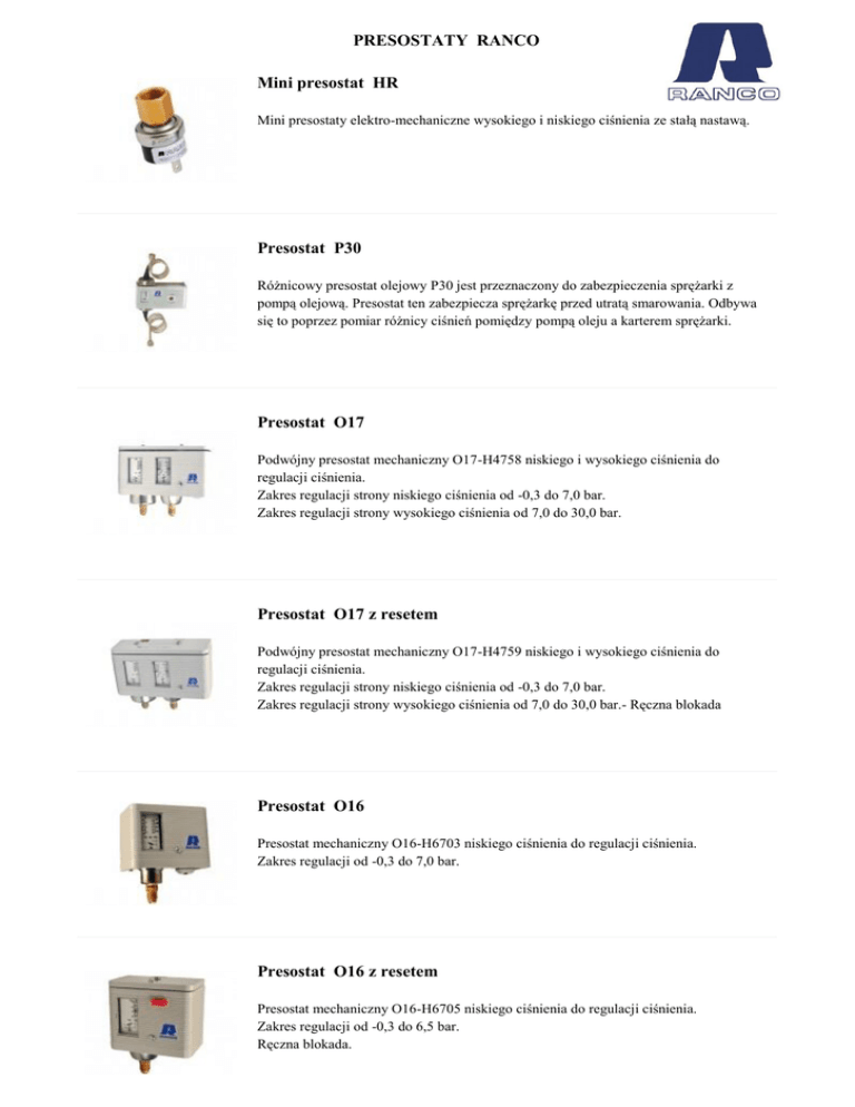 PRESOSTATY RANCO Mini presostat HR Mini presostaty elektro-mechaniczne wysokiego i niskiego ciśnienia ze stałą nastawą. Presostat P30 Różnicowy presostat olejowy P30 jest przeznaczony do zabezpieczenia sprężarki z pompą olejową. Presostat ten zabezpiecza sprężarkę przed utratą smarowania. Odbywa się to poprzez pomiar różnicy ciśnień pomiędzy pompą oleju a karterem sprężarki. Presostat O17 Podwójny presostat mechaniczny O17-H4758 niskiego i wysokiego ciśnienia do regulacji ciśnienia. Zakres regulacji strony niskiego ciśnienia od -0,3 do 7,0 bar. Zakres regulacji strony wysokiego ciśnienia od 7,0 do 30,0 bar. Presostat O17 z resetem Podwójny presostat mechaniczny O17-H4759 niskiego i wysokiego ciśnienia do regulacji ciśnienia. Zakres regulacji strony niskiego ciśnienia od -0,3 do 7,0 bar. Zakres regulacji strony wysokiego ciśnienia od 7,0 do 30,0 bar.- Ręczna blokada Presostat O16 Presostat mechaniczny O16-H6703 niskiego ciśnienia do regulacji ciśnienia. Zakres regulacji od -0,3 do 7,0 bar. Presostat O16 z resetem Presostat mechaniczny O16-H6705 niskiego ciśnienia do regulacji ciśnienia. Zakres regulacji od -0,3 do 6,5 bar. Ręczna blokada. Presostat O16 Presostat mechaniczny O16-H6750 wysokiego ciśnienia do regulacji ciśnienia. Zakres regulacji od 7,0 do 30,0 bar. Presostat O16 z resetem Presostat mechaniczny O16-H6751 wysokiego ciśnienia do regulacji ciśnienia. Zakres regulacji od 7,0 do 30,0 bar. Ręczna blokada. Mini presostat G Presostaty Miniline niskiego i wysokiego ciśnienia ze stałą nastawą.