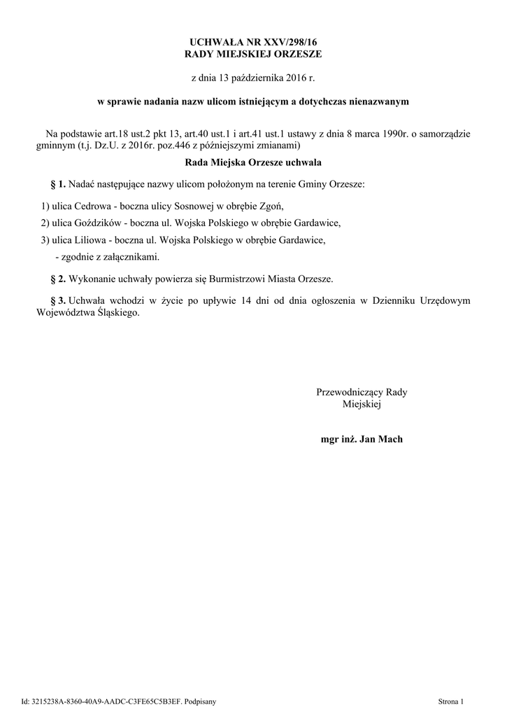 UCHWAŁA NR XXV/298/16 RADY MIEJSKIEJ ORZESZE z dnia 13 października 2016 r. w sprawie nadania nazw ulicom istniejącym a dotychczas nienazwanym Na podstawie art.18 ust.2 pkt 13, art.40 ust.1 i art.41 ust.1 ustawy z dnia 8 marca 1990r. o samorządzie gminnym (t.j. Dz.U. z 2016r. poz.446 z późniejszymi zmianami) Rada Miejska Orzesze uchwala § 1. Nadać następujące nazwy ulicom położonym na terenie Gminy Orzesze: 1) ulica Cedrowa - boczna ulicy Sosnowej w obrębie Zgoń, 2) ulica Goździków - boczna ul. Wojska Polskiego w obrębie Gardawice, 3) ulica Liliowa - boczna ul. Wojska Polskiego w obrębie Gardawice, - zgodnie z załącznikami. § 2. Wykonanie uchwały powierza się Burmistrzowi Miasta Orzesze. § 3. Uchwała wchodzi w życie po upływie 14 dni od dnia ogłoszenia w Dzienniku Urzędowym Województwa Śląskiego. Przewodniczący Rady Miejskiej mgr inż. Jan Mach Id: 3215238A-8360-40A9-AADC-C3FE65C5B3EF. Podpisany Strona 1 Załącznik dot. ulicy Cedrowej Id: 3215238A-8360-40A9-AADC-C3FE65C5B3EF. Podpisany Strona 2 Załącznik dot. ulicy Goździków Id: 3215238A-8360-40A9-AADC-C3FE65C5B3EF. Podpisany Strona 3 Załącznik dot. ulicy Liliowej Id: 3215238A-8360-40A9-AADC-C3FE65C5B3EF. Podpisany Strona 4