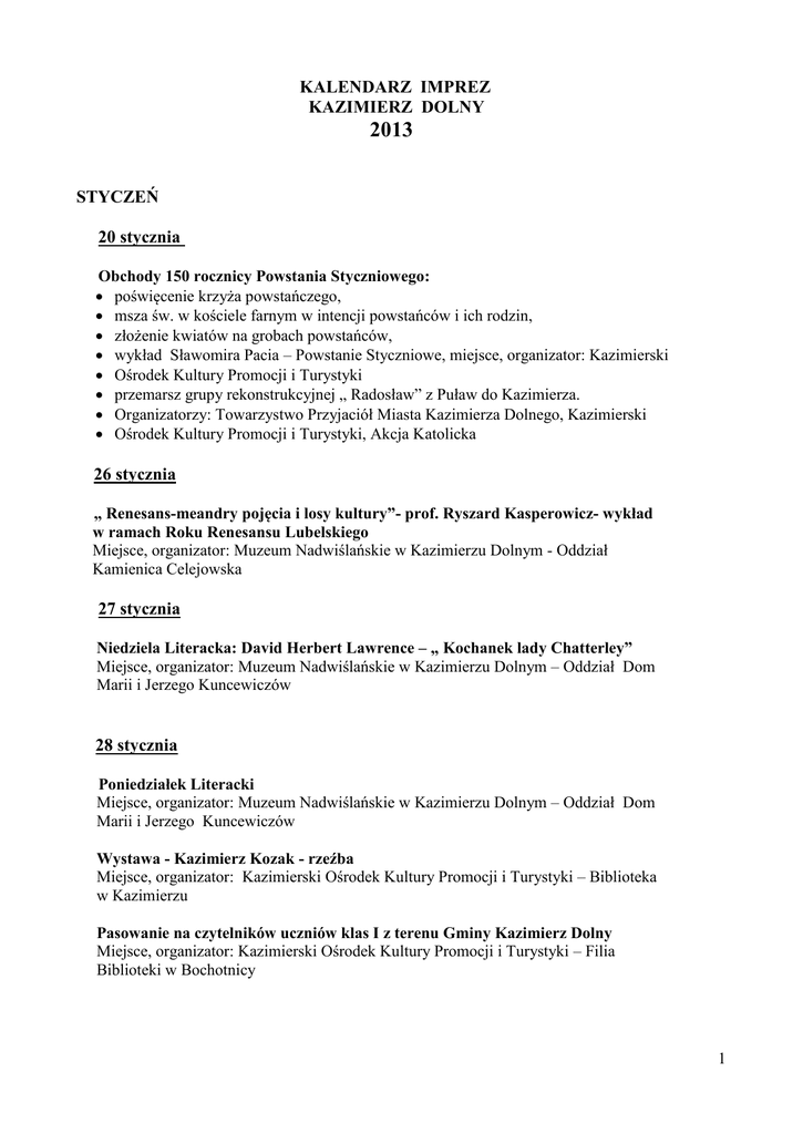 KALENDARZ IMPREZ KAZIMIERZ DOLNY 2013 STYCZEŃ 20 stycznia Obchody 150 rocznicy Powstania Styczniowego: poświęcenie krzyża powstańczego, msza św. w kościele farnym w intencji powstańców i ich rodzin, złożenie kwiatów na grobach powstańców, wykład Sławomira Pacia – Powstanie Styczniowe, miejsce, organizator: Kazimierski Ośrodek Kultury Promocji i Turystyki przemarsz grupy rekonstrukcyjnej „ Radosław” z Puław do Kazimierza. Organizatorzy: Towarzystwo Przyjaciół Miasta Kazimierza Dolnego, Kazimierski Ośrodek Kultury Promocji i Turystyki, Akcja Katolicka 26 stycznia „ Renesans-meandry pojęcia i losy kultury”- prof. Ryszard Kasperowicz- wykład w ramach Roku Renesansu Lubelskiego Miejsce, organizator: Muzeum Nadwiślańskie w Kazimierzu Dolnym - Oddział Kamienica Celejowska 27 stycznia Niedziela Literacka: David Herbert Lawrence – „ Kochanek lady Chatterley” Miejsce, organizator: Muzeum Nadwiślańskie w Kazimierzu Dolnym – Oddział Dom Marii i Jerzego Kuncewiczów 28 stycznia Poniedziałek Literacki Miejsce, organizator: Muzeum Nadwiślańskie w Kazimierzu Dolnym – Oddział Dom Marii i Jerzego Kuncewiczów Wystawa - Kazimierz Kozak - rzeźba Miejsce, organizator: Kazimierski Ośrodek Kultury Promocji i Turystyki – Biblioteka w Kazimierzu Pasowanie na czytelników uczniów klas I z terenu Gminy Kazimierz Dolny Miejsce, organizator: Kazimierski Ośrodek Kultury Promocji i Turystyki – Filia Biblioteki w Bochotnicy 1 LUTY 4 lutego Wernisaż wystawy pt. Jan Józef Szczepański- życie i dzieło, cz. I ( do 31 marca) Miejsce, organizator: Muzeum Nadwiślańskie w Kazimierzu Dolnym – Oddział Dom Marii i Jerzego Kuncewiczów 11-24 lutego Ferie w Kazimierskim Ośrodku Kultury Promocji i Turystyki Miejsce, organizator: Kazimierski Ośrodek Kultury Promocji i Turystyki, Biblioteka w Kazimierzu, Filia Biblioteki w Bochotnicy 23 lutego „Osadnicza, społeczna i gospodarcza specyfika Lubeskiego w końcu średniowiecza i początkach epoki nowożytnej ” – dr hab. Jacek Chachaj – wykład w ramach Roku Renesansu Lubelskiego Miejsce, organizator: Muzeum Nadwiślańskie w Kazimierzu Dolnym - Oddział Kamienica Celejowska 24 lutego Niedziela Literacka: Vladimir Nabokov – „ Lolita” Miejsce, organizator: Muzeum Nadwiślańskie w Kazimierzu Dolnym- Oddział Dom Marii i Jerzego Kuncewiczów 25 lutego Poniedziałek Literacki Miejsce, organizator: Muzeum Nadwiślańskie w Kazimierzu Dolnym – Oddział Dom Marii i Jerzego Kuncewiczów Doroczne spotkanie Klubu Twórców Ludowych Miejsce, organizator: Kazimierski Ośrodek Kultury Promocji i Turystyki MARZEC 8 marca „ 126 kobiet z fabryki bawełny” - program artystyczny Miejsce, organizator: Muzeum Nadwiślańskie w Kazimierzu Dolnym – Oddział Dom Marii i Jerzego Kuncewiczów 8-10 marca Kazimierz bywa kobietą – cykl imprez Organizator: Kazimierski Ośrodek Kultury Promocji i Turystyki 2 10 marca Promocja nowego numeru kwartalnika „ Klematis” Miejsce, organizator: Muzeum Nadwiślańskie w Kazimierzu Dolnym- Oddział Dom Marii i Jerzego Kuncewiczów Wystawa- Dariusz Jaskólski – malarstwo Miejsce, organizator: Kazimierski Ośrodek Kultury Promocji i Turystyki – Biblioteka w Kazimierzu Kiermasz Wielkanocny Miejsce, organizator: Kazimierski Ośrodek Kultury Promocji i Turystyki 16 lub 17 marca Rajd młodzieży szkolnej szlakiem powstańczym ( obchody 150 rocznicy Powstania Styczniowego) Organizatorzy: Anna Soria, Marcin Pisula 23 marca „ Jan Wolff – architektura między Wisłą a Bugiem w 1 poł. XVII w.”dr Michał Kurzej- wykład w ramach Roku Renesansu Lubelskiego Miejsce, organizator: Muzeum Nadwiślańskie w Kazimierzu Dolnym – Oddział Kamienica Celejowska 25 marca Poniedziałek Literacki Miejsce, organizator: Muzeum Nadwiślańskie w Kazimierzu Dolnym – Oddział Dom Marii i Jerzego Kuncewiczów 31 marca Niedziela Literacka: Carlos Fuentes „Śmierć Artemia Cruz” Miejsce, organizator: Muzeum Nadwiślańskie w Kazimierzu Dolnym – Oddział Dom Marii i Jerzego Kuncewiczów Koncert pieśni powstańczej w kazimierskiej Farze Organizator: Towarzystwo Przyjaciół Miasta Kazimierza Dolnego Otwarcie wystawy czasowej: Stanisław Magierski – fotografia Kazimierza lat 30 XX w. ( do 10 kwietnia) Miejsce, organizator: Muzeum Nadwiślańskie w Kazimierzu Dolnym – Oddział Kamienica Celejowska 3 KWIECIEŃ 2 kwietnia Wernisaż wystawy pt. Jan Józef Szczepański- życie i dzieło, cz. II ( do 30 czerwca) Miejsce, organizator: Muzeum Nadwiślańskie w Kazimierzu Dolnym – Oddział Dom Marii i Jerzego Kuncewiczów 14 kwietnia Otwarcie wystawy czasowej: Fotografia Ludwika Gronowskiego ( do 31 maja) Miejsce, organizator: Muzeum Nadwiślańskie w Kazimierzu Dolnym – Oddział Kamienica Celejowska 20 kwietnia XXIV Rajd Pieszy Adalbertowy dla młodzieży szkolnej Organizator: Polskie Towarzystwo Turystyczno-Krajoznawcze Oddział w Kazimierzu Dolnym 21 kwietnia Warsztaty Sztuki Ludowej Miejsce: Rynek Organizator: Kazimierski Ośrodek Kultury Promocji i Turystyki 23 kwietnia Obchody Światowego Dnia Książki i Praw Autorskich Organizator: Kazimierski Ośrodek Kultury Promocji i Turystyki – Biblioteka w Kazimierzu 27 kwietnia Slow Art. Day/ Dzień Wolnej Sztuki Miejsce, organizator: Muzeum Nadwiślańskie w Kazimierzu Dolnym ( wszystkie oddziały) „ Mit renesansu lubelskiego”- dr Kinga Blaschke- wykład w ramach Roku Renesansu Lubelskiego Miejsce, organizator: Muzeum Nadwiślańskie w Kazimierzu Dolnym – Oddział Kamienica Celejowska 28 kwietnia Dzień Ziemi: rozstrzygnięcie konkursu „ Życie rzeki” oraz otwarcie wystawy fotografii pokonkursowych Miejsce, organizator: Muzeum Nadwiślańskie w Kazimierzu Dolnym – Oddział Muzeum Przyrodnicze 4 28 kwietnia Niedziela Literacka: Truman Capote, „ Śniadanie u Tiffany´ego Miejsce, organizator: Muzeum Nadwiślańskie w Kazimierzu Dolnym – Oddział Dom Marii i Jerzego Kuncewiczów 29 kwietnia Poniedziałek Literacki Miejsce, organi