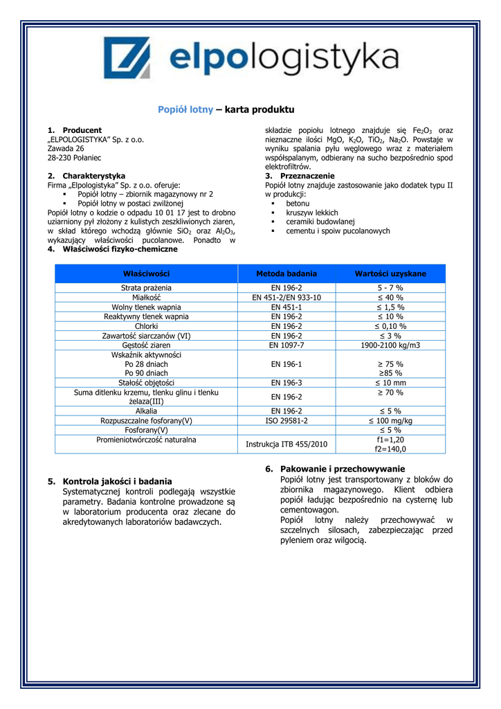 Popiół lotny – karta produktu 1. Producent „ELPOLOGISTYKA” Sp. z o.o. Zawada 26 28-230 Połaniec 2. Charakterystyka Firma „Elpologistyka” Sp. z o.o. oferuje: Popiół lotny – zbiornik magazynowy nr 2 Popiół lotny w postaci zwilżonej Popiół lotny o kodzie o odpadu 10 01 17 jest to drobno uziarniony pył złożony z kulistych zeszkliwionych ziaren, w skład którego wchodzą głównie SiO2 oraz Al2O3, wykazujący właściwości pucolanowe. Ponadto w 4. Właściwości fizyko-chemiczne składzie popiołu lotnego znajduje się Fe2O3 oraz nieznaczne ilości MgO, K2O, TiO2, Na2O. Powstaje w wyniku spalania pyłu węglowego wraz z materiałem współspalanym, odbierany na sucho bezpośrednio spod elektrofiltrów. 3. Przeznaczenie Popiół lotny znajduje zastosowanie jako dodatek typu II w produkcji: betonu kruszyw lekkich ceramiki budowlanej cementu i spoiw pucolanowych Właściwości Metoda badania Wartości uzyskane Strata prażenia Miałkość Wolny tlenek wapnia Reaktywny tlenek wapnia Chlorki Zawartość siarczanów (VI) Gęstość ziaren Wskaźnik aktywności Po 28 dniach Po 90 dniach Stałość objętości Suma ditlenku krzemu, tlenku glinu i tlenku żelaza(III) Alkalia Rozpuszczalne fosforany(V) Fosforany(V) Promieniotwórczość naturalna EN 196-2 EN 451-2/EN 933-10 EN 451-1 EN 196-2 EN 196-2 EN 196-2 EN 1097-7 5-7% ≤ 40 % ≤ 1,5 % ≤ 10 % ≤ 0,10 % ≤3% 1900-2100 kg/m3 EN 196-1 ≥ 75 % ≥85 % ≤ 10 mm ≥ 70 % 5. Kontrola jakości i badania Systematycznej kontroli podlegają wszystkie parametry. Badania kontrolne prowadzone są w laboratorium producenta oraz zlecane do akredytowanych laboratoriów badawczych. EN 196-3 EN 196-2 EN 196-2 ISO 29581-2 Instrukcja ITB 455/2010 ≤5% ≤ 100 mg/kg ≤5% f1=1,20 f2=140,0 6. Pakowanie i przechowywanie Popiół lotny jest transportowany z bloków do zbiornika magazynowego. Klient odbiera popiół ładując bezpośrednio na cysternę lub cementowagon. Popiół lotny należy przechowywać w szczelnych silosach, zabezpieczając przed pyleniem oraz wilgocią.