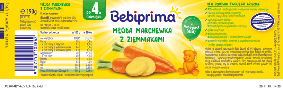 PL1014 Najlepiej spożyć przed: data na wieczku Przecier warzywny Składniki: warzywa 80% (marchew 60%, ziemniaki 20%), woda, olej rzepakowy 1%. NIE ZAWIERA GLUTENU. Wskazówka: może zestalać stolce. Wartość odżywcza w 100 g 4. po miesiącu w 190 g energia kJ/kcal 167/40 316/76 tłuszcz 1,0 g 1,9 g - w tym kwasy tł. nasycone 0,1 g 0,2 g - w tym kwasy tł. jednonienasycone 0,6 g 1,1 g - w tym kwasy tł. wielonienasycone 0,3 g 0,6 g węglowodany 5,8 g 11,0 g - w tym cukry 3,0 g 5,7 g błonnik 2,2 g 4,2 g białko 0,8 g 1,5 g sól* 0,08 g 0,15 g sód 0,03 g 0,06 g kwas alfa-linolenowy (Omega-3) 0,06 g 0,11 g *zawartość soli wynika wyłącznie z obecności naturalnie występującego sodu PL1014ET-A_V1_1-15g.indd 1 DLA ZDROWIA TWOJEGO DZIECKA: MŁODA MARCHEWKA Z ZIEMNIAKAMI BEZ dodatku soli – aby Twoje dziecko mogło poznać naturalny smak warzyw kwas alfa-linolenowy (ALA) z grupy Omega-3 – starannie ważny dla rozwoju mózgu i komórek nerwowych składniki wyselekcjonowane wyselekcjonowane składniki – O KONTROLOWANE OW SUR prosty skład, nie zawiera glutenu, od sprawdzonych BEZ dodatku produktów pochodzenia mlecznego dostawców gładka konsystencja BEZ dodatku aromatów, BEZ dodatku barwników* i substancji konserwujących* BEZ dodatku zagęstników – wymieszaj w przypadku rozwarstwienia *zgodnie z przepisami prawa Idealny na początek rozszerzania diety. Zacznij od 4-6 łyżeczek i stopniowo zwiększaj tę ilość. Starszym niemowlętom podawaj jako dodatek do posiłku. Potrzebną porcję przełożoną do miseczki podgrzej w kąpieli wodnej lub w kuchence mikrofalowej**, wymieszaj i sprawdź temperaturę. Słoiczek z pozostałą, niepodgrzaną porcją przechowuj zamknięty w lodówce i zużyj następnego dnia. Nie używaj metalowej łyżeczki, aby nie uszkodzić słoiczka. Przed użyciem sprawdź, czy słoiczek nie został naruszony. Zadbaj o zrównoważoną dietę oraz zdrowy tryb życia swojego dziecka. **postępuj zgodnie z zaleceniami producenta Producent: Bebivita GmbH, 85276 Reisgang, Niemcy Dystrybutor: HiPP Polska Sp. z o.o., ul. Puławska 303, 02-785 Warszawa, bebiprima.pl PL1014 PL1014ET-A 09_0886EM V1 1/15-g 190g MŁODA Z ZIEMNIMARCHEWKA AKAMI 20.11.15 14:25