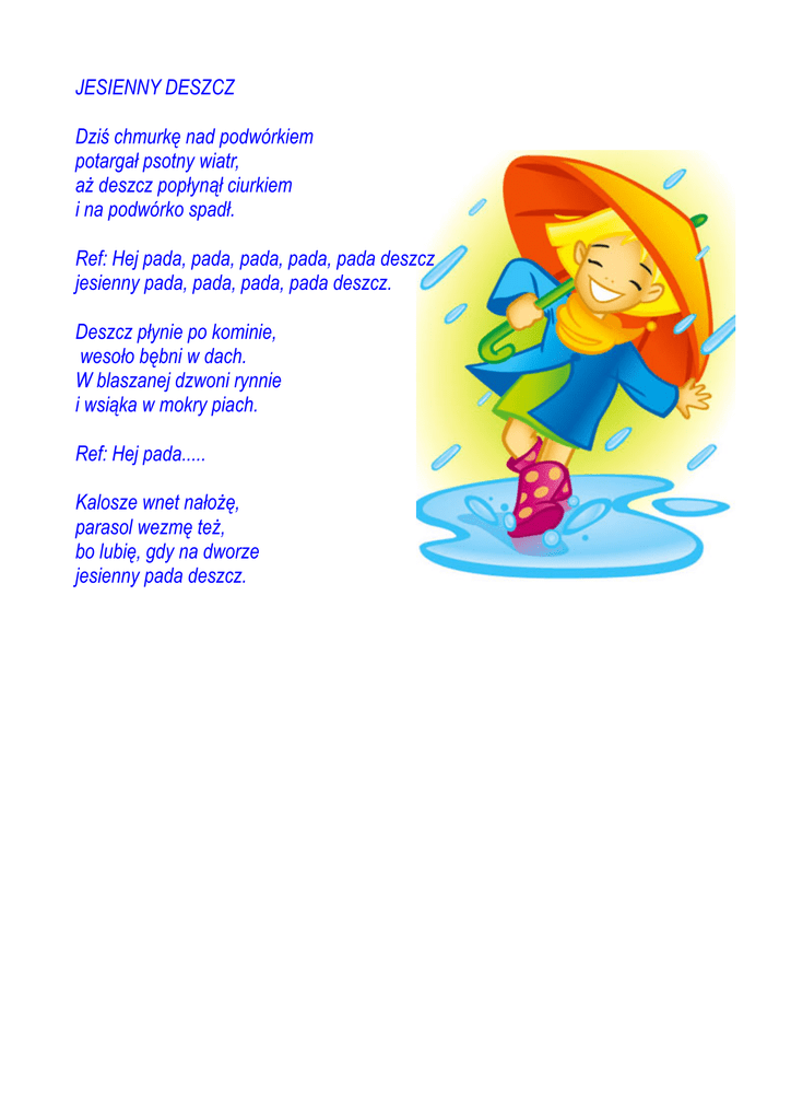 JESIENNY DESZCZ Dziś chmurkę nad podwórkiem potargał psotny wiatr, aż deszcz popłynął ciurkiem i na podwórko spadł. Ref: Hej pada, pada, pada, pada, pada deszcz jesienny pada, pada, pada, pada deszcz. Deszcz płynie po kominie, wesoło bębni w dach. W blaszanej dzwoni rynnie i wsiąka w mokry piach. Ref: Hej pada..... Kalosze wnet nałożę, parasol wezmę też, bo lubię, gdy na dworze jesienny pada deszcz.