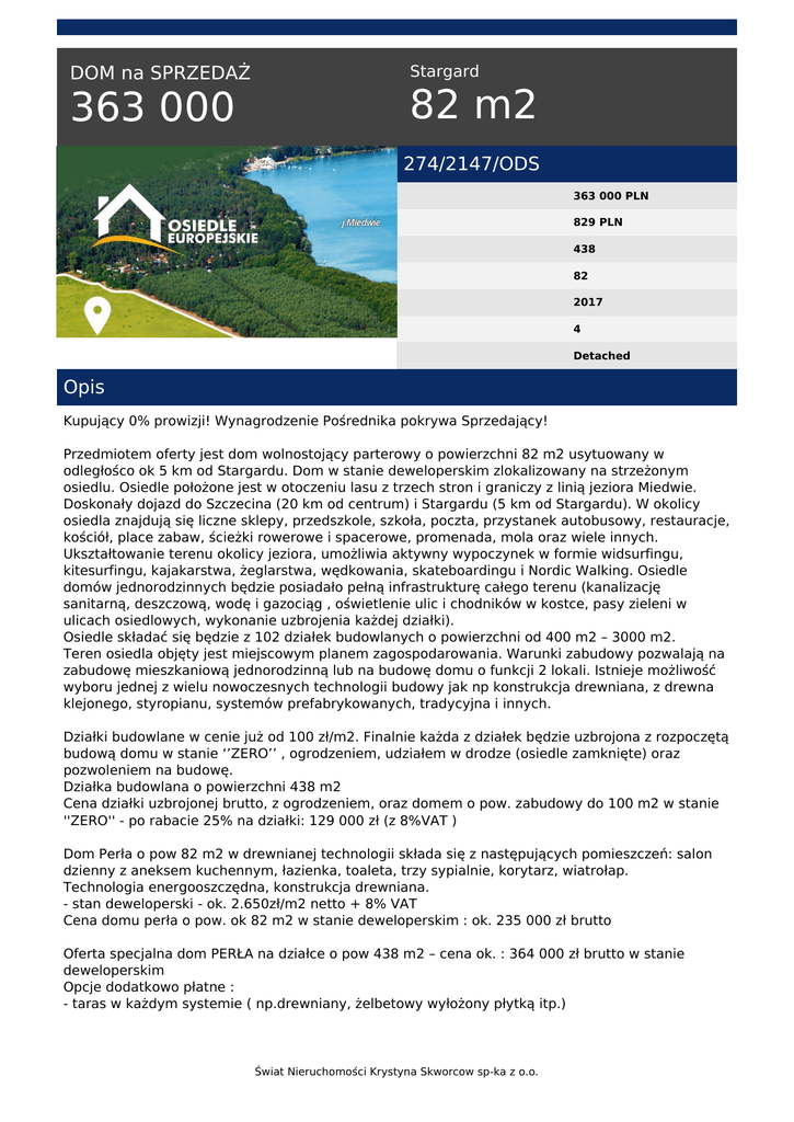 DOM na SPRZEDAŻ 363 000 Stargard 82 m2 274/2147/ODS 363 000 PLN 829 PLN 438 82 2017 4 Detached Opis Kupujący 0% prowizji! Wynagrodzenie Pośrednika pokrywa Sprzedający! Przedmiotem oferty jest dom wolnostojący parterowy o powierzchni 82 m2 usytuowany w odległośco ok 5 km od Stargardu. Dom w stanie deweloperskim zlokalizowany na strzeżonym osiedlu. Osiedle położone jest w otoczeniu lasu z trzech stron i graniczy z linią jeziora Miedwie. Doskonały dojazd do Szczecina (20 km od centrum) i Stargardu (5 km od Stargardu). W okolicy osiedla znajdują się liczne sklepy, przedszkole, szkoła, poczta, przystanek autobusowy, restauracje, kościół, place zabaw, ścieżki rowerowe i spacerowe, promenada, mola oraz wiele innych. Ukształtowanie terenu okolicy jeziora, umożliwia aktywny wypoczynek w formie widsurfingu, kitesurfingu, kajakarstwa, żeglarstwa, wędkowania, skateboardingu i Nordic Walking. Osiedle domów jednorodzinnych będzie posiadało pełną infrastrukturę całego terenu (kanalizację sanitarną, deszczową, wodę i gazociąg , oświetlenie ulic i chodników w kostce, pasy zieleni w ulicach osiedlowych, wykonanie uzbrojenia każdej działki). Osiedle składać się będzie z 102 działek budowlanych o powierzchni od 400 m2 – 3000 m2. Teren osiedla objęty jest miejscowym planem zagospodarowania. Warunki zabudowy pozwalają na zabudowę mieszkaniową jednorodzinną lub na budowę domu o funkcji 2 lokali. Istnieje możliwość wyboru jednej z wielu nowoczesnych technologii budowy jak np konstrukcja drewniana, z drewna klejonego, styropianu, systemów prefabrykowanych, tradycyjna i innych. Działki budowlane w cenie już od 100 zł/m2. Finalnie każda z działek będzie uzbrojona z rozpoczętą budową domu w stanie ‘’ZERO’’ , ogrodzeniem, udziałem w drodze (osiedle zamknięte) oraz pozwoleniem na budowę. Działka budowlana o powierzchni 438 m2 Cena działki uzbrojonej brutto, z ogrodzeniem, oraz domem o pow. zabudowy do 100 m2 w stanie ''ZERO'' - po rabacie 25% na działki: 129 000 zł (z 8%VAT ) Dom Perła o pow 82 m2 w drewnianej technologii składa się z następujących pomieszczeń: salon dzienny z aneksem kuchennym, łazienka, toaleta, trzy sypialnie, korytarz, wiatrołap. Technologia energooszczędna, konstrukcja drewniana. - stan deweloperski - ok. 2.650zł/m2 netto + 8% VAT Cena domu perła o pow. ok 82 m2 w stanie deweloperskim : ok. 235 000 zł brutto Oferta specjalna dom PERŁA na działce o pow 438 m2 – cena ok. : 364 000 zł brutto w stanie deweloperskim Opcje dodatkowo płatne : - taras w każdym systemie ( np.drewniany, żelbetowy wyłożony płytką itp.) Świat Nieruchomości Krystyna Skworcow sp-ka z o.o. - wiata, garaż Powyższa oferta ma charakter informacyjny i nie stanowi oferty handlowej w rozumieniu art. 66 §1 kodeksu cywilnego oraz innych właściwych przepisów prawnych. Treść ma charakter informacyjny i zalecamy jej osobistą weryfikację. Kontaktując się z biurem Klient wyraża zgodę na przetwarzanie danych osobowych zgodnie z przepisami ustawy z dnia 29 sierpnia 1997 roku o ochronie danych osobowych / Dz.U.Nr. 133 poz. 883/. Klientowi przysługuje prawo do wglądu do swoich danych osobowych i ich aktualizacji. Kierując się zasadami Kodeksu etyki zawodowej oraz Standardami zawodowymi pośredników w obrocie nieruchomościami, zapewniamy pośrednictwo w obrocie nieruchomościami - kupno, sprzedaż oraz wynajem - we współpracy z profesjonalnymi, licencjonowanymi i wyselekcjonowanymi biurami nieruchomości działającymi w Systemie Wymiany Ofert, fachową i kompleksową obsługę realizowanych transakcji w miłej i przyjaznej atmosferze, a także oferujemy bezpłatne doradztwo w zakresie doboru kredytu hipotecznego, analizy zdolności kredytowej oraz wszelkich formalności w uzyskaniu kredytu spośród banków PEKAO SA, PKO BP, BZ WBK, BGŻ, GETIN BANK, CREDIT AGRICOLE, MILLENIUM BANK, GE MONEY BANK, ING BANK, DEUTSCHE BANK, BNP PARIBAS, KREDYT BANK, BPH BANK, SANTANDER BANK, ALIOR BANK. Świat Nieruchomości Krystyna Skworcow ul. Chrobrego 5a (Starówka) 73-110 Stargard Szczeciński Tel: 500 296 440 , 915780827 [email protected] mgr Malwina Nawrotowicz tel. 666 550 369 tel. 91 578 0827 email: [email protected] Świat Nieruchomości Krystyna Skworcow sp-ka z o.o. Powered by TCPDF (www.tcpdf.org)