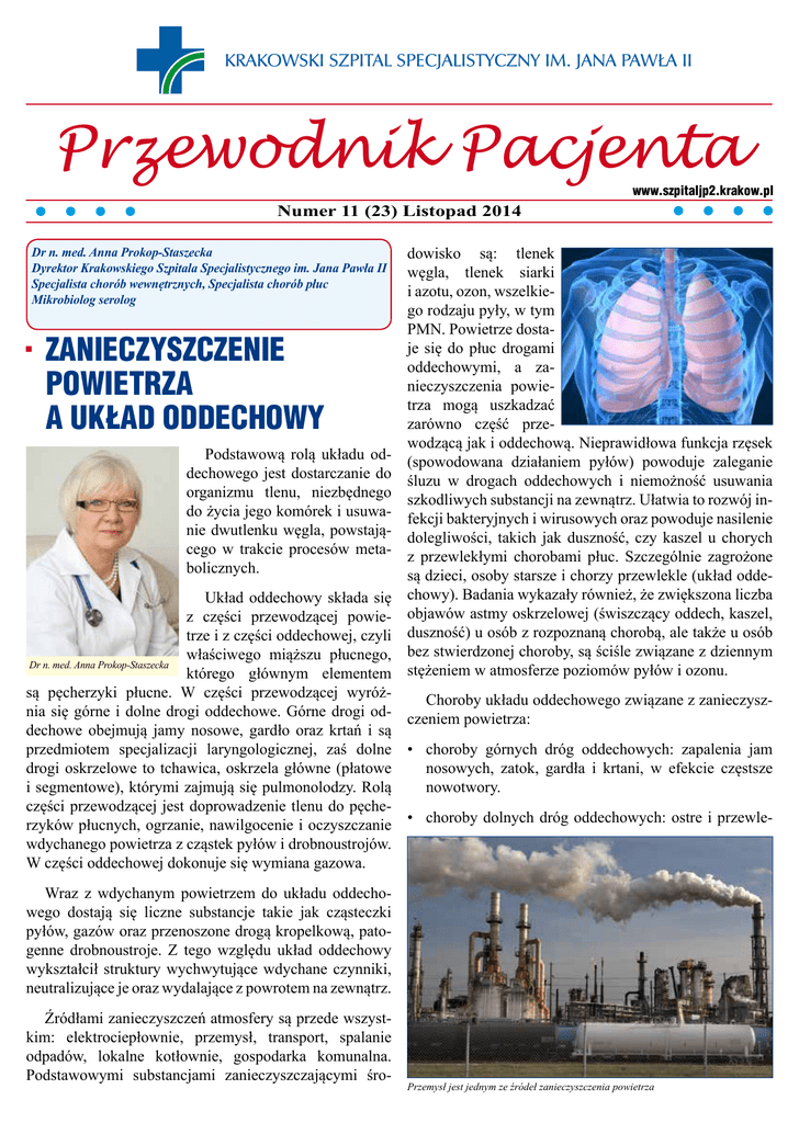 KRAKOWSKI SZPITAL SPECJALISTYCZNY IM. JANA PAWŁA II Przewodnik Pacjenta www.szpitaljp2.krakow.pl Numer 11 (23) Listopad 2014 O, MAMMO ! Dr n. med. Anna Prokop-Staszecka Dyrektor Krakowskiego Szpitala Specjalistycznego im. Jana Pawła II Specjalista chorób wewnętrznych, Specjalista chorób płuc Mikrobiolog serolog Zadbaj o zdrowie swoich piersi! Rak piersi jest obecnie najczęściej występującym nowotworem u kobiet z krajów rozwiniętych. Należy pamiętać że nowotwory sutka mogą występować również u mężczyzn, są jednak bardzo rzadkie. Wczesne wykrycie zmian nowotworowych i podjęcie odpowiedniego leczenia zwiększa szanse wyleczenia raka piersi! W diagnostyce schorzeń piersi wykorzystuje się różne techniki obrazowania: 1/ Sonomammograa - czyli USG piersi – badanie z użyciem ulPodstawową rolą układu odtradźwięków. Badanie to powinna wykonywać każda kobieta najlepiej w odstędechowego jest dostarczanie do pach 1 roku. Badanie to jest organizmu całkowicie niebolesne i nieszkodliwe, tlenu, niezbędnego dedykowane różnicowaniu zmian guzkowych, niewydolne w wykrywaniu wczesnych postaci raka.do życia jego komórek i usuwanie- badanie dwutlenku węgla, powstają2/ Badanie mammograczne z użyciem promieniowania rentgenowskiego. Nie może być wykonywane jako badanie cego w trakcie procesówprzesiemetawowe u młodych kobiet. bolicznych. W badaniu pierś ściska się między dwoma płytkami. Stopień odczuwania ucisku zależny jest od Układ indywidualnej wrażliwości piersi. oddechowy składa się Badanie trwa bardzo krótko. z części magnetycznego przewodzącej- badaniem powie3/ Badanie piersi metoda rezonansu trze i z części oddechowej, czyli z użyciem pola elekromagnetycznego i gadolinowego środka kontrastowego. Badanie najbardziej właściwego czułe i swoiste,miąższu jednak ze płucnego, względu na Dr n. med.koszt Anna Prokop-Staszecka wysoki badania i małą którego dostępność głównym (w dyspozycjielementem wyspecjalizowanych poradni chorób sutka) zarezerwowane dla wybranej grupy są pęcherzyki płucne. W części przewodzącej wyróżpacjentek. niaMammogra się górne iadolne oddechowe. Górnesiędrogi odi usg todrogi dwa różne, uzupełniające badania, nie należy więc zastanawiać które jest „lepsze”. dechowe obejmują jamy się, nosowe, gardło orazKażde krtańz nich i są ma swoje zalety ispecjalizacji wady – na przykład ultrasonograazaś nie wykryprzedmiotem laryngologicznej, dolne wa mikrozwapnień, które mogą być objawem wczesnej postaci drogi oskrzelowe to tchawica, oskrzela główne (płatowe raka. i segmentowe), którymi pulmonolodzy.metoda Rolą Badania mammogra cznezajmują to wciążsięnajskuteczniejsza wczesnego diagnozowania raka piersi. Z doświadczeń krajów skanczęści przewodzącej jest doprowadzenie tlenu do pęche- ZANIECZYSZCZENIE POWIETRZA A UKŁAD ODDECHOWY Zakładsą:Radiologii dowisko tlenek i Diagnostyki Obrazowej węgla, tlenekRejestracja siarki na badania: i azotu, ozon, (012)wszelkie614 3333, w godz. 7:30-18:00 go rodzaju pyły, w tym PMN. Powietrze dynawskich wynika dostaże badania przesiewowe piersi pozwoliły zreduje się umieralność do płuc drogami kować z powodu raka piersi o ok. 30 proc. Zmiany w piersi często wykrywane są przez same kobiety – jest to jednak na oddechowymi, a zaogół już zmiana zaawansowana nieczyszczenia powiePierwsza mammograa w życiu kobiety powinna być wykonytrza wmogą wana 40-tymuszkadzać roku życia, bez względu na wielkość i typ utkania zarówno część przepiersi. Szpital jak im. Jana Pawła II w Nieprawidłowa Krakowie bierze udział w licznych wodzącą i oddechową. funkcja rzęsek programach pro laktycznych dedykowanych dla kobiet mieszkanek (spowodowana działaniem pyłów) powoduje zaleganie województwa małopolskiego nansowanych przez różne podmioty, śluzu w drogach oddechowych i niemożność usuwania umożliwiając wykonanie bezpłatnych badan piersi, bez wymaganego szkodliwych substancji na zewnątrz. Ułatwia to rozwój inskierowania. Stale od kilku realizowany jest program NFZ - screening mammogra czny raka piersi dla kobiet woraz wieku 50-69. nasilenie fekcji bakteryjnych i wirusowych powoduje Dodatkowo wykonywane są również bezpłatnie badania prolakdolegliwości, takich jak duszność, czy kaszel u chorych tyczne dla pań z innych grup wiekowych od 40-tego roku życia. O z przewlekłymi chorobami płuc. Szczególnie zagrożone dostępność programów należy pytać w rejestracji Zakładu Radiolosą idzieci, osoby starsze w i chorzy (układrównież oddegii Diagnostyki Obrazowej budynkuprzewlekle diagnostyki. Można skorzystać z badań samo nansowanych przez chowy). Badania wykazały również, żepacjentki. zwiększona liczba Szpital im. Jana oskrzelowej Pawła II pacjentki dysponuje oddech, nowoczesnym cyobjawów astmy (świszczący kaszel, frowym aparatem mammogracznym. duszność) osób zgwarantuje: rozpoznaną chorobą, ale także u osób Technika ucyfrowa bez- wysoką stwierdzonej choroby, są ściśle związane z dziennym rozdzielczość obrazu bardzo dobry kontrast stężeniem w atmosferze poziomów pyłów i ozonu. - możliwość powiększenia zdjęcia na ekranie monitora, co znacznie Choroby ułatwia lekarzowi diagnozy układupostawienie oddechowego związane z zanieczyszdużo niższą niż w aparatach analogowych dawkę promienioczeniem powietrza: wania możliwośćgórnych rejestrowania na nośniku elektronicznym • -choroby drógbadania oddechowych: zapalenia jam - archiwizację wykonanych badań w bazie danych nosowych, zatok, gardła i krtani, w efekcie częstsze nowotwory. Konsultacja: dr Małgorzata Urbańczyk-Zawadzka rzyków płucnych, ogrzanie, nawilgocenie i oczyszczanie • choroby dolnych dróg oddechowych: ostre i przewlewdychanego powietrza z cząstekUrbańczyk pyłów i drobnoustrojów. Rozmowa z dr Małgorzatą – Zawadzką, Kierownik Zakładu Radiologii i Diagnostyki Obrazowej W części o