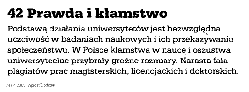 42 Prawda i kłamstwo Podstawą działania uniwersytetów jest bezwzględna uczciwość w badaniach naukowych i ich przekazywaniu społeczeństwu. W Polsce kłamstwa w nauce i oszustwa uniwersyteckie przybrały groźne rozmiary. Narasta fala plagiatów prac magisterskich, licencjackich i doktorskich. i kłamstwo Uniwersytety sprostają powołaniu dostarczania bezpiecznej prawdy, jeśli będą uczciwe Łukasz A. Turski Profesor w Centrum Fizyki Teoretycznej PAN oraz na Uniwersytecie Kardynała Stefana Wyszyństóego w Warszawie atem 1870 r. u wybrzeży Katanii rozbił się brytyjski szkuner „Psyche". Szczęśliwie cala załoga, a także spora część drogocennego ładunku ocalały. Jednym z uratowanych członków załogi „Psyche" był angielski matematyk W i l l i a m Kingdon C l i f ford. Wraz z pasażerami „Psyche" udawał się na Sycylię, aby obserwować zaćmienie Słońca. Katastrofa była jednak tragiczna w skutkach dla Clifforda, bo odezwała się odziedziczona po matce gruźlica. Mimo heroicznej walki zabiła go w 1879 r. POTRZEBA BEZPIECZNEJ PRAWDY W i l l i a m Clifford był nie tylko genialnym matematykiem - to jemu zawdzięczamy pierwsze próby zastosowania nieeuklidesowych geometrii do opisu zjawisk fizycznych i kosmologii (pełne zastosowanie tych geometrii przyniosła dopiero ogólna teoria względności Einsteina w 1915 r.), a studenci matematyki i fizycy do dziś uczą się o algebrach Clifforda. Był on też jednym z najwybitniejszych filozofów przyrody, którego twórczość starannie starają się ukryć modni dziś pionierzy postmodernistycznej paranauki. W swojej twórczości filozoficznej Clifford, niezależnie od poprzedzającego go Tomasza Jeffersona, sformułował odpowiedź na podstawowe pytanie: co jest przedmiotem badania n a u k i . W wykładzie wygłoszonym w 1872 r. w Brighton powiedział: „Przedmiotem nauki jest wszechświat człowieka; to znaczy wszystko to, co jest, było lub może być związane z człowiekiem". Cl i f fordowi zawdzięczamy też bardzo ważne pojęcie bezpiecznej prawdy. Wielki polski filozof i matematyk Jakub Bronowski, pamiętny autor pierwszego wielkiego serialu telewizyjnego BBC o nauce „Powstanie człowieka" („The Ascent of Mań"), poświęcił temu pojęciu niemal całą swoją książkę „Zwykle znaczenie nauki" („The Common Sense of Science"). Tytuł jest parafrazą dzieła Clifforda „Zwy- kle znaczenie nauk ścisłych" („The Common Sense of Exact Science"). Według Clifforda i Bronowskiego, nauka jest jedynym codziennym dostarczycielem bezpiecznej prawdy ',/JB opartej nie na przyjętej z góM O ry ideologii, ale na poznawaniu faktów i f o r m u ł o w a n i u ogólnych praw fakty te porządkujących. W cywilizacji europejskiej, opartej na szeroko rozumianych wartościach chrześcijańskich, potrzeba społecznego dostępu do bezpiecznej prawdy pojawiła się bardzo wcześnie. Bardzo wcześnie też, niemal tysiąc lat temu, społeczeństwo stworzyło instytucję mającą mu dostarczać bezpiecznej prawdy o wszechświecie człowieka. Instytucją tą były, są i powinny pozostać uniwersytety. W jednej ze wspaniałych baśni warszawskich Or-Ota (Artura Oppmana), gdy gród Warszawy zagrożony został przez bazyliszka, strwożony lud miasta nie szukał zbawienia na ratuszu, zamku czy w katedrze, ale u „mistrza z wieży", symbolizującego w ł a ś n i e źródło ratującej miasto prawdziwej wiedzy. POTĘGA WOLNEJ MYŚLI Od początku uniwersyteccy dostarczyciele bezpiecznej prawdy byli narażeni na nieprzychylność ze strony władz ś w i e c k i c h i duchownych. To nic, że królowie wydawali prawa o autonomii uczelni, że sobór laterański gwarantował niezależność szkół katedralnych i nauczycieli oraz głosił równy dostęp do uczelni dla wszystkich. Los Abelarda czy niemal pięcioletnie zamknięcie Oksfordu na początku XIII wieku, nie wspominając już o przybyciu do Oksfordu wizytatorów parlamentarnych wysłanych przez lorda protektora Cromwella, mówią same za siebie. Przykładów z ostatnich stuleci też łatwo dostarczyć niemało. Wielka humboldtowska tradycja uniwersytetów niemieckich legła w gruzach w okresie III Rzeszy, słabe carskie uniwersytety nie podniosły głowy w czasach komunizmu. Na Księżyc dolecieli absolwenci wolnych uniwersytetów, a nie karni elewi janczarskich szkół Związku Radzieckie- go. Nasze uniwersytety ledwie przetrwały lata zarządzania nimi przez „przodującą siłę" - PZPR - płacąc za to kolosalną cenę, od której odsetki będziemy jeszcze długo spłacać. Dziś, niestety, autonomia intelektualna i prawna uczelni jest znowu zagrożona, nie tylko zresztą w krajach młodych demokracji. Postmodernistyczna polityczna poprawność czasami wydaje się wstrząsać podstawami jednego z najbardziej odpornych systemów niezależnej edukacji i badań, jakim są uniwersytety amerykańskie. Przypomnę ; ~> tu tylko ataki na prezydenta Uni. •• wcrsytetu Stanforda czy skandal ; i z dopuszczeniem do wystąpień dr. Warda Churchilla, udającego Indianina autora porównań ofiar zamachu na WTC z Eichmanem. W Polsce mamy bardziej sformalizowany atak na odwojowane 15 lat temu swobody uniwersyteckie, zawarty w prezydenckim projekcie ustawy o szkolnictwie wyższym i w nagłośnionej już przez media poselskiej próbie wpisania do ustawy zapisów jawnie skierowanych przeciw swobodom uniwersyteckim, na przykład o usuwalności władz rektorskich. KŁAMSTWO NA UNIWERSYTECIE Podstawą działania uniwersytetów, jeżeli mają sprostać swojemu powołaniu dostarczania bezpiecznej prawdy, jest bezwzględna uczciwość w badaniach naukowych i ich przekazywaniu społeczeństwu. To ostatnie dokonuje się przede wszystkim w procesie nauczania. Trzecim ważnym elementem wypełniania roli uniwersytetów jest zapewnienie wolnego dostępu do wyników badań naukowych. Niestety, ostatnie lata dowodzą, że środowiska akademickie ugięły się pod presją otaczającego świata
