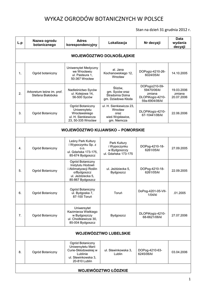 WYKAZ OGRODÓW BOTANICZNYCH W POLSCE Stan na dzień 31 grudnia 2012 r. L.p Nazwa ogrodu botanicznego Adres korespondencyjny Lokalizacja Nr decyzji Data wydania decyzji WOJEWÓDZTWO DOLNOŚLĄSKIE 1. 2. 3. Ogród botaniczny Uniwersytet Medyczny we Wrocławiu ul. Pasteura 1, 50-367 Wrocław al. Jana Kochanowskiego 12, Wrocław DOPogiz-4210-266024/05/kl 14.10.2005 Arboretum leśne im. prof. Stefana Białoboka Nadleśnictwo Syców ul. Kolejowa 14, 56-500 Syców Ślizów, gm. Syców oraz Stradomia Dolna gm. Dziadowa Kłoda DOPogiz210-5959470/06/kl zmiana DLOPiKogiz-421059a-6904/06/kl 19.03.2006 zmiana 20.07.2006 Ogród Botaniczny Ogród Botaniczny Uniwersytetu Wrocławskiego ul. H. Sienkiewicza 23, 50-335 Wrocław ul. H. Sienkiewicza 23, Wrocław oraz wieś Wojsławice, gm. Niemcza DLOPiKogiz-421067-10441/06/kl 22.06.2006 WOJEWÓDZTWO KUJAWSKO – POMORSKIE Ogród Botaniczny Leśny Park Kultury i Wypoczynku Sp. z o.o. ul. Gdańska 173-175, 85-674 Bydgoszcz Park Kultury i Wypoczynku w Bydgoszczy ul. Gdańska 173-175 DOPog-4210-186261/05/kl 27.09.2005 5. Ogród Botaniczny Ogród Botaniczny Instytutu Hodowli i Aklimatyzacji Roślin o/Bydgoszcz ul. Jeździecka 5, 85-867 Bydgoszcz ul. Jeździecka 5, Bydgoszcz DOPog-4210-186261/05/kl 22.09.2005 6. Ogród Botaniczny Ogród Botaniczny ul. Bydgoska 7, 87-100 Toruń Toruń DoPog-4201-05-VII1/04/kl .01.2005 Ogród Botaniczny Uniwersytet Kazimierza Wielkiego w Bydgoszczy ul. Chodkiewicza 30, 85-004 Bydgoszcz Bydgoszcz DLOPiKogiz-421068-6621/06/kl 27.07.2006 4. 7. WOJEWÓDZTWO LUBELSKIE 8. Ogród Botaniczny Ogród Botaniczny Uniwersytetu Marii Curie-Skłodowskiej w Lublinie ul. Sławinkowska 3, 20-810 Lublin ul. Sławinkowska 3, Lublin DOPog-4210-636245/06/kl 03.04.2006 WOJEWÓDZTWO ŁÓDZKIE 1 Nazwa ogrodu botanicznego Adres korespondencyjny Lokalizacja Nr decyzji Data wydania decyzji 9. Ogród Botaniczny Arboretum Szkoły Głównej Gospodarstw a Wiejskiego w Rogowie 96-135 Rogów ul. Leśna, Rogów DOPog-4210-5310900/06/kl 3.02.2006 10. Ogród Botaniczny ul. Krzemieniecka 36/38, 94-303 Łódź ul. Krzemieniecka 36/38 oraz ul. Piłsudskiego 61, Łódź DOPog-4210-205670/05/kl 22.09.2005 ul. Zborowskiego 1 oraz ul. Antałówka 13, Zakopane DOPog-4210-375489/05/kl 27.12.2005 ul. M. Kopernika 27, Kraków GDOŚ/DOPobiz4210-6/2054/10/jr L.p WOJEWÓDZTWO MAŁOPOLSKIE 11. Ogród Botaniczny 12. Ogród Botaniczny Górski Ogród Botaniczny im. Mariana Raciborskiego PAN w Zakopanem ul. Antałówka 13, 34-500 Zakopane Ogród Botaniczny Uniwersytetu Jagiellońskiego ul. M. Kopernika 27, 31-501 Kraków 31.05.2010 WOJEWÓDZTWO MAZOWIECKIE 13. 14. Ogród Botaniczny PAN Ogród Botaniczny Ogród BotanicznyCentrum Zachowania RóŜnorodności Biologicznej PAN ul. Prawdziwka 2, 02-973 Warszawa Ogród Botaniczny Uniwersytetu Warszawskiego Aleje Ujazdowskie 4, 00-478 Warszawa ul. Prawdziwka 2, Powsin DOPog-4210-318089/05/kl 3.02.2006 Aleje Ujazdowskie 4, Warszawa DOPog-4210-652177/06/kl 09.05.2006 DOPor.6510.5.2012.jr 21.11.2012 DOPOBIZ.6500.3.2011.j r.2 14.06.2011 WOJEWÓDZTWO PODKARPACKIE 15. Ogród Botaniczny Arboretum i Zakład Fizjografii w Bolestraszycach 37-700 Przemyśl, skr. poczt. 471 Bolestraszyce, gm. śurawica oraz Cisowa, gm. Krasiczyn WOJEWÓDZTWO PODLASKIE 16. Ogród Botaniczny "Podlaski ogród ziołowy" Mirosław Angielczyk Koryciny 73, 17-315 Grodzisk Koryciny, gm. Grodzisk WOJEWÓDZTWO POMORSKIE 2 L.p Nazwa ogrodu botanicznego Adres korespondencyjny Lokalizacja Nr decyzji Data wydania decyzji 17. Leśny Ogród Botaniczny „Marszewo” Nadleśnictwo Gdańsk ul. Morska 200, 81-006 Gdynia Marszewo, gm. Przywidz GDOŚ/DOPobiz4210-1/2875/10/jr 4.08.2010 18. Ogród Botaniczny Nadleśnictwo Kaliska 83-224 Borzechowo Wirty, gm. Zblewo DOPog-4210-388846/05/kl 28.12.2005 19. Ogród Botaniczny Zbigniew Butowski ul. Botaniczna 21, 83-316 Gołubie ul. Botaniczna 21, Gołubie DOPog-4210-375489/05/kl 27.12.2005 20. Ogród Dendrologiczny w Orlu Maria i Klaudiusz Buzalscy ul. Orle 35, 83-420 Liniewo Orle, gm. Liniewo GDOŚ/DOPobiz4210-4/1950/10/jr 26.05.2010 Ogród Botaniczny „Ogród Roślin Leczniczych” Gdański Uniwersytet Medyczny ul. M. SkłodowskiejCurie 3a, 80-210 Gdańsk al. Gen. J. Hallera 107, Gdańsk DOPor.6510.2.2012 .jr 24.12.2012 16.01.2006, zmiana 4.10.2007 21. WOJEWÓDZTWO ŚLĄSKIE 22. 23. 24. 25. 26. Ogród Botaniczny Miejski Ogród Botaniczny w Zabrzu ul. Piłsudzkiego 60, 41-800 Zabrze ul. Piłsudskiego 60, Zabrze DOPog-4210-5010240/06/kl zmiana DOPogiz-4210-509293/07/kl Ogród Botaniczny Arboretum Bramy Morawskiej ul. Markowicka13, 47-400 Racibórz Racibórz DOPogiz-4210-15757-I/05/kl 27.12.2005 Ogród Botaniczny Związek Stowarzyszeń - Śląski Ogród Botaniczny ul. Zamkowa 2, 43195 Mikołów Mikołów, gm. Mikołów DOP-4210-5511166/06/kl 07.02.2006 Ogród Botaniczny Związek Stowarzyszeń - Śląski Ogród Botaniczny ul. Zamkowa 2, 43195 Mikołów Radzionków, gm. Radzionków GDOŚ/DOPobiz4210-9/3600/10/jr 14.10.2010 Egzotarium Ogród Botaniczny Miejski Zakład Usług Komunalnych w Sosnowcu ul. 3 Maja 11, 41-200 Sosnowiec ul. Marszałka J. Piłsudskiego 116, Sosnowiec DOPoz.6510.1.2012.jr 18.07.2012 DOPog-4210-375489/05/kl 27.12.2005 WOJEWÓDZTWO ŚWIĘTOKRZYSKIE 27. Arboretum przy WyŜszej Szkole HumanistycznoPrzyrodniczej w Sandomierz WyŜsza Szkoła HumanistycznoPrzyrodnicza w Sandomierzu ul. Krakowska 26, 27-600 Sandomierz ul. Krakowska, Sandomierz 3 L.p Nazwa ogrodu botanicznego Adres korespondencyjny Lokalizacja Nr decyzji Data wydania decyzji 28. Ogród Botaniczny Geopark Kielce ul. Daleszycka 21, 25202 Kielce ul. Karczówkowska, Kielce DOPog-4210-643839/06/kl 22.06.2006 WOJEWÓDZTWO WARMIŃSKO – MAZURSKIE Nadleśnictwo Kudypy Kudypy 4, 11-036 Gietrzwałd DOPog-4210-278197/05/kl 18.10.2005 ul. Parkowa 5, Kórnik DOPog-4210-66110046/06/kl 29.05.2006 ul. Niestachowska, ul. Warmińska, Poznań DOPog-4210-5410829/06/kl 24.03.2006 Plewiska, gm. Komorniki DOPog-4210-324462/05/kl zmiana DONOOŚogiz4210/I1/110/06/08/ep 27.12.2005 zmiana 31.10.20