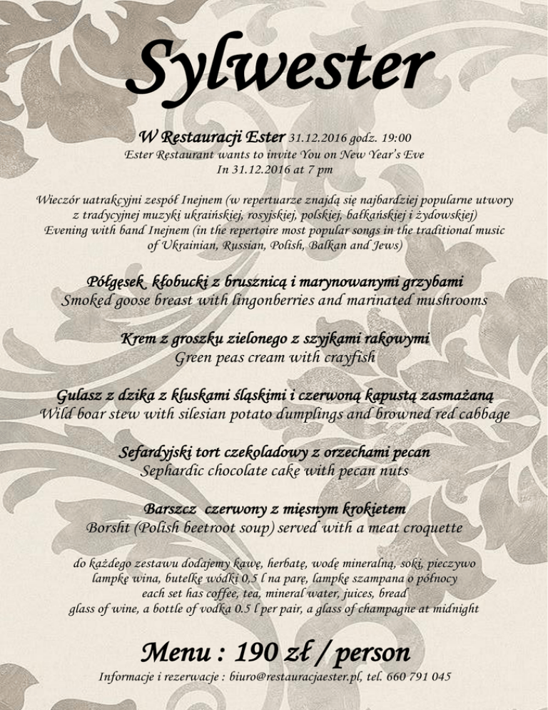 Sylwester W Restauracji Ester 31.12.2016 godz. 19:00 Ester Restaurant wants to invite You on New Year’s Eve In 31.12.2016 at 7 pm Wieczór uatrakcyjni zespół Inejnem (w repertuarze znajdą się najbardziej popularne utwory z tradycyjnej muzyki ukraińskiej, rosyjskiej, polskiej, bałkańskiej i żydowskiej) Evening with band Inejnem (in the repertoire most popular songs in the traditional music of Ukrainian, Russian, Polish, Balkan and Jews) Półgęsek kłobucki z brusznicą i marynowanymi grzybami Smoked goose breast with lingonberries and marinated mushrooms Krem z groszku zielonego z szyjkami rakowymi Green peas cream with crayfish Gulasz z dzika z kluskami śląskimi i czerwoną kapustą zasmażaną Wild boar stew with silesian potato dumplings and browned red cabbage Sefardyjski tort czekoladowy z orzechami pecan Sephardic chocolate cake with pecan nuts Barszcz czerwony z mięsnym krokietem Borsht (Polish beetroot soup) served with a meat croquette do każdego zestawu dodajemy kawę, herbatę, wodę mineralną, soki, pieczywo lampkę wina, butelkę wódki 0,5 l na parę, lampkę szampana o północy each set has coffee, tea, mineral water, juices, bread glass of wine, a bottle of vodka 0.5 l per pair, a glass of champagne at midnight Menu : 190 zł / person Informacje i rezerwacje : [email protected], tel. 660 791 045