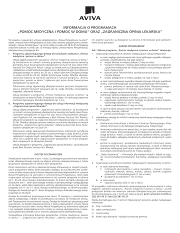 INFORMACJA O PROGRAMACH „POMOC MEDYCZNA I POMOC W DOMU” ORAZ „ZAGRANICZNA OPINIA LEKARSKA” W związku z zawarciem umowy ubezpieczenia „Nowa Perspektywa na start” (dalej: umowa Nowa Perspektywa na start) albo umowy ubezpieczenia uniwersalnego „Nowa Perspektywa” na rzecz osoby w wieku od 18 do 35 lat będącej rodzicem dziecka w wieku do 12 miesięcy (dalej: umowa Nowa Perspektywa), Ubezpieczony przystępuje do: ich ogólne warunki są dostępne na stronie internetowej pod adresem: www.aviva.pl/nastart I. Programu zapewniającego dostęp do świadczeń assistance „Pomoc medyczna i pomoc w domu”. 1. organizację oraz pokrycie kosztów następujących usług medycznych: Usługi objęte programem assistance „Pomoc medyczna i pomoc w domu” są świadczone w ramach umowy grupowej ubezpieczenia zawartej pomiędzy Aviva Towarzystwem Ubezpieczeń na Życie SA oraz AGA International SA Oddział w Polsce. Usługi te świadczone są Ubezpieczonemu i dodatkowo współmałżonkowi/partnerowi Ubezpieczonego oraz dzieciom Ubezpieczonego w wieku do 20 lat, a także dzieciom Ubezpieczonego w wieku od 20 do 25 lat, dopóki kontynuują naukę. Składka ubezpieczeniowa należna za ochronę udzielaną w ramach programu „Pomoc medyczna i pomoc w domu” opłacana jest przez Aviva Towarzystwo Ubezpieczeń na Życie SA. Oferowane usługi zapewniają Ubezpieczonemu poczucie bezpieczeństwa w różnych losowych sytuacjach jak np. nagła choroba, nieszczęśliwy wypadek, zdarzenie losowe. Usługi dostępne w programie „Pomoc medyczna i pomoc w domu” są świadczone na terenie Polski 24 godziny na dobę. Ich realizację zapewnia Centrum Operacyjne Mondial Assistance Sp. z o.o. II. Programu zapewniającego dostęp do usług informacji medycznej „Zagraniczna opinia lekarska”. Usługi objęte programem „Zagraniczna opinia lekarska” są świadczone w ramach umowy grupowej ubezpieczenia zawartej pomiędzy Aviva Towarzystwem Ubezpieczeń na Życie SA oraz Aviva Towarzystwem Ubezpieczeń Ogólnych SA, we współpracy z Best Doctors Services SLU Madryt. Usługi te świadczone są wyłącznie dzieciom Ubezpieczonego w wieku do 25 lat. Składka ubezpieczeniowa należna za ochronę udzielaną w ramach programu „Zagraniczna opinia lekarska” opłacana jest przez Aviva Towarzystwo Ubezpieczeń na Życie SA. Oferowane usługi zapewniają Ubezpieczonemu możliwość weryfikacji rozpoznania ciężkiego schorzenia postawionego u jego dziecka, przez najlepszych zagranicznych specjalistów. Zapewniają też możliwość zwrócenia się o wydanie opinii zagranicznych specjalistów w innych przypadkach związanych ze zdrowiem dziecka. Usługi dostępne w programie „Zagraniczna opinia lekarska” są świadczone przez Best Doctors Services SLU Madryt. DOSTĘP DO ŚWIADCZEŃ Świadczenia wymienione w pkt.1 oraz 2 są dostępne po pisemnym wyrażeniu przez Ubezpieczonego zgody na objęcie ochroną ubezpieczeniową z tytułu grupowych ubezpieczeń w ramach tych programów. Dzień rozpoczęcia ochrony ubezpieczeniowej oferowanej w ramach powyższych programów (dalej: dzień początku dostępu do świadczeń) jest uzależniony od daty rozpoczęcia ochrony ubezpieczeniowej odpowiednio w umowie Nowa Perspektywa na start albo w umowie Nowa Perspektywa. Jeżeli data rozpoczęcia ochrony ubezpieczeniowej w tej umowie przypada w okresie od 1. do 20. dnia miesiąca kalendarzowego, to dniem początku dostępu do świadczeń jest 1. dzień pierwszego miesiąca kalendarzowego następującego po tej dacie. Jeżeli data rozpoczęcia ochrony ubezpieczeniowej w tej umowie przypada od 21. do 31. dnia miesiąca kalendarzowego, to dniem początku dostępu do świadczeń jest 1. dzień drugiego miesiąca kalendarzowego następującego po tej dacie. Dostęp do świadczeń przysługuje przez okres 12 miesięcy, z zastrzeżeniem zdania następnego, i będzie on przedłużany na kolejne 12-miesięczne okresy, jeśli Towarzystwo nie postanowi inaczej. Dostęp do świadczeń przysługuje pod warunkiem, że składki ubezpieczeniowe z tytułu odpowiednio umowy Nowa Perspektywa na start albo umowy Nowa Perspektywa są terminowo opłacane i nie nastąpiło przekształcenie tych umów w umowę ubezpieczenia z zawieszoną płatnością składek lub w umowę ubezpieczenia bezskładkowego. Szczegółowe informacje dotyczące programów „Pomoc medyczna i pomoc w domu” i „Zagraniczna opinia lekarska”, zakresy ubezpieczenia oraz ZAKRES PROGRAMÓW Ad I. Zakres programu „Pomoc medyczna i pomoc w domu” obejmuje: a. w razie nagłego zachorowania lub nieszczęśliwego wypadku Ubezpieczonego, współmałżonka lub jego dziecka: • wizyta lekarza w miejscu pobytu (2 razy w roku) • transport medyczny: z miejsca jego pobytu do placówki medycznej, z placówki medycznej do miejsca pobytu oraz pomiędzy placówkami medycznymi • dostarczenie leków/mleka zaordynowanych przez lekarza do miejsca pobytu • wizyta pielęgniarki w miejscu pobytu (2 razy w roku) b. w razie nieszczęśliwego wypadku Ubezpieczonego lub jego współmałżonka, uniemożliwiającego samodzielną pielęgnację niemowlaka: • pomoc położnej w opiece nad dzieckiem Ubezpieczonego – w ciągu pierwszych 12 miesięcy życia dziecka (1 wizyta) c. w razie nagłego zachorowania lub nieszczęśliwego wypadku niepełnoletniego dziecka Ubezpieczonego: • wizyta lekarza pediatry w miejscu pobytu (2 razy w roku) • organizacja i pokrycie kosztu noclegu w szpitalu rodzica hospitalizowanego dziecka (1 raz w roku) • opieka nad dzieckiem (2 razy w roku) d. w razie trudnej sytuacji losowej (śmierć lub poważne zachorowanie małżonka, dziecka, rodzica): • pomoc psychologa (1 raz w roku) 2. całodobowy dostęp do infolinii medycznej świadczącej następujące usługi informacyjne: a. telefoniczna konsultacja z lekarzem Centrum Operacyjnego, który udzieli informacji co do dalszego postępowania medycznego b. informacja zdrowotna na temat diet, w tym między innym