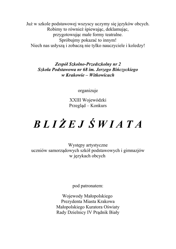 Już w szkole podstawowej wszyscy uczymy się języków obcych. Robimy to również śpiewając, deklamując, przygotowując małe formy teatralne. Spróbujmy pokazać to innym! Niech nas usłyszą i zobaczą nie tylko nauczyciele i koledzy! Zespół Szkolno-Przedszkolny nr 2 Szkoła Podstawowa nr 68 im. Jerzego Bińczyckiego w Krakowie – Witkowicach organizuje XXIII Wojewódzki Przegląd – Konkurs BLIŻEJ ŚWIATA Występy artystyczne uczniów samorządowych szkół podstawowych i gimnazjów w językach obcych pod patronatem: Wojewody Małopolskiego Prezydenta Miasta Krakowa Małopolskiego Kuratora Oświaty Rady Dzielnicy IV Prądnik Biały Regulamin Konkursu W celu urozmaicenia i uatrakcyjnienia corocznego wojewódzkiego konkursu językowego Przeglądu Bliżej Świata, począwszy od roku 2014, wprowadza się motyw przewodni konkursu, który zmieniać się będzie corocznie oraz którego realizacja będzie podlegała ocenie przez jury. Udział w konkursie mogą wziąć zespoły z samorządowych szkół podstawowych w kategorii wiekowej kl. I-III i kl. IV-VI, oraz gimnazjów (wszystkich klas). Prezentować można: małe formy teatralne. Motyw przewodni XXIII Konkursu dla szkół podstawowych i gimnazjów: „Święta, zwyczaje i tradycje z różnych stron świata” . Nawiązanie do tematyki obowiązującej w danym roku dotyczy wszystkich kategorii językowych. Czas trwania prezentacji: do 20 minut. Kryteria oceny: poprawność wymowy (1-10 pkt), poziom trudności (1-10 pkt), wrażenia artystyczne (1-3pkt), rekwizyty, stroje, dekoracja (1-2 pkt). nawiązanie do obowiązującego w danym roku motywu przewodniego (0 – 3 pkt). Przegląd-Konkurs odbędzie się w środę i czwartek 18 i 19 maja 2016 roku, a ogłoszenie wyników i wręczenie nagród 10 czerwca 2016 r. o godz. 13. w Szkole Podstawowej nr 68 im. Jerzego Bińczyckiego w Krakowie – Witkowicach, ul. Porzeczkowa 3 (dojazd autobusem linii 287,267,115) Zgłoszenia do przeglądu należy składać do 29.04. 2016 r. na załączonym blankiecie . Informacje można uzyskać: www.zsp2.krakow.pl tel./fax (12) 415-47-08 e-mail: [email protected] Zgłoszenie udziału w XXIII Przeglądzie - Konkursie „Bliżej Świata” Nazwa, pełny adres, nr telefonu placówki : ............................................................................ ............................................................................ ............................................................................ Nazwisko i imię opiekuna : ............................................ Liczba uczestników : ............................................ Klasa : ........................................... Czas trwania występu : ............................................ Występ w języku : ............................................ Uwagi : ........................................................................... NAGRODĘ GRAND – PRIX WYJAZD NA OBÓZ MŁODZIEŻOWY DO WŁOCH 13 DNI WYPOCZYNKU, PIĘKNA PLAŻA, PERŁY ARCHITEKTURY ŚRÓDZIEMNOMORSKIEJ, DLA ZWYCIĘZCY SPONSORUJE BIURO PODRÓŻY ORGANIZATOR WYPOCZYNKU DLA DZIECI I MŁODZIEŻY: ZIELONE SZKOŁY WYCIECZKI KOLONIE OBOZY Puchary dla zwycięskiej szkoły podstawowej i gimnazjum funduje Małopolski Kurator Oświaty Główni fundatorzy nagród: Prezydent Miasta Krakowa Rada Dzielnicy IV Prądnik Biały Zespół Ekonomiki Oświaty Centrum Obsługi Szkół EDUKATOR Stowarzyszenie Przyjaciół Witkowic FIRMA Ailleron S.A. Kraków Stanisław Szpar Supermarket SIMPLY Cech Rzemiosł Motoryzacyjnych i Małych Przedsiębiorców w Krakowie Małopolska Izba Rzemiosła i Przedsiębiorczości w Krakowie Leonardo School Kraków