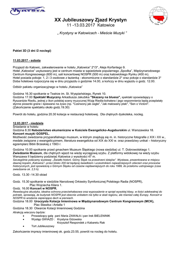 XX Jubileuszowy Zjazd Krystyn 11 -13.03.2017 Katowice „ Krystyny w Katowicach - Mieście Muzyki ” Pakiet 3D (3 dni /2 noclegi) 11.03.2017 - sobota Przyjazd do Katowic, zakwaterowanie w hotelu „Katowice” 2*/3*, Aleja Korfantego 9. Hotel „Katowice” usytuowany jest w centrum miasta w sąsiedztwie popularnego „Spodka”, Międzynarodowego Centrum Kongresowego (600 m), sali koncertowej NOSPR (500 m) oraz katowickiego Rynku (400 m). Hotel posiada pokoje: 1, 2 i 3 osobowe z łazienką - ekonomiczne o standardzie 2* oraz pokoje o standardzie 3* Doba hotelowa rozpoczyna się w dniu przyjazdu o godzinie 14.00, a kończy w dniu wyjazdu o godz. 12.00. Odbiór pakietu organizacyjnego w hotelu „Katowice” Godzina 16.30 spotkanie w Teatrze im. St. Wyspiańskiego, Rynek 10. Godzina 17.00 Spektakl Muzyczny Arkadiusza Jakubika "Skazany na bluesa", spektakl opowiadający o Ryszardzie Riedlu, jednej z ikon polskiej sceny muzycznej Wizję Riedla-bohatera i jego wspomnienia będą przeplatały słynne piosenki grane i śpiewane na żywo (np. "Czerwony jak cegła", "Jak malowany ptak", "Sen o Victorii". (Zakończenie spektaklu około godz.19.30) Powrót do hotelu, godzina 20.30 kolacja w restauracji hotelowej. Dla chętnych dyskoteka, nocleg. 12.03.2017 - niedziela Śniadanie w hotelu Godzina 8.30 Nabożeństwo ekumeniczne w Kościele Ewangelicko-Augsburskim ul. Warszawska 18. Koncert muzyki GOSPEL. Możliwość zwiedzania przyparafialnego muzeum, w którym znajdują się m. in. historyczne fotografie z XIX i XX w., medale związane z ewangelicyzmem, literatura ewangelicka od XIX do XXI w. oraz prawdziwy unikat – historyczny egzemplarz Biblii Brzeskiej z 1563 r. Godzina 10.00 spotkanie przed gmachem Muzeum Śląskiego (nowa siedziba) ul. T. Dobrowolskiego 1. Zwiedzanie Muzeum, dla chętnych wjazd na wieżę wyciągową szybu. Z platformy widokowej na wieży szybu Warszawa II będziemy podziwiać Katowice z wysokości 47 m. Szczególnie polecamy wystawę: „Światło historii. Górny Śląsk na przestrzeni dziejów”. Wystawa, prezentowana w miejscu dawnej kopalni „Katowice”- przez blisko 200 lat będącej świadkiem i uczestnikiem najważniejszych zdarzeń oraz procesów historycznych, jest opowieścią o Górnym Śląsku od czasów najdawniejszych do roku 1989, do przełomu ustrojowego (czas zwiedzania ok. 2,5 h). Godz. 13.30 -14.30 obiad Godz. 15.30 spotkanie w siedzibie Narodowej Orkiestry Symfonicznej Polskiego Radia (NOSPR), Plac Wojciecha Kilara 1. Godz. 16.00 Koncert w NOSPR. Rewelacyjna akustyka, idealna ochrona przeciwhałasowa oraz wyposażenie w sprzęt wysokiej klasy, w ilości adekwatnej do potrzeb, sprawiają, że budynek NOSPR jest obecnie unikatem nie tylko w skali regionu, ale również całej Europy. Koncert w NOSPR to wrażenia zapierające dech w piersiach. Godzina 18.00 Uroczysta Kolacja Imieninowa w Międzynarodowym Centrum Kongresowym (MCK), Plac Sławika i Antalla 1 Godzina 18.30 Otwarcie Kolacji Imieninowej Godzina Atrakcją wieczoru będzie: Prowadzący galę pani Maria ZAWAŁA i pan Irek BIELENINIK Występ GWIAZD : Krystyna Giżowska Krzysztof Respondek z Kabaretu Rak Tort Jubileuszowy Zakończenie imprezy imieninowej ok. godz.23.55, powrót na nocleg do hotelu. 13.03.2017 - poniedziałek Śniadanie w Hotelu Godz. 9.00 -12.00 spacer z przewodnikiem po Katowicach. Zwiedzanie „Szlaku Katowickiej MODERNY” Katowice - przeżywały w okresie międzywojennym okres szybkiego rozwoju. Powstały wówczas modernistyczne obiekty publiczne, kościół garnizonowy czy wybudowane w stylu funkcjonalizmu domy mieszkalne i wille. Na wytyczonym szlaku znajduje się m.in. monumentalny gmach Sejmu Śląskiego (dziś mieszczą się tam urzędy: wojewódzki i marszałkowski), dawne gmachy Urzędów Niezespolonych (dziś wydział filologiczny Uniwersytetu Śląskiego) i Banku Gospodarstwa Krajowego, kościół garnizonowy oraz awangardowe budynki mieszkalne, w tym 60-metrowy tzw. Drapacz Chmur. Godz. 12.30 zbiórka w centrum miasta, Plac Szewczyka (przed Galerią Katowicką) Przejście wszystkich uczestniczek w towarzystwie orkiestry na Rynek (pod Teatr Śląski) Godzina 13.00 Powitanie przez Władze Miasta, Regionu i zaproszonych Gości Godzina 13.13 Odegranie hejnału Krystyn Koncert orkiestry dętej Godz. 14.00 obiad Godz. 16.00 spotkanie w gmachu Filharmonii Śląskiej im. Henryka Mikołaja Góreckiego, ul. Sokolska 2 Godz. 16.15 „Chcesz mieć zdrowe serce?” rozmowa z wybitnym kardiochirurgiem Prof. Andrzejem Bochenkiem Godz. 17.00 Koncert Imieninowy w wykonaniu Gościa Specjalnego Zakończenie Zjazdu Pakiet 3D (3 dni/2 noce) Cena: 650,00 zł - noclegi w Hotelu pokoje 2*, Cena: 710,00 zł - noclegi w Hotelu pokoje 3* Cena obejmuje: pakiet organizacyjny, kapelusz, 11.03 - sobota: kolację, Spektakl Muzyczny „Skazany na bluesa", nocleg. 12.03 - niedziela: śniadanie, zwiedzanie Muzeum Śląskiego, obiad, Koncert w NOSPR, Uroczystą Kolację w MCK, nocleg. 13.03 - poniedziałek: śniadanie, zwiedzanie miasta, udział w Imprezie Imieninowej na Rynku, obiad, Koncert Imieninowy w Filharmonii Śląskiej. Dla uczestniczek Zjazdu Krystyn przygotowaliśmy również pakiet: 2 i 3 dniowy. Istnieje możliwość skorzystania z pakietu 1 dniowego bez noclegu. PAKIET: 1D 13.03.2017 cena: 240,00 zł. Cena obejmuje: pakiet organizacyjny, kapelusz, 13.03 - poniedziałek: zwiedzanie miasta, udział w Imprezie Imieninowej na Rynku, obiad, Koncert Imieninowy w Filharmonii Śląskiej. Dodatkowo pakiet obejmuje zwiedzanie Muzeum Śląskiego w dniu 12.03.2017 (niedziela) PAKIET ORGANIZACYJNY oraz zaproszenie do NOSPR, FILHARMONII, TEATRU i Kolację Imieninową w MCK, do odebrania w biurze organizacyjnym w Hotelu „Katowice” , Aleja Korfantego 9. Biuro będzie czynne w dniu: 10.03 w godz. 12.00-20.00, 11.03 i 12.03 w godz. 8.30-18.00 oraz 13.03 w godz. 8.30-12.00. Dodatkowe świadczenia: - zakwaterowanie w pokoju 1 osobowym, dopłata wynosi: Hotel 2*- 20, 00 zł /doba, Hotel 3*- 60, 00 zł /
