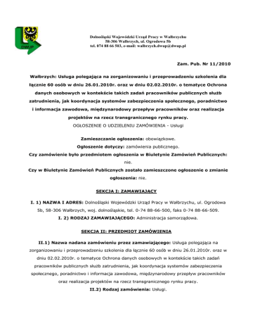 Dolnośląski Wojewódzki Urząd Pracy w Wałbrzychu 58-306 Wałbrzych, ul. Ogrodowa 5b tel. 074 88 66 503, e-mail: [email protected] Zam. Pub. Nr 11/2010 Wałbrzych: Usługa polegająca na zorganizowaniu i przeprowadzeniu szkolenia dla łącznie 60 osób w dniu 26.01.2010r. oraz w dniu 02.02.2010r. o tematyce Ochrona danych osobowych w kontekście takich zadań pracowników publicznych służb zatrudnienia, jak koordynacja systemów zabezpieczenia społecznego, poradnictwo i informacja zawodowa, międzynarodowy przepływ pracowników oraz realizacja projektów na rzecz transgranicznego rynku pracy. OGŁOSZENIE O UDZIELENIU ZAMÓWIENIA - Usługi Zamieszczanie ogłoszenia: obowiązkowe. Ogłoszenie dotyczy: zamówienia publicznego. Czy zamówienie było przedmiotem ogłoszenia w Biuletynie Zamówień Publicznych: nie. Czy w Biuletynie Zamówień Publicznych zostało zamieszczone ogłoszenie o zmianie ogłoszenia: nie. SEKCJA I: ZAMAWIAJĄCY I. 1) NAZWA I ADRES: Dolnośląski Wojewódzki Urząd Pracy w Wałbrzychu, ul. Ogrodowa 5b, 58-306 Wałbrzych, woj. dolnośląskie, tel. 0-74 88-66-500, faks 0-74 88-66-509. I. 2) RODZAJ ZAMAWIAJĄCEGO: Administracja samorządowa. SEKCJA II: PRZEDMIOT ZAMÓWIENIA II.1) Nazwa nadana zamówieniu przez zamawiającego: Usługa polegająca na zorganizowaniu i przeprowadzeniu szkolenia dla łącznie 60 osób w dniu 26.01.2010r. oraz w dniu 02.02.2010r. o tematyce Ochrona danych osobowych w kontekście takich zadań pracowników publicznych służb zatrudnienia, jak koordynacja systemów zabezpieczenia społecznego, poradnictwo i informacja zawodowa, międzynarodowy przepływ pracowników oraz realizacja projektów na rzecz transgranicznego rynku pracy. II.2) Rodzaj zamówienia: Usługi. II.3) Określenie przedmiotu zamówienia: Przedmiotem zamówienia jest usługa polegająca na zorganizowaniu i przeprowadzeniu szkolenia dla łącznie 60 osób w dniu 26.01.2010r. oraz w dniu 02.02.2010r. o tematyce Ochrona danych osobowych w kontekście takich zadań pracowników publicznych służb zatrudnienia, jak koordynacja systemów zabezpieczenia społecznego, poradnictwo i informacja zawodowa, międzynarodowy przepływ pracowników oraz realizacja projektów na rzecz transgranicznego rynku pracy. II.4) Wspólny Słownik Zamówień (CPV): 79.63.00.00-3. SEKCJA III: PROCEDURA III.1) TRYB UDZIELENIA ZAMÓWIENIA: Zamówienie z wolnej ręki III.2) INFORMACJE ADMINISTRACYJNE Zamówienie dotyczy projektu/programu finansowanego ze środków Unii Europejskiej: nie SEKCJA IV: UDZIELENIE ZAMÓWIENIA IV.1) DATA UDZIELENIA ZAMÓWIENIA: 21.01.2010. IV.2) LICZBA OTRZYMANYCH OFERT: 1. IV.3) LICZBA ODRZUCONYCH OFERT: 0. IV.4) NAZWA I ADRES WYKONAWCY, KTÓREMU UDZIELONO ZAMÓWIENIA: Pan Jacek Wajs Wajs - Consulting, ul. Zamkowa 5, 58-100 Świdnica, kraj/woj. dolnośląskie. IV.5) Szacunkowa wartość zamówienia (bez VAT): 8483,00 PLN. IV.6) INFORMACJA O CENIE WYBRANEJ OFERTY ORAZ O OFERTACH Z NAJNIŻSZĄ I NAJWYŻSZĄ CENĄ Cena wybranej oferty: 4400,00 Oferta z najniższą ceną: 4400,00 / Oferta z najwyższą ceną: 4400,00 Waluta: PLN. ZAŁĄCZNIK I Uzasadnienie udzielenia zamówienia w trybie negocjacji bez ogłoszenia, zamówienia z wolnej ręki albo zapytania o cenę 1. Podstawa prawna Postępowanie prowadzone jest w trybie zamówienie z wolnej ręki na podstawie art. 5 ust. 1 ustawy z dnia 29 stycznia 2004r. - Prawo zamówień publicznych. 2. Uzasadnienia wyboru trybu Należy podać uzasadnienie faktyczne i prawne wyboru trybu oraz wyjaśnić, dlaczego udzielenie zamówienia jest zgodne z przepisami. Przedmiotem zamówienia są usługi o charakterze szkoleniowym, a więc na podstawie art. 5 ust. 1 ustawy z dnia 29 stycznia 2004r. (w brzmieniu obowiązującym na dzień 20.01.2010r. - moment wszczęcia postępowania) w postępowaniach, których przedmiotem są m.in. w/w usługi zamawiający może nie stosować przesłanek wyboru trybu zamówienia z wolnej ręki. Data zamieszczenia ogłoszenia w BZP: 01.02.2010r.