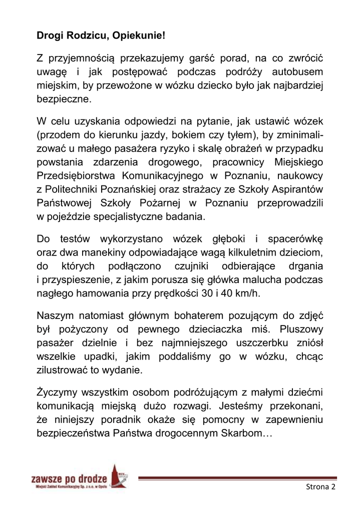 Drogi Rodzicu, Opiekunie! Z przyjemnością przekazujemy garść porad, na co zwrócić uwagę i jak postępować podczas podróży autobusem miejskim, by przewożone w wózku dziecko było jak najbardziej bezpieczne. W celu uzyskania odpowiedzi na pytanie, jak ustawić wózek (przodem do kierunku jazdy, bokiem czy tyłem), by zminimalizować u małego pasażera ryzyko i skalę obrażeń w przypadku powstania zdarzenia drogowego, pracownicy Miejskiego Przedsiębiorstwa Komunikacyjnego w Poznaniu, naukowcy z Politechniki Poznańskiej oraz strażacy ze Szkoły Aspirantów Państwowej Szkoły Pożarnej w Poznaniu przeprowadzili w pojeździe specjalistyczne badania. Do testów wykorzystano wózek głęboki i spacerówkę oraz dwa manekiny odpowiadające wagą kilkuletnim dzieciom, do których podłączono czujniki odbierające drgania i przyspieszenie, z jakim porusza się główka malucha podczas nagłego hamowania przy prędkości 30 i 40 km/h. Naszym natomiast głównym bohaterem pozującym do zdjęć był pożyczony od pewnego dzieciaczka miś. Pluszowy pasażer dzielnie i bez najmniejszego uszczerbku zniósł wszelkie upadki, jakim poddaliśmy go w wózku, chcąc zilustrować to wydanie. Życzymy wszystkim osobom podróżującym z małymi dziećmi komunikacją miejską dużo rozwagi. Jesteśmy przekonani, że niniejszy poradnik okaże się pomocny w zapewnieniu bezpieczeństwa Państwa drogocennym Skarbom… Strona 2 PRAWIDŁOWE WSIADANIE I WYSIADANIE Z WÓZKIEM Z AUTOBUSU Oczekując na przyjazd autobusu ustawiamy się z dzieckiem w miejscu widocznym dla kierowcy. Do pojazdu wózek wprowadzamy środkowymi drzwiami (oznaczone symbolem wózka dziecięcego, osoby na wózku inwalidzkim). Jeśli naciśniemy znajdujący się przy nich przycisk – kierowca autobusu (niskopodłogowego) otrzyma sygnał o konieczności obniżenia wejścia do pojazdu. Strona 3 Niezasygnalizowanie lub opóźnione wejście/wyjście do/z autobusu może spowodować przytrzaśnięcie wózka drzwiami. Wprawdzie pojazd małego pasażera nie ulegnie zniszczeniu, bo drzwi napotkawszy opór automatycznie „odbijają”, jednak towarzyszący temu hałas może wystraszyć maluszka, a śpiącego zbudzić, wywołując negatywne z autobusem skojarzenia. Strona 4 Zamiar opuszczenia pojazdu, w celu ułatwienia wyprowadzenia wózka, warto zasygnalizować przyciskiem z symbolem wózka inwalidzkiego umieszczonym na ścianie bocznej autobusu. W odróżnieniu od pozostałych przycisków „stop” znajdujących się w autobusie (przeważnie przy drzwiach) ten nie tylko informuje kierowcę o konieczności otwarcia drzwi, ale też o potrzebie obniżenia pojazdu. Pamiętajmy, że w przypadku dużego napełnienia autobusu kierowca z powodu ograniczonego pola widzenia może nie dostrzec wózka z dzieckiem i sygnał wydany przyciskiem innym, niż z symbolem wózka inwalidzkiego, potraktować jedynie jako komunikat o potrzebie otwarcia drzwi (bez obniżania pojazdu). Strona 5 Z autobusu wysiada zawsze jako pierwszy opiekun, następnie stojąc na zewnątrz wyprowadza TYŁEM wózek. Wypychanie wózka z pojazdu przodem może spowodować zaklinowanie się przednich kół między krawężnikiem a brzegiem autobusu, a w konsekwencji wypadnięcie dziecka. Strona 6 Przypominamy, iż miejsca dla osób z dzieckiem w wózku dziecięcym są w naszych autobusach wydzielone i oznaczone odpowiednim znakiem graficznym. W myśl zapisów § 12 Regulaminu przewozu w środkach transportu Miejskiego Zakładu Komunikacyjnego Sp. z o.o. w Opolu pasażerowie ci mają pierwszeństwo w zajmowaniu tych miejsc, a wszyscy pozostali są zobowiązani do ich zwolnienia na każde żądanie osoby uprawnionej. Pamiętajmy, że w granicach administracyjnych miasta Opola przejazd dzieci do lat 4 jest bezpłatny. Natomiast poza granicami administracyjnymi miasta dzieci do lat 6 korzystają z przejazdów ulgowych. W trakcie kontroli biletowej opiekun przedkłada dokument stwierdzający wiek dziecka, w szczególności dowód osobisty lub paszport (w przejazdach pozamiejskich aktualną legitymację przedszkolną lub szkolną wydaną przez placówkę oświatową według wzoru określonego rozporządzeniem właściwego ministra), a w przypadku ich braku składa stosowne oświadczenie. Strona 7 PRAWIDŁOWE USTAWIENIE WÓZKA GŁĘBOKIEGO PO WEJŚCIU DO AUTOBUSU WÓZEK GŁĘBOKI USTAWIAMY PRZODEM DO KIERUNKU JAZDY, TRZYMAMY GO ZA RĄCZKĘ I BLOKUJEMY KOŁA HAMULCEM Strona 8 Na gondolę wózka działa duży moment sił powodujący dociążenie kół przednich i odciążenie tylnych. Najczęściej koła przednie nie posiadają hamulca, a zatem nawet jeśli tylne koła będą zablokowane, to jeśli nie będziemy trzymać wózka pod wpływem siły hamującej odjedzie on i uderzy w najbliższą przeszkodę. Jeśli nie zablokujemy tylnych kół, to podczas gwałtownego hamowania wózek potoczy się do przodu z jeszcze większą prędkością. Na szczęście zarejestrowane w takiej sytuacji drgania są niewielkie. Strona 9 PRAWIDŁOWE USTAWIENIE WÓZKA SPACEROWEGO WÓZEK SPACEROWY USTAWIAMY TYŁEM DO KIERUNKU JAZDY, TRZYMAMY ZA RĄCZKĘ I BLOKUJEMY KOŁA HAMULCEM Strona 10 Testy wykazały, że wózek spacerowy najlepiej ustawić tyłem do kierunku jazdy. Podczas nagłego hamowania siła spowoduje przesunięcie się wózka mimo zaciągniętego hamulca. Zarejestrowane wartości przyspieszeń drgań dla tego przypadku były wyższe, niż w przypadku wózka głębokiego. U podstaw leży konstrukcja spacerówki – sztywna i nie amortyzująca drgań tak mocno, jak gondola. Szczęśliwie dziecko siedzące tyłem ma stabilizowaną główkę przez oparcie wózka, zatem prawdopodobieństwo wystąpienia urazów szyi podczas nagłego zdarzenia jest niewielkie. Bez względu na to, w jaki sposób ustawimy wózek w autobusie (często zajęcie optymalnej pozycji jest uniemożliwione przez zatłoczenie przestrzeni pasażerskiej) pamiętajmy, że zawsze należy zablokować koła hamulcem i warto trzymać poja
