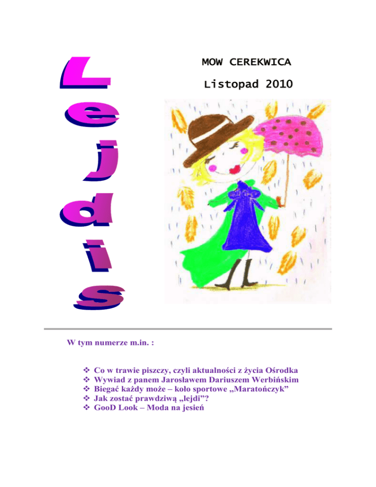 MOW CEREKWICA Listopad 2010 W tym numerze m.in. : Co w trawie piszczy, czyli aktualności z życia Ośrodka Wywiad z panem Jarosławem Dariuszem Werbińskim Biegać każdy może – koło sportowe ,,Maratończyk” Jak zostać prawdziwą „lejdi”? GooD Look – Moda na jesień HEJ DZIEWCZYNY! Witajcie w pierwszym powakacyjnym numerze „ Lejdis”. Niektóre z Was pewnie już się za nami stęskniły. Obiecujemy, że postaramy ukazywać się regularnie. Mamy nadzieję, że wyjdziemy naprzeciw Waszym oczekiwaniom. Liczymy na współpracę i Wasze uwagi. Oczekujemy również na twórcze pomysły, propozycje i uwagi dotyczące naszej gazetki. Nie musisz być poetą, aby u nas zaistnieć- wystarczy zapał i inwencja twórcza. Życzymy miłej lektury Ośrodkowa lista przebojów 1.Eminem - ,,No Love” 2.Rihanna – ,,Only Girl” 3.Remady – ,,Give Me A Sign” 4.Pewex – ,,Dziunia” 5.Usher – ,,Dj Got” 6.Eminem & Rihanna – ,,I Love The Way You Lie” 7.Inna – ,,Sun Is Up” 8.Robert M – ,,Super Bomb” 9.Shakira - ,,Waka Waka” 10.Monopol - ,,Lans” Ten numer „Lejdis” zredagował zespól w składzie: Martyna Cz., Małgosia Ś., Sara D., Beata S., pomocą i wparciem służyły panie: Ola Plucińska i Renata Plewińska 2 „Spotkanie wspomnieniowe o byłej Dyrektor Zakładu Wychowawczego w Cerekwicy - Małgorzacie Lissowskiej-Krzynowek” 19 października 2010r. na terenie naszego Ośrodka miała miejsce niecodzienna uroczystość. Z inicjatywy pan dyrektora - Marka Krzyżostaniaka i pani Juliany Krzynowek-Carlson odbyło się spotkanie upamiętniające sylwetkę byłej dyrektor placówki-panią Małgorzatę Lisowską-Krzynowek w pierwszą rocznicę jej śmierci. Na uroczystość przybyli licznie zaproszeni goście: wychowawcy, nauczyciele, dawni współpracownicy pani Małgorzaty. „ CHWYĆ BYKA ZA ROGI” W czwartek 28 października zmagałyśmy się z ortografią. Tego dnia odbyła się IV edycja pod hasłem "Chwyć byka za rogi"". Walczyłyśmy o tytuł "Torreadora ortografii". Pierwsze miejsce i tytuł Torreadora w roku szkolnym 2010/2011 zdobyła Sylwia M. Wybory do Samorządu Wychowanek Dnia 5 listopada odbyły się wybory do Rady Samorządu Wychowanek. Za uprawnionych do głosowania uznano zgodnie z Regulaminem Samorządu: wychowanki obecne w Ośrodku i pracowników pedagogicznych. Spośród uprawnionych 62 osób, do głosowania przystąpiło 47. Zanim doszło do głosowania, społeczność Ośrodka zapoznała się z programami wyborczymi kandydatek do SW, które zostały przedstawione w formie plakatów W wyniku wyborów do Rady Samorządu wybrane zostały: Kasia S., Ola R., Angelika L., Sandra T., Ewa P., Gosia Ś., Karolina Sz., Dominika P. Niedzielne wycieczki 3 Gdy zamknęły się za mną drzwi Ośrodka… …Było mi źle, ponieważ wiedziałam, że jestem daleko od domu i od swoich bliskich . Teraz już wiem, że jestem tu przez moją głupotę i myślę, że ludzie, którzy tu pracują (zwłaszcza wychowawcy z gr. 3) są tu po to, by mi pomóc zmienić moje zachowanie i stosunek do nauki i po to, by przygotować mnie do samodzielnego życia… Po upływie dwóch miesięcy mogę powiedzieć, że widać już pierwsze efekty naszej wspólnej pracy. Przede wszystkim wiem, że nie jestem tu za coś, tylko po coś. Małymi krokami zmieniam siebie, swoje zachowanie. Zwracam uwagę na kulturę osobistą, na to, by być miłą dla otaczających mnie ludzi, uczę się szacunku wobec pracy i trudu innych. Czuję ze to nie będzie zmarnowany czas… …Byłam bardzo skrępowana i wydawało mi się, że wszyscy zwracają za mnie szczególną uwagę . Teraz już mijają dwa miesiące odkąd tu jestem i mogę powiedzieć, że dobrze się tu czuję. Jedynie co bym chciała zmienić to odległość od domu. Myślę, że dzięki temu ośrodkowi zmienię swoje zachowanie na lepsze i stanę się bardziej dorosła . Dopiero tu zaczęłam myśleć jakich głupot i problemów narobiłam w domu, nie tylko zraniłam siebie robiąc źle, ale również rodziców ;( …Poczułam, że to nie jest moje miejsce, że znalazłam się tu przez własną głupotę , dlatego też powinnam się pokazać z jak najlepszej strony, przekonać wszystkich ( a przede wszystkim samą siebie ), że stać mnie na dużo więcej. Spodobało mi się to, że nikt na początku nas nie oceniał po tym, co robiłyśmy wcześniej – tylko wszystkie miałyśmy „czyste konto ‘’. To tak jakby zaczynało się nowe życie ;) 4 … Zaczęłam tęsknić za domem. A w głowie kołatała jedna myśl: ucieczka. Ale także zaczęłam żałować tego, co robiłam wcześniej, chciałam cofnąć czas, ale to było nierealne. Myślałam, że to wszystko mi się śni, ale to była jawa. Raz spróbowałam uciec…teraz wiem, że to nie jest żadne rozwiązanie. Jestem tu i póki co nigdzie się (samowolnie) nie wybieram ; ) …. Nie pamiętam już co poczułam, bo było to dwa miesiące temu . A nie mam tak długiej pamięci Sorry ;) Ale ogólnie jest Okej ;) … Przekraczając mury tego ośrodka czułam się bardzo źle ponieważ nie wiedziałam co tu robię. Czułam, że popełniłam jakiś błąd w moim życiu i że teraz, dzięki temu ośrodkowi moje życie się zmieni na lepsze. Tak więc wchodząc do ośrodka czułam lekki strach z przygnębieniem i smutkiem. A wokół mnie pełno nowych twarzy. Teraz w mojej grupie bardzo dobrze się czuje i chciałabym, żeby już tak zostało… … Czułam strach, bo nie wiedziałam co może mnie tu spotkać. Kiedy wysiadałam z konwoju byłam załamana i zapłakana ponieważ nie miałam pojęcia co dalej będzie ze mną i tęskniłam za rodziną. Gdy weszłam do ośrodka to się bałam, że dziewczyny mnie nie zaakceptują. Czułam smutek i przygnębienie. Teraz, gdy się tutaj znajduje to nie czuje się aż tak źle ponieważ trochę się przyzwyczaiłam, ale nadal tęsknię za rodziną. Jest mi tu dobrze, bo przynajmniej mam dach nad głową i jest przytulnie. A jak tu przy