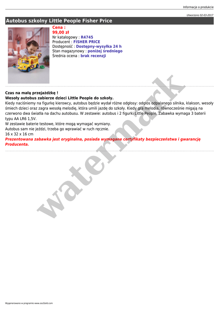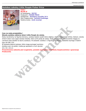 Informacje o produkcie Utworzono 02-03-2017 Autobus szkolny Little People Fisher Price Cena : 99,00 zł er m ar k Nr katalogowy : R4745 Producent : FISHER PRICE Dostępność : Dostępny-wysyłka 24 h Stan magazynowy : poniżej średniego Średnia ocena : brak recenzji w at Czas na małą przejażdżkę ! Wesoły autobus zabierze dzieci Little People do szkoły. Kiedy naciśniemy na figurkę kierowcy, autobus będzie wydał różne odgłosy: odgłos odpalanego silnika, klakson, wesoły śmiech dzieci oraz zagra wesołą melodię, która umili jazdę do szkoły. Kiedy gra melodia, równocześnie migają na czerwono dwa światła na dachu autobusu. W zestawie: autobus i 2 figurki Little People. Zabawka wymaga 3 baterii typu AA LR6 1,5V. W zestawie baterie testowe, które mogą wymagać wymiany. Autobus sam nie jeździ, trzeba go wprawiać w ruch ręcznie. 16 x 32 x 16 cm Prezentowana zabawka jest oryginalna, posiada wymagane certyfikaty bezpieczeństwa i gwarancję Producenta. Wygenerowano w programie www.oscGold.com