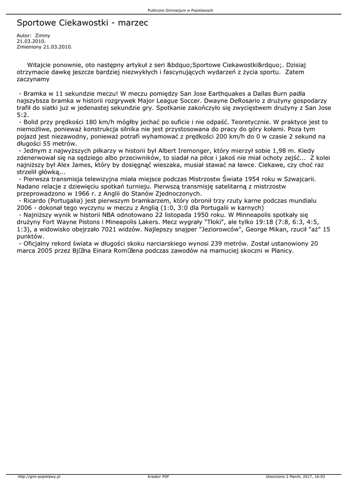 Publiczne Gimnazjum w Popielawach Sportowe Ciekawostki - marzec Autor: Zimny 21.03.2010. Zmieniony 21.03.2010. Witajcie ponownie, oto następny artykuł z seri „Sportowe Ciekawostki”. Dzisiaj otrzymacie dawkę jeszcze bardziej niezwykłych i fascynujących wydarzeń z życia sportu. Zatem zaczynamy - Bramka w 11 sekundzie meczu! W meczu pomiędzy San Jose Earthquakes a Dallas Burn padła najszybsza bramka w historii rozgrywek Major League Soccer. Dwayne DeRosario z drużyny gospodarzy trafił do siatki już w jedenastej sekundzie gry. Spotkanie zakończyło się zwycięstwem drużyny z San Jose 5:2. - Bolid przy prędkości 180 km/h mógłby jechać po suficie i nie odpaść. Teoretycznie. W praktyce jest to niemożliwe, ponieważ konstrukcja silnika nie jest przystosowana do pracy do góry kołami. Poza tym pojazd jest niezawodny, ponieważ potrafi wyhamować z prędkości 200 km/h do 0 w czasie 2 sekund na długości 55 metrów. - Jednym z najwyższych piłkarzy w historii był Albert Iremonger, który mierzył sobie 1,98 m. Kiedy zdenerwował się na sędziego albo przeciwników, to siadał na piłce i jakoś nie miał ochoty zejść... Z kolei najniższy był Alex James, który by dosięgnąć wieszaka, musiał stawać na ławce. Ciekawe, czy choć raz strzelił główką... - Pierwsza transmisja telewizyjna miała miejsce podczas Mistrzostw Świata 1954 roku w Szwajcarii. Nadano relacje z dziewięciu spotkań turnieju. Pierwszą transmisję satelitarną z mistrzostw przeprowadzono w 1966 r. z Anglii do Stanów Zjednoczonych. - Ricardo (Portugalia) jest pierwszym bramkarzem, który obronił trzy rzuty karne podczas mundialu 2006 - dokonał tego wyczynu w meczu z Anglią (1:0, 3:0 dla Portugalii w karnych) - Najniższy wynik w historii NBA odnotowano 22 listopada 1950 roku. W Minneapolis spotkały się drużyny Fort Wayne Pistons i Mineapolis Lakers. Mecz wygrały "Tłoki", ale tylko 19:18 (7:8, 6:3, 4:5, 1:3), a widowisko obejrzało 7021 widzów. Najlepszy snajper "Jeziorowców", George Mikan, rzucił "aż" 15 punktów. - Oficjalny rekord świata w długości skoku narciarskiego wynosi 239 metrów. Został ustanowiony 20 marca 2005 przez Bjørna Einara Romørena podczas zawodów na mamuciej skoczni w Planicy. http://gim-popielawy.pl Kreator PDF Utworzono 2 March, 2017, 16:03