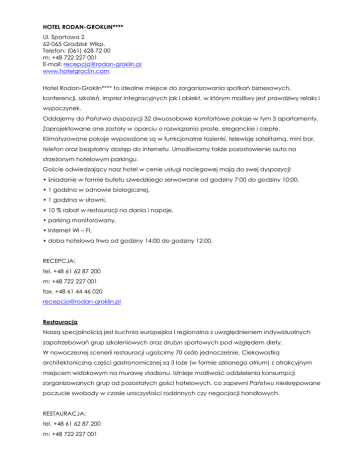 HOTEL RODAN-GROKLIN**** Ul. Sportowa 2 62-065 Grodzisk Wlkp. Telefon: (061) 628 72 00 m: +48 722 227 001 E-mail: [email protected] www.hotelgroclin.com Hotel Rodan-Groklin**** to idealne miejsce do zorganizowania spotkań biznesowych, konferencji, szkoleń, imprez integracyjnych jak i obiekt, w którym możliwy jest prawdziwy relaks i wypoczynek. Oddajemy do Państwa dyspozycji 32 dwuosobowe komfortowe pokoje w tym 3 apartamenty. Zaprojektowane one zostały w oparciu o rozwiązania proste, eleganckie i ciepłe. Klimatyzowane pokoje wyposażone są w funkcjonalne łazienki, telewizję satelitarną, mini bar, telefon oraz bezpłatny dostęp do internetu. Umożliwiamy także pozostawienie auta na strzeżonym hotelowym parkingu. Goście odwiedzający nasz hotel w cenie usługi noclegowej mają do swej dyspozycji: • śniadanie w formie bufetu szwedzkiego serwowane od godziny 7:00 do godziny 10:00. • 1 godzina w odnowie biologicznej, • 1 godzina w siłowni, • 10 % rabat w restauracji na dania i napoje, • parking monitorowany, • Internet WI – FI, • doba hotelowa trwa od godziny 14:00 do godziny 12:00. RECEPCJA: tel. +48 61 62 87 200 m: +48 722 227 001 fax. +48 61 44 46 020 [email protected] Restauracja Naszą specjalnością jest kuchnia europejska i regionalna z uwzględnieniem indywidualnych zapotrzebowań grup szkoleniowych oraz drużyn sportowych pod względem diety. W nowoczesnej scenerii restauracji ugościmy 70 osób jednocześnie. Ciekawostką architektoniczną części gastronomicznej są 3 loże (w formie szklanego atrium) z atrakcyjnym miejscem widokowym na murawę stadionu. Istnieje możliwość oddzielenia konsumpcji zorganizowanych grup od pozostałych gości hotelowych, co zapewni Państwu nieskrępowane poczucie swobody w czasie uroczystości rodzinnych czy negocjacji handlowych. RESTAURACJA: tel. +48 61 62 87 200 m: +48 722 227 001 Sala konferencyjna Z myślą o wymaganiach klienta przygotowaliśmy specjalną ofertę konferencyjną. Do dyspozycji Państwa oddajemy: DUŻĄ SALĘ KONFERENCYJNĄ (do 100 osób) (ze ścianami przesuwnymi – możliwość podziału na 2 niezależne sale) Wynajęcie wraz z wyposażeniem* 70 PLN / 1h, powyżej 7h – 600 PLN * wyposażenie dużej sali obejmuje: projektor multimedialny Hitach CPX 885, wizualizer, ekran rozwijany elektrycznie, odtwarzacz DVD, monitor plazmowy, system wielokonferencyjny Polyspan, nagłośnienie dwóch niezależnych sal konferencyjnych mikrofonami bezprzewodowymi. 2 MNIEJSZE SALE KONFERENCYJNE (do 20 osób) W mniejszych salach proponujemy ustawienie kinowe lub przy jednym wspólnym stole. 50 PLN / 1h,powyżej 3h – 250 PLN Specjalna promocja dla Państwa firmy: • Przy organizacji konferencji powyżej 15 osób z noclegiem i lunchem – 1 dzień wynajmu Sali GRATIS! • Konferencja z lunchem powyżej 15 osób – Godzina gry w kręgle GRATIS! Zapraszamy! Odnowa biologiczna Miłośnikom odnowy biologicznej służymy serwisem 24 h. W centrum Odnowy Biologicznej mamy jacuzzi, łaźnie parową, saunę suchą, bicze szkockie, beczka schładzająca oraz profesjonalnie wyposażona siłownię. Do dyspozycji gości oddajemy Klinikę Zdrowia, gdzie można skorzystać z krioterapii. Serdecznie polecamy masaże w hotelowych gabinetach. Od sportowych poprzez rehabilitacyjne, skończywszy na relaksacyjnych oraz masażach kamieniami bazaltowymi. Hotelowa siłownia to bardzo dobrze i profesjonalnie wyposażone miejsce gdzie można zadbać o kondycje i sprawność fizyczną. Wszyscy goście hotelowi mogą z niej korzystać bez ograniczeń. RECEPCJA: tel. +48 61 62 87 200 m: +48 722 227 001 fax. +48 61 44 46 020 [email protected] Klub Hotelowy Do Państwa dyspozycji oddajemy bowling, czyli popularne i lubiane kręgle. Mieści do 40 osób. Doskonałe miejsce na zabawę w atmosferze rywalizacji: sale do bowlingu wyposażoną w 4 profesjonalne tory i skomputeryzowany system naliczana punktów. Gra w kręgle to aktywna forma spędzenia wolnego czasu zarówno dla całych rodzin jak i dla zorganizowanych grup przebywających na szkoleniach czy konferencjach. W pomieszczeniu kręgielni znajduje się także bilard i drink bar ze stolikami. Wystrój wnętrza utrzymany jest w konwencji Klubu Kibica, pełnym pamiątkowych zdjęć i trofeów, dzięki czemu Goście czują się tu doskonale, na co wpływ ma również dobra muzyka w połączeniu z profesjonalnym oświetleniem. W bezpośrednim sąsiedztwie bowlingu znajduje się Ogródek Grillowy - to doskonała alternatywa dla osób, które chcą zorganizować dla swoich przyjaciół i rodziny dobrą zabawę na świeżym powietrzu. 50 miejsc pod parasolami, bezpośredni dostęp do bowlingu i pysznych drinków serwowanych przez naszych barmanów. Istnieje również możliwość zorganizowania karaoke, imprezy z DJ, meczu piłkarskiego na boisku z podgrzewaną płytą główną oraz skorzystania z kortów tenisowych pod okiem trenera. Oferujemy Państwu organizację dodatkowych atrakcji w formie imprezy integracyjnej m.in.: • przejazdy bryczką lub saniami, • quady, • paintball, • loty balonem, • kasyno, • przejażdżki z kierowcami rajdowymi itp. Proszę zgłosić swoje potrzeby, a my przygotujemy dla Państwa ofertę pobytu wraz z dodatkowymi atrakcjami. BOWLING: tel. +48 61 62 87 408 m: +48 722 227 001 Korty tenisowe Na amatorów aktywnego wypoczynku czekają 4 korty tenisowe o nawierzchni ze sztucznej trawy (w zimie kryte balonową kopułą) i boisko piłkarskie. Sportowe zmagania można śledzić ze specjalnej trybuny. Przylega do niej kawiarenka – świetna enklawa regeneracji po wysiłku. Najwyższy standard Państwa wypoczynku zapewnią znakomici trenerzy, masażyści, lekarze oraz fizjoterapeuci. KORTY TENISOWE: tel. +48 519 079 017 [email protected]