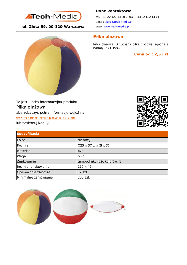 Dane kontaktowe tel. +48 22 122 13 00 , fax. +48 22 122 13 01 email: [email protected] ul. Złota 59, 00-120 Warszawa www: www.tech-media.pl Piłka plażowa Piłka plażowa. Dmuchana piłka plażowa, zgodna z normą EN71. PVC. Cena od : 2,51 zł To jest ulotka informacyjna produktu: Piłka plażowa, aby zobaczyć pełną informację wejdź na: www.tech-media.pl/pika,plaowa,016977.html lub zeskanuj kod QR. Specyfikacja Kolor teczowy Rozmiar Ø25 x 37 cm (Ś x D) Materiał pvc Waga 60 g Znakowanie tampodruk, ilość kolorów: 1 Rozmiar znakowania 110 x 42 mm Opakowanie zbiorcze 12 szt. Minimalne zamówienie 200 szt.
