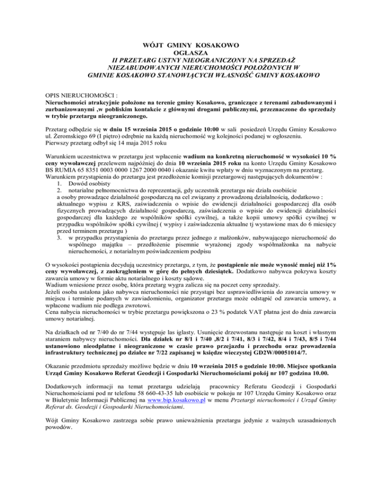 WÓJT GMINY KOSAKOWO OGŁASZA II PRZETARG USTNY NIEOGRANICZONY NA SPRZEDAŻ NIEZABUDOWANYCH NIERUCHOMOŚCI POŁOŻONYCH W GMINIE KOSAKOWO STANOWIĄCYCH WŁASNOŚĆ GMINY KOSAKOWO OPIS NIERUCHOMOŚCI : Nieruchomości atrakcyjnie położone na terenie gminy Kosakowo, graniczące z terenami zabudowanymi i zurbanizowanymi ,w pobliskim kontakcie z głównymi drogami publicznymi, przeznaczone do sprzedaży w trybie przetargu nieograniczonego. Przetarg odbędzie się w dniu 15 września 2015 o godzinie 10:00 w sali posiedzeń Urzędu Gminy Kosakowo ul. Żeromskiego 69 (I piętro) odrębnie na każdą nieruchomość wg kolejności podanej w ogłoszeniu. Pierwszy przetarg odbył się 14 maja 2015 roku Warunkiem uczestnictwa w przetargu jest wpłacenie wadium na konkretną nieruchomość w wysokości 10 % ceny wywoławczej przelewem najpóźniej do dnia 10 września 2015 roku na konto Urzędu Gminy Kosakowo BS RUMIA 65 8351 0003 0000 1267 2000 0040 i okazanie kwitu wpłaty w dniu wyznaczonym na przetarg. Warunkiem przystąpienia do przetargu jest przedłożenie komisji przetargowej następujących dokumentów : 1. Dowód osobisty 2. notarialne pełnomocnictwa do reprezentacji, gdy uczestnik przetargu nie działa osobiście a osoby prowadzące działalność gospodarczą na cel związany z prowadzoną działalnością, dodatkowo : aktualnego wypisu z KRS, zaświadczenia o wpisie do ewidencji działalności gospodarczej dla osób fizycznych prowadzących działalność gospodarczą, zaświadczenia o wpisie do ewidencji działalności gospodarczej dla każdego ze wspólników spółki cywilnej, a także kopii umowy spółki cywilnej w przypadku wspólników spółki cywilnej ( wypisy i zaświadczenia aktualne tj wystawione max do 6 miesięcy przed terminem przetargu ) 3. w przypadku przystąpienia do przetargu przez jednego z małżonków, nabywającego nieruchomość do wspólnego majątku – przedłożenie pisemnie wyrażonej zgody współmałżonka na nabycie nieruchomości, z notarialnym poświadczeniem podpisu O wysokości postąpienia decydują uczestnicy przetargu, z tym, że postąpienie nie może wynosić mniej niż 1% ceny wywoławczej, z zaokrągleniem w górę do pełnych dziesiątek. Dodatkowo nabywca pokrywa koszty zawarcia umowy w formie aktu notarialnego i koszty sądowe. Wadium wniesione przez osobę, która przetarg wygra zalicza się na poczet ceny sprzedaży. Jeżeli osoba ustalona jako nabywca nieruchomości nie przystąpi bez usprawiedliwienia do zawarcia umowy w miejscu i terminie podanych w zawiadomieniu, organizator przetargu może odstąpić od zawarcia umowy, a wpłacone wadium nie podlega zwrotowi. Cena nabycia nieruchomości w trybie przetargu powiększona o 23 % podatek VAT płatna jest do dnia zawarcia umowy notarialnej. Na działkach od nr 7/40 do nr 7/44 występuje las iglasty. Usunięcie drzewostanu następuje na koszt i własnym staraniem nabywcy nieruchomości. Dla działek nr 8/1 i 7/40 ,8/2 i 7/41, 8/3 i 7/42, 8/4 i 7/43, 8/5 i 7/44 ustanowiono nieodpłatne i nieograniczone w czasie prawo przejazdu i przechodu oraz prowadzenia infrastruktury technicznej po działce nr 7/22 zapisanej w księdze wieczystej GD2W/00051014/7. Okazanie przedmiotu sprzedaży możliwe będzie w dniu 10 września 2015 o godzinie 10:00. Miejsce spotkania Urząd Gminy Kosakowo Referat Geodezji i Gospodarki Nieruchomościami pokój nr 107 godzina 10.00. Dodatkowych informacji na temat przetargu udzielają pracownicy Referatu Geodezji i Gospodarki Nieruchomościami pod nr telefonu 58 660-43-35 lub osobiście w pokoju nr 107 Urzędu Gminy Kosakowo oraz w Biuletynie Informacji Publicznej na www.bip.kosakowo.pl w menu Przetargi nieruchomości i Urząd Gminy Referat ds. Geodezji i Gospodarki Nieruchomościami. Wójt Gminy Kosakowo zastrzega sobie prawo unieważnienia przetargu jedynie z ważnych uzasadnionych powodów. WYKAZ NIERUCHOMOŚCI STANOWIĄCYCH WŁASNOŚĆ GMINY KOSAKOWO PRZEZNACZONYCH DO SPRZEDAŻY W DRODZE I PRZETARGU USTNEGO NIEOGRANICZONEGO w dniu 10 września 2015r. Przeznaczenie w Cena 1 Cena Minimalne Wadium Oznac Pow KW Obręb miejscowym m2 ustalona postąpienie UWAGI 10% ceny zenie ierz planie ustalon przez Wójta 1% ceny wywoławcze nieru chni zagospodarowani a przez Gminy wywoławcz jz chomo a a przestrzennego biegłeg Kosakowo ej zaokrągleni ści gminy Kosakowo oi jako cena zaokrąglon em w górę działka Wójta wywoławcza ej w górę do pełnego nr Gminy do pełnych złotego Kosak dziesiątek złotych owo w zł 1/1 1005 GD2W/00 018041/2 Kosakowo 1/3 1005 Kosakowo 1/4 1018 1/8 1017 GD2W/00 018041/2 GD2W/00 018041/2 GD2W/00 018041/2 157,94 157.700,00 1.580,00 15.770,00 157,94 157.700,00 1.580,00 15.770,00 157,94 160.800,00 1.610,00 16.080,00 157,94 160.800,00 1.610,00 16.080,00 1/26 1069 Kosakowo 1/30 1360 GD2W/00 018041/2 GD2W/00 018041/2 157,94 167.300,00 1.680,00 16.730,00 157,94 214.800,00 2.150,00 21.480,00 8/1 7/40 165 640 GD2W/00 018041/2 GD2W/00 048617/2 Kosakowo Kosakowo 146,32 117.800,00 1.180,00 11.780,00 8/2 194 Kosakowo Kosakowo 7/41 609 GD2W/00 018041/2 GD2W/00 048618/7 146,32 117.500,00 1.180,00 11.750,00 8/3 228 7/42 576 GD2W/00 018041/2 GD2W/00 048622/8 Kosakowo Kosakowo 146,32 117.600,00 1.180,00 11.760,00 8/4 263 GD2W/00 018041/2 GD2W/00 048623/5 Kosakowo Kosakowo 146,32 117.600,00 1.180,00 11.760,00 7/43 541 8/5 301 GD2W/00 018041/2 GD2W/00 048624/2 Kosakowo Kosakowo 146,32 117.600,00 1.180,00 11.760,00 7/44 503 406/2 1070 GD2W/00 002823/3 Dębogórze 88,66 94.900,00 950,00 9.490,00 407/3 836 GD2W/00 002823/3 Dębogórze 88,66 74.100,00 750,00 7.410,00 16 184 GD2W/00 019373/5 Pierwoszyno 208,02 38.300,00 390,00 3.830,00 Kosakowo Kosakowo Kosakowo 58.U,MN - teren zabudowy usługowej nieuciążliwej, występującej samodzielnie lub z mieszkaniem 56.MN - teren zabudowy mieszkaniowej jednorodzinnej wolnostojącej, bliźniaczej 62.U,MN – teren zabudowy usługowej nieuciążliwej, występującej samodzielnie lub z mieszkaniem 7. MN – teren zabudowy mieszk