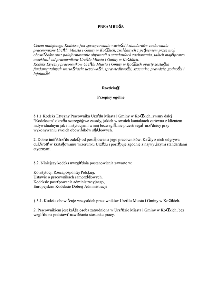 PREAMBUŁA Celem niniejszego Kodeksu jest sprecyzowanie wartości i standardów zachowania pracowników Urzędu Miasta i Gminy w Końskich, związanych z pełnieniem przez nich obowiązków oraz poinformowanie obywateli o standardach zachowania, jakich mają prawo oczekiwać od pracowników Urzędu Miasta i Gminy w Końskich. Kodeks Etyczny pracowników Urzędu Miasta i Gminy w Końskich oparty został na fundamentalnych wartościach: uczciwości, sprawiedliwości, szacunku, prawdzie, godności i lojalności. Rozdział I Przepisy ogólne § 1.1 Kodeks Etyczny Pracownika Urzędu Miasta i Gminy w Końskich, zwany dalej "Kodeksem" określa szczegółowe zasady, jakich w swoich kontaktach zarówno z klientem indywidualnym jak i instytucjami winni bezwzględnie przestrzegać urzędnicy przy wykonywaniu swoich obowiązków służbowych. 2. Dobre imię Urzędu zależy od postępowania jego pracowników. Każdy z nich odgrywa dużą rolę w kształtowaniu wizerunku Urzędu i postępuje zgodnie z najwyższymi standardami etycznymi. § 2. Niniejszy kodeks uwzględnia postanowienia zawarte w: Konstytucji Rzeczpospolitej Polskiej, Ustawie o pracownikach samorządowych, Kodeksie postępowania administracyjnego, Europejskim Kodeksie Dobrej Administracji § 3.1. Kodeks obowiązuje wszystkich pracowników Urzędu Miasta i Gminy w Końskich. 2. Pracownikiem jest każda osoba zatrudniona w Urzędzie Miasta i Gminy w Końskich, bez względu na podstawę nawiązania stosunku pracy. Rozdział II Zasady postępowania pracownika samorządowego § 4.1. Pracownik wykonuje swoje obowiązki rzetelnie i profesjonalnie wykorzystując posiadaną wiedzę i doświadczenie. Wykonując swoją pracę, ma na względzie dobro wspólnoty samorządowej i zwiększenie zaufania społeczeństwa do władz samorządowych. 2. Pracownik rozwija swoje kompetencje oraz pogłębia wiedzę, aby jak najlepiej wykonywać powierzoną mu pracę. § 5.1. Pracownik zwraca uwagę na to, aby wszelkie działania i decyzje były zgodne z powszechnie obowiązującym prawem. Jest przygotowany do merytorycznego uzasadnienia podejmowanych decyzji. 2. Pracownik działa zgodnie z normami proceduralnymi i kompetencyjnymi wynikającymi z przepisów dotyczących funkcjonowania Urzędu Miasta i Gminy. § 6.1. Pracownik działa uczciwie, bezstronnie i niezależnie, powstrzymując się od wszelkich arbitralnych działań, które mogą mieć negatywny wpływ na sytuację pojedynczych osób. 2. Na postępowanie pracownika nie może mieć wpływu interes osobisty ani presja polityczna. 3. Pracownik wykonuje swoją pracę tak, by jego działania były wolne od podejrzeń o interesowność i korupcję. Nie podejmuje zadań, które kolidują z obowiązkami służbowymi, nie wykorzystuje kontaktów służbowych dla własnych korzyści. § 7. W toku podejmowanych decyzji pracownik bada dokładnie stan faktyczny sprawy. Uwzględnia wszystkie znane okoliczności i przypisuje im należne znaczenie. § 8. Przy rozpatrywaniu wniosków i podejmowaniu decyzji, klienci są traktowani w sposób równy, bez względu na płeć, narodowość, rasę, religię lub wyznanie, przekonania polityczne, wiek, niepełnosprawność, czy stopień zamożności. § 9.1. W razie potrzeby pracownik służy klientowi fachową poradą dotyczącą sposobu postępowania w sprawie wchodzącej w zakres jego działania, lub kieruje go do właściwego wydziału. 2. Pracownik udziela klientowi informacji dotyczących jego praw i obowiązków wynikających z przepisów prawa § 10.1. W swoich kontaktach z klientem pracownik jest uprzejmy i życzliwy. Przy załatwianiu spraw stara się być pomocny. Na skierowane do niego pytania udziela odpowiedzi w sposób rzeczowy i wyczerpujący. 2. W przypadku popełnienia błędu naruszającego prawo lub interes klienta, pracownik przeprasza za naruszenie i stara się skorygować negatywne skutki popełnionego przez siebie błędu. § 11. Pracownik zobowiązany jest do zachowania tajemnicy informacji uzyskanych podczas wykonywania czynności służbowych. Nie może wykorzystywać tych informacji dla osiągnięcia osobistych korzyści, choćby nie były one objęte ochroną na mocy odrębnych przepisów. Rozdział III Informacja o Kodeksie § 12.1.Treść Kodeksu otrzymują pracownicy Urzędu Miasta i Gminy w Końskich. 2. Wszyscy pracownicy Urzędu zobowiązani są do przestrzegania i stosowania zasad zawartych w Kodeksie. § 13. Kodeks zostanie udostępniony w formie elektronicznej na głównej stronie portalu internetowego oraz rozprowadzony w postaci broszury wśród obywateli. § 14. Niniejszy kodeks wchodzi w życie z dniem 1 września 2005 r. po zakończeniu procesu konsultacji i przyjęciu jego tekstu przez pracowników Urzędu Miasta i Gminy w Końskich.