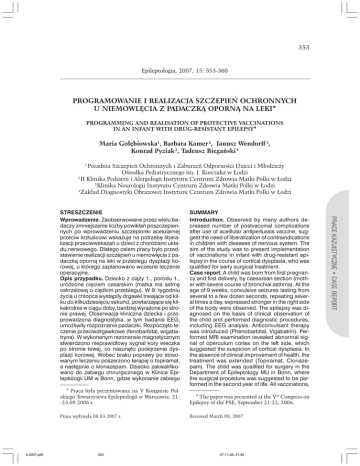 353 Epileptologia, 2007, 15: 353-360 PROGRAMOWANIE I REALIZACJA SZCZEPIEŃ OCHRONNYCH U NIEMOWLĘCIA Z PADACZKĄ OPORNĄ NA LEKI** PROGRAMMING AND REALISATION OF PROTECTIVE VACCINATIONS IN AN INFANT WITH DRUG-RESISTANT EPILEPSY * Maria Gołębiowska1, Barbara Kamer 2, Janusz Wendorff 3, Konrad Pyziak 2, Tadeusz Biegański 4 1 Poradnia Szczepień Ochronnych i Zaburzeń Odporności Dzieci i Młodzieży Ośrodka Pediatrycznego im. J. Korczaka w Łodzi 2 II Klinika Pediatrii i Alergologii Instytutu Centrum Zdrowia Matki Polki w Łodzi 3 Klinika Neurologii Instytutu Centrum Zdrowia Matki Polki w Łodzi 4 Zakład Diagnostyki Obrazowej Instytutu Centrum Zdrowia Matki Polki w Łodzi SUMMARY Wprowadzenie. Zaobserwowane przez wielu badaczy zmniejszenie liczby powikłań poszczepiennych po wprowadzeniu szczepionki acelularnej przeciw krztuścowi wskazuje na potrzebę liberalizacji przeciwwskazań u dzieci z chorobami układu nerwowego. Dlatego celem pracy było przedstawienie realizacji szczepień u niemowlęcia z padaczką oporną na leki w przebiegu dysplazji korowej, u którego zaplanowano wczesne leczenie operacyjne. Opis przypadku. Dziecko z ciąży 1., porodu 1., urodzone cięciem cesarskim (matka ma astmę oskrzelową o ciężkim przebiegu). W 9. tygodniu życia u chłopca wystąpiły drgawki trwające od kilku do kilkudziesięciu sekund, powtarzające się kilkakrotnie w ciągu doby, bardziej wyrażone po stronie prawej. Obserwacja kliniczna dziecka i przeprowadzona diagnostyka, w tym badanie EEG, umożliwiły rozpoznanie padaczki. Rozpoczęto leczenie przeciwdrgawkowe (fenobarbital, wigabatryna). W wykonanym rezonansie magnetycznym stwierdzono nieprawidłowy sygnał kory wieczka po stronie lewej, co nasunęło podejrzenie dysplazji korowej. Wobec braku poprawy po stosowanym leczeniu poszerzono terapię o topiramat, a następnie o klonazepam. Dziecko zakwalifikowano do zabiegu chirurgicznego w Klinice Epileptologii UM w Bonn, gdzie wykonanie zabiegu Introduction. Observed by many authors decreased number of postvaccinal complications after use of acelllular antipertussis vaccine, suggest the need of liberalization of contraindications in children with diseases of nervous system. The aim of the study was to present implementation of vaccinations in infant with drug-resistant epilepsy in the course of cortical dysplasia, who was qualified for early surgical treatment. Case report. A child was born from first pregnancy and first delivery, by caesarean section (mother with severe course of bronchial asthma). At the age of 9 weeks, convulsive seizures lasting from several to a few dozen seconds, repeating several times a day, expressed stronger in the right side of the body were observed. The epilepsy was diagnosed on the basis of clinical observation of the child and performed diagnostic procedures, including EEG analysis. Anticonvulsant therapy was introduced (Phenobarbital, Vigabatrin). Performed MRI examination revealed abnormal signal of operculum cortex on the left side, which suggested the suspicion of cortical dysplasia. In the absence of clinical improvement of health, the treatment was extended (Topiramat, Clonazepam). The child was qualified for surgery in the Department of Epileptology MU in Bonn, where the surgical procedure was suggested to be performed in the second year of life. All vaccinations, * Praca była prezentowana na V Kongresie Polskiego Towarzystwa Epileptologii w Warszawie, 21-23.09.2006 r. * The paper was presented at the Vth Congress on Epilepsy of the PSE, September 21-23, 2006. Praca wpłynęła 08.03.2007 r. Received March 08, 2007. 353 07-11-26, 21:48 PRACE KAZUISTYCZNE • CASE REPORT 4-2007.p65 STRESZCZENIE 354 Maria Gołębiowska i wsp. przesunięto na 2. rż. Wszystkie szczepienia, w tym przeciwkrztuścowe szczepionką acelularną, wykonano pod osłoną leków przeciwgorączkowych i przeciwdrgawkowych. U dziecka nie obserwowano odczynów poszczepiennych oprócz nieznacznego krótkotrwałego podwyższenia temperatury ciała. Wnioski. Kwalifikacja do szczepień ochronnych powinna być indywidualna dla każdego dziecka, a ogólne wytyczne powinny być bardziej liberalne w stosunku do szczepień u dzieci z padaczką. including anti-pertussis acellular one, were performed under the cover of antipyretic and anticonvulsant drugs. Except insignificant, transient increase of body temperature, there were no postvaccinal adverse events observed. Conclusions. The qualification for vaccinations should be individually reconsidered, and general directives regarding vaccinations in children with epilepsy should be more liberal. Key words: Vaccinations – Drug-resistant epilepsy – Infants Słowa kluczowe: Szczepienia – Padaczka oporna na leki – Niemowlę WPROWADZENIE PRACE KAZUISTYCZNE • CASE REPORTS R 4-2007.p65 ealizacja szczepień ochronnych u dzieci z chorobami ośrodkowego układu nerwowego, w tym z padaczką, od wielu lat jest kontrowersyjnym tematem naukowych dyskusji pediatrów i neurologów dziecięcych (Kimura i Kuno-Sakai, 1988; Ignatowicz i Jóźwiak, 2001; Bernatowska, 2004; Bernatowska, 2006). Choroby układu nerwowego są jedną z najczęstszych przyczyn odroczeń szczepień ochronnych i zwolnień z nich. Przez wielu autorów opisywane są powikłania poszczepienne, które mogą zaostrzać przebieg choroby podstawowej (Stetler i wsp., 1985; Wyllie, 1993; Schupper i Shuper, 2007; Lapatsanis i Lapatsanis, 2007). Jednak wraz z rozwojem nauk medycznych oraz licznymi w piśmiennictwie doniesieniami dotyczącymi niepożądanych objawów poszczepiennych liczba wskazań do zwolnień ze szczepień stale maleje (Ignatowicz i Jóźwiak, 2001; Bernatowska, 2004). U dzieci z padaczką największe kontrowersje budzi szczepienie przeciw krztuścowi, które jest uznawane za przyczynę licznych powikłań. Należą do nich zarówno reakcje miejscowe, jak i uogólnione, takie jak gorączka, nadmierna senność, rozdrażnienie, uogólniona hipo- 354 tonia czy też drgaw