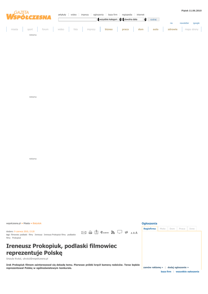 Piątek 11.06.2010 artykuły wideo imprezy ogłoszenia baza firm wszystkie kategorie regiopedia internet dowolna data rss miasta sport forum wideo foto imprezy biznes praca dom auto zdrowie newsletter igoogle mapa strony reklama reklama reklama Ogłoszenia wspolczesna.pl » Miasta » Białystok Regiofirma dodano: 9 czerwca 2010, 13:20 tagi: filmowiec podlaski filmy Ireneusz Ireneusz Prokopiuk filmy podlaskie Moto Dom Praca Inne AAA filmy Prokopiuk Ireneusz Prokopiuk, podlaski filmowiec reprezentuje Polskę Urszula Krutul, [email protected] Irek Prokopiuk filmem zainteresował się dekadę temu. Pierwsze próbki kręcił kamerą rodziców. Teraz będzie reprezentował Polskę w ogólnoświatowym konkursie. zamów reklamę » | dodaj ogłoszenie » baza firm | wszystkie ogłoszenia baza firm | wszystkie ogłoszenia Białystok Karolina Chorzewska, białostoczanka, to pierwsza, najlepsza studentka z Marynarki Wojennej (wideo) Karambol na wiadukcie Dąbrowskiego. Samochody uderzały w siebie, jeden za drugim Prawybory prezydenckie na uczelniach. Sprawdź, jak głosowali studenci Paweł zmarł z nożem wbitym w serce REKLAMA: I MIĘDZYNARODOWA GALA SPORTÓW WALKI MMA w Białymstoku Były upały, ulewy i podtopienia. Zobacz, jak będzie w weekend (zdjęcia) Sensacja! W białostockim kościele znaleziono szczątki ks. Jerzego Popiełuszki – Mój film to dokument ukazujący przede wszystkim emocje – mówi Irek Prokopiuk. – Białorusini naprawdę walczą o demokrację. A ich historia to siła tego filmu. Filmowiec pochodzi z Bielska Podlaskiego. Jednak od wielu lat mieszka w Białymstoku. To z nim jest filmowo związany i to tu wpadł na pomysł wzięcia udziału w konkursie Democracy Video Challenge. – Razem z moją dziewczyną Agnieszką Rybak oglądaliśmy Discovery Channel i to właśnie stamtąd dowiedzieliśmy się o konkursie – mówi ze śmiechem Irek. – Zobaczyłem zajawkę, w której padało stwierdzenie: "Demokracja to...? Twój głos, Twoje wideo”. Zacząłem myśleć, czy mam w swoich zapasach film, który by się nadawał. Sprawdź, ile kosztuje piwo na Rynku Kościuszki. "Jest drogo" (wideo) reklama Praca miała trwać do trzech minut i być rozwinięciem myśli "Demokracja to...”. Nasz filmowiec, po namowach swojej drugiej połowy, postanowił wysłać film o wyborach na Białorusi. W pierwotnej wersji trwał on 30 minut, jednak udało się go skrócić do 3. I nic nie stracić z przekazu. Prokopiuk zamieścił go w internecie i czekał. Później na pokazie w rezydencji ambasadora USA zaproszeni goście obejrzeli 9 zgłoszonych propozycji i wybrali 3 najlepsze. To właśnie one (w tym film Prokopiuka "For Freedom”) będą reprezentować Polskę w rywalizacji o główną nagrodę z propozycjami z całej Europy. A jest o co walczyć. Nagroda główna to wyjazd do Waszyngtonu, Nowego Jorku i Hollywood. Zwycięzca będzie mógł uczestniczyć w pokazach wszystkich nagrodzonych filmów i zaprezentować się przedstawicielom amerykańskiego przemysłu filmowego i telewizji. A póki co, już jutro w Ambasadzie Amerykańskiej w Warszawie Prokopiuk odbierze specjalny dyplom. Pozostałymi reprezentantami Polski są Krzysztof Rześniowiecki z filmem "Democracy is Like a Keyboard” oraz Jakub Pączek i jego "Democracy is like a Roll”. Czytaj też: Blog Miśka i Tośka: Duch Kresów, czyli filmy Ireneusza Prokopiuka - Rudaki, Dziwadło reklama reklama reklama reklama reklama Sonda Sonda W którym z wymienionych miast chciałbyś (chciałabyś) mieszkać najbardziej? Liczba głosów: 1374. Forum Ostatnie Przeczytaj więcej Popularne dzisiaj, 13:23 Sprawdź, ile kosztuje piwo na Rynku Kościuszki. "Jest drogo" (wideo) Oprócz projekcji, ważne są spotkania z filmowcami (4-06-2010) Masa krytyczna. Policjanci siłą wepchnęli go do radiowozu. "Frodo" przeprasza (wideo) Dramatyczny wypadek. Mocyklista z hukiem uderzył w uno. (Film z wypadku +18) dzisiaj, 13:18 Karambol na wiadukcie Dąbrowskiego. Samochody uderzały w siebie, jeden za drugim Ponad 200 biletów na film do rozdania! Wystarczy że wpiszesz odpowiedni komentarz. dzisiaj, 11:52 W autobusie jest gorąco jak w piekle (1-06-2010) (26-05-2010) (23-05-2010) AAA dzisiaj, 11:42 Paweł zmarł z wbitym nożem w serce dzisiaj, 11:36 Prawybory prezydenckie na uczelniach. Sprawdź, jak głosowali studenci Forum Na razie brak komentarzy, twój może być pierwszy. Dodaj komentarz » dzisiaj, 10:31 Zakonnice ukryły krew ks. Jerzego Popiełuszki więcej » reklama reklama reklama Zobacz na głównej Białystok Karolina Chorzewska, białostoczanka, to pierwsza, najlepsza studentka z Marynarki Wojennej (wideo) Sport > Piłka nożna RPA 2010: Mistrzostwa Świata. Najważniejsze piłkarskie wydarzenie się rozpoczyna! Frankowski będzie ekspertem (3 x wideo) Grajewo Zobacz niesamowite zdjęcia ze szkolenia spadochroniarzy GJS Białystok Karambol na wiadukcie Dąbrowskiego. Samochody uderzały w siebie, jeden za drugim Kraj/Świat Barack Obama w hip-hopowym teledysku w 1993 roku! (wideo) Wybory prezydenckie 2010 Samochód z Jarosławem Kaczyńskim pędził 140 km/h i wyprzedzał na linii ciągłej! Suwałki Igrzyska w Suwałkach. Już jutro pierwsze rozgrywki sportowe. Przyjdź i kibicuj! Aktualności Regiomoto.pl – nasz nowy serwis ułatwiający życie zmotoryzowanym reklama reklama reklama Augustów Białystok Siemiatycze Biznes Dom Sokółka Praca Bielsk Podlaski Suwałki Zdrowie Ełk Grajewo Wysokie Mazowieckie Kuchnia Forum Gołdap Hajnówka Zambrów Regiopedia Kolno Kraj/ Świat Linki Łomża Jagiellonia Sondy Wideo Mońki Piłka nożna Zdjęcia Olecko Siatkówka Ostrołęka Powiat Białostocki Koszykówka Sejny Inne dyscypliny Agro Auto Mapy Media Regionalne sp. z o. o. w Warszawie zastrzegają, iż rozpowszechnianie artykułów i materiałów zamieszczonych na stronie www.wspolczesna.pl jest zabronione bez zachowania warunków korzystania z treści. Wszelkie prawa zastrzeżone. Media Regionalne Sp. z o.o. w Warszawie. 2001