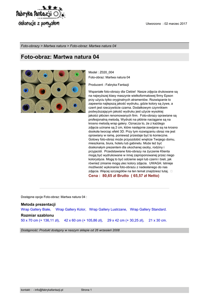 Utworzono : 02 marzec 2017 Foto-obrazy > Martwa natura > Foto-obraz: Martwa natura 04 Foto-obraz: Martwa natura 04 Model : Z020_004 Foto-obraz: Martwa natura 04 Producent : Fabryka Fantazji Wspaniałe foto-obrazy dla Ciebie! Nasze zdjęcia drukowane są na najwyższej klasy maszynie wielkoformatowej firmy Epson przy użyciu tylko oryginalnych atramentów. Rozwiązanie to zapewnia najlepszą jakość wydruku, gdzie kolory są żywe, a czerń jest rzeczywiście czarna. Dodatkowym czynnikiem podwyższającym jakość wydruku jest użycie wysokiej jakości płócien renomowanych firm. Foto-obrazy oprawiane są profesjonalną metodą. Wydruki na płótnie naciągane są na krosno metodą wrap galery. Oznacza to, że z każdego zdjęcia ucinane są 2 cm, które następnie zawijane są na krosno dookoła tworząc efekt 3D. Przy tym rozwiązaniu obraz nie jest oprawiany w ramę, ponieważ przestaje być to konieczne. Gotowy foto-obraz może przyozdobić wnętrze Twojego domu, mieszkania, biura, hotelu lub gabinetu. Może też być doskonałym prezentem dla ukochanej osoby, rodziny i przyjaciół. Przedstawiane foto-obrazy na życzenie Klienta mogą być wydrukowane w innej zaproponowanej przez niego kolorystyce. Mogą to być odcienie sepii lub czerni i bieli, jak również zmianie mogą ulec kolory zdjęcia. UWAGA: Istnieje możliwość wykonania foto-obrazu z nadesłanego do nas zdjęcia. Więcej szczegółów na ten temat znajdziesz tutaj. � Cena : 80,65 zł Brutto ( 65,57 zł Netto) Dostępne opcje Foto-obraz: Martwa natura 04 : Metoda prezentacji Wrap Gallery Białe, Wrap Gallery Kolor, Wrap Gallery Lustrzane, Wrap Gallery Standard. Rozmiar szablonu 50 x 70 cm (+ 136,11 zł), 42 x 60 cm (+ 105,86 zł), 29 x 42 cm (+ 30,25 zł), Dostępność: Produkt dostępny w naszym sklepie od 26 wrzesień 2008 kontakt : - [email protected] Strona 1 21 x 30 cm.
