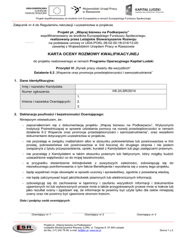 Projekt współfinansowany ze środków Unii Europejskiej w ramach Europejskiego Funduszu Społecznego Załącznik nr 4 do Regulaminu rekrutacji i uczestnictwa w projekcie Projekt pt. „Więcej biznesu na Podkarpaciu” współfinansowany ze środków Europejskiego Funduszu Społecznego, realizowany przez Leżajskie Stowarzyszenie Rozwoju na podstawie umowy nr UDA-POKL.06.02.00-18-014/13-00 zawartej z Wojewódzkim Urzędem Pracy w Rzeszowie KARTA OCENY ROZMOWY KWALIFIKACYJNEJ do projektu realizowanego w ramach Programu Operacyjnego Kapitał Ludzki Priorytet VI „Rynek pracy otwarty dla wszystkich” Działanie 6.2 „Wsparcie oraz promocja przedsiębiorczości i samozatrudnienia” 1. Dane identyfikacyjne: Imię i nazwisko Kandydata: /I/6.2/LSR/2014 Numer zgłoszenia: 1. Imiona i nazwiska Oceniających: 2. 3. 2. Deklaracja poufności i bezstronności Oceniającego: Niniejszym oświadczam, że: zapoznałem/am się z dokumentacją projektu „Więcej biznesu na Podkarpaciu”, Wytycznymi Instytucji Pośredniczącej w sprawie udzielania pomocy na rozwój przedsiębiorczości w ramach działania 6.2 Wsparcie oraz promocja przedsiębiorczości i samozatrudnienia”, oraz wszelkimi dokumentami dotyczącymi uczestnictwa w projekcie, nie pozostaję w związku małżeńskim albo w stosunku pokrewieństwa lub powinowactwa w linii prostej, pokrewieństwa lub powinowactwa w linii bocznej do drugiego stopnia i nie jestem związany/a z tytułu przysposobienia, opieki, kurateli z Kandydatem lub jego zastępcami prawnym, nie pozostaję z Kandydatem w takim stosunku prawnym lub faktycznym, który mógłby budzić uzasadnione wątpliwości co do mojej bezstronności, w przypadku stwierdzenia którejkolwiek z powyższych zależności, zobowiązuję się do niezwłocznego poinformowania o tym fakcie Beneficjenta i wycofania się z oceny tego projektu, będę wypełniać moje obowiązki w sposób uczciwy i sprawiedliwy, zgodnie z posiadaną wiedzą, nie będę zatrzymywać kopii jakichkolwiek pisemnych lub elektronicznych informacji, zobowiązuję się do zachowania w tajemnicy i zaufaniu wszystkich informacji i dokumentów ujawnionych mi lub wytworzonych przeze mnie a także przygotowanych przeze mnie w trakcie lub jako rezultat oceny i zgadzam się, że informacje te powinny być użyte tylko dla celów niniejszej oceny oraz nie powinny być ujawnione stronom trzecim. Data i podpisy osób oceniających: Oceniający nr 1 Oceniający nr 2 Projekt pt. „Więcej biznesu na Podkarpaciu” Leżajskie Stowarzyszenie Rozwoju (LSR), ul. Targowa 9, 37-300 Leżajsk tel./fax. (17) 242 79 08, e-mail: [email protected], www.lsr.pl Oceniający nr 3 Strona 1 z 2 Projekt współfinansowany ze środków Unii Europejskiej w ramach Europejskiego Funduszu Społecznego 3. Ocena rozmowy kwalifikacyjnej: a. Ocena motywacji kandydata (max 8 pkt.) Klucz do oceny motywacji Tendencja: Przysługujące punkty nie wykazuje 0 – 2 pkt. wykazuje w małym stopniu 3 – 4 pkt. wykazuje 5 – 6 pkt. zdecydowanie wykazuje 7 – 8 pkt. Cecha ocena nr 1 ocena nr 2 ocena nr 3 ocena uśredniona ocena nr 2 ocena nr 2 ocena nr 3 średnia ocen motywacja kandydata do podjęcia własnej działalności gospodarczej i udziału w projekcie (max 8 pkt.) b. Ocena kompetencji osobistych (max 12 pkt.) Klucz do oceny motywacji *Cecha tendencja dla Przysługujące danej cechy* punkty nie wykazuje 0 pkt. wykazuje w małym stopniu 1 pkt. wykazuje 2 pkt. zdecydowanie wykazuje 3 pkt. 1. Samodzielność (0-3 pkt.) 2. Odpowiedzialność (0-3 pkt.) 3. umiejętność planowania i myślenia analitycznego (0-3 pkt.) 4. sumienność (0-3 pkt.) RAZEM (max 12 pkt.): c. Ocena łączna z rozmowy kwalifikacyjnej Lp. Kryteria 1. motywacja kandydata 2. kompetencje osobiste Przyznana liczba punktów Uzasadnienie (min. 5 zdań) RAZEM Data i podpisy osób oceniających: Oceniający nr 1 Oceniający nr 2 Projekt pt. „Więcej biznesu na Podkarpaciu” Leżajskie Stowarzyszenie Rozwoju (LSR), ul. Targowa 9, 37-300 Leżajsk tel./fax. (17) 242 79 08, e-mail: [email protected], www.lsr.pl Oceniający nr 3 Strona 2 z 2