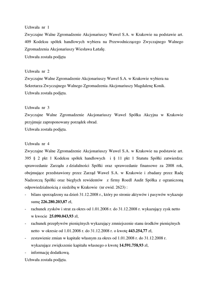 Uchwała nr 1 Zwyczajne Walne Zgromadzenie Akcjonariuszy Wawel S.A. w Krakowie na podstawie art. 409 Kodeksu spółek handlowych wybiera na Przewodniczącego Zwyczajnego Walnego Zgromadzenia Akcjonariuszy Wiesława Łatałę. Uchwała została podjęta Uchwała nr 2 Zwyczajne Walne Zgromadzenie Akcjonariuszy Wawel S.A. w Krakowie wybiera na Sekretarza Zwyczajnego Walnego Zgromadzenia Akcjonariuszy Magdalenę Konik. Uchwała została podjęta. Uchwała nr 3 Zwyczajne Walne Zgromadzenie Akcjonariuszy Wawel Spółka Akcyjna w Krakowie przyjmuje zaproponowany porządek obrad. Uchwała została podjęta. Uchwała nr 4 Zwyczajne Walne Zgromadzenie Akcjonariuszy Wawel S.A. w Krakowie na podstawie art. 395 § 2 pkt 1 Kodeksu spółek handlowych i § 11 pkt 1 Statutu Spółki zatwierdza: sprawozdanie Zarządu z działalności Spółki oraz sprawozdanie finansowe za 2008 rok, obejmujące przedstawiony przez Zarząd Wawel S.A. w Krakowie i zbadany przez Radę Nadzorczą Spółki oraz biegłych rewidentów z firmy Roedl Audit Spółka z ograniczoną odpowiedzialnością z siedzibą w Krakowie (nr ewid. 2623) : - bilans sporządzony na dzień 31.12.2008 r., który po stronie aktywów i pasywów wykazuje sumę 226.280.203,87 zł, - rachunek zysków i strat za okres od 1.01.2008 r. do 31.12.2008 r. wykazujący zysk netto w kwocie 25.090.043,93 zł, - rachunek przepływów pieniężnych wykazujący zmniejszenie stanu środków pieniężnych netto w okresie od 1.01.2008 r. do 31.12.2008 r. o kwotę 443.254,77 zł, - zestawienie zmian w kapitale własnym za okres od 1.01.2008 r. do 31.12.2008 r. wykazujące zwiększenie kapitału własnego o kwotę 14.591.758,93 zł, - informację dodatkową. Uchwała została podjęta. Uchwała nr 5 Zwyczajne Walne Zgromadzenie Akcjonariuszy Wawel S.A. w Krakowie na podstawie art. 395 § 2 pkt 2 Kodeksu spółek handlowych oraz § 11 pkt 4 Statutu Spółki uchwala, że zysk Spółki za 2008 rok obrotowy w kwocie: 25.090.043,93 zł (słownie złotych: dwadzieścia pięć milionów dziewięćdziesiąt tysięcy czterdzieści trzy złote 93/100) zostanie przeznaczony na: - dywidendę w kwocie 14.997.550,00 zł (czternastu milionów dziewięciuset dziewięćdziesięciu siedmiu tysięcy pięciuset pięćdziesięciu złotych), - kapitał zapasowy w kwocie 10.092.493,93 zł (dziesięciu milionów dziewięćdziesięciu dwóch tysięcy czterystu dziewięćdziesięciu trzech złotych i dziewięćdziesięciu trzech groszy). Postanawia się, że: a) dywidenda na 1 akcję wynosi 10,00 zł (dziesięć złotych) brutto, b) dniem ustalenia prawa do dywidendy jest dzień 27.07. 2009 r., c) termin wypłaty dywidendy ustala się na dzień 12.08.2009 r. Uchwała została podjęta. Uchwała nr 6 Zwyczajne Walne Zgromadzenie Akcjonariuszy Wawel S.A. w Krakowie zgodnie z art. 395 § 2 pkt 3 Kodeksu spółek handlowych i § 11 pkt 3 Statutu Spółki oraz na podstawie złożonych przez Zarząd sprawozdań z działalności Spółki za 2008 rok udziela Prezesowi Zarządu Spółki Panu Dariuszowi Orłowskiemu absolutorium z wykonania przez niego obowiązków w 2008 roku. Uchwała została podjęta. Uchwała nr 7 Zwyczajne Walne Zgromadzenie Akcjonariuszy Wawel S.A. w Krakowie zgodnie z art. 395 § 2 pkt 3 Kodeksu spółek handlowych i § 11 pkt 3 Statutu Spółki oraz na podstawie złożonych przez Zarząd sprawozdań z działalności Spółki za 2008 rok udziela członkowi Zarządu Spółki Panu Wojciechowi Winkelowi absolutorium z wykonania przez niego obowiązków w 2008 roku. Uchwała została podjęta. Uchwała nr 8 Zwyczajne Walne Zgromadzenie Akcjonariuszy Wawel S.A. w Krakowie zgodnie z art. 395 § 2 pkt 3 Kodeksu spółek handlowych i § 11pkt 3 Statutu Spółki oraz na podstawie złożonego sprawozdania z działalności Rady Nadzorczej za 2008 rok udziela Panu Eugeniuszowi Małkowi - Przewodniczącemu Rady Nadzorczej absolutorium z wykonania przez niego obowiązków w 2008 roku. Uchwała została podjęta. Uchwała nr 9 Zwyczajne Walne Zgromadzenie Akcjonariuszy Wawel S.A. w Krakowie zgodnie z art. 395 § 2 pkt 3 Kodeksu spółek handlowych i § 11 pkt 3 Statutu Spółki oraz na podstawie złożonego sprawozdania z działalności Rady Nadzorczej za 2008 rok udziela Pani Nicole Richter – Z-cy Przewodniczącego Rady Nadzorczej absolutorium z wykonania przez nią obowiązków w 2008 roku. Uchwała została podjęta. Uchwała nr 10 Zwyczajne Walne Zgromadzenie Akcjonariuszy Wawel S.A. w Krakowie zgodnie z art. 395 § 2 pkt 3 Kodeksu spółek handlowych i § 11 pkt 3 Statutu Spółki oraz na podstawie złożonego sprawozdania z działalności Rady Nadzorczej za 2008 rok udziela Panu Pawłowi Baładze – Sekretarzowi Rady Nadzorczej absolutorium z wykonania przez niego obowiązków w 2008 roku. Uchwała została podjęta. Uchwała nr 11 Zwyczajne Walne Zgromadzenie Akcjonariuszy Wawel S.A. w Krakowie zgodnie z art. 395 § 2 pkt 3 Kodeksu spółek handlowych i § 11 pkt 3 Statutu Spółki oraz na podstawie złożonego sprawozdania z działalności Rady Nadzorczej za 2008 rok udziela Panu Hermannowi Opferkuchowi – Członkowi Rady Nadzorczej absolutorium z wykonania przez niego obowiązków w 2008 roku. Uchwała została podjęta. Uchwała nr 12 Zwyczajne Walne Zgromadzenie Akcjonariuszy Wawel S.A. w Krakowie zgodnie z art. 395 § 2 pkt 3 Kodeksu spółek handlowych i § 11 pkt 3 Statutu Spółki oraz na podstawie złożonego sprawozdania z działalności Rady Nadzorczej za 2008 rok udziela Panu Andrzejowi Szwarcowi – Członkowi Rady Nadzorczej absolutorium z wykonania przez niego obowiązków w 2008 roku. Uchwała została podjęta. Uchwała nr 13 Zwyczajne Walne Zgromadzenie Akcjonariuszy Wawel S.A. w Krakowie zgodnie z § 17 pkt 3 Statutu Spółki powołuje na Prezesa Zarządu Pana Dariusza Orłowskiego. Uchwała została podjęta. Uchwała nr 14 Zwyczajne Walne Zgromadzenie Akcjonariuszy Wawel S.A. w Krakowie ustala liczbę członków kolejnej kadencji Rady Nadzorczej Spółki na 6 (sze