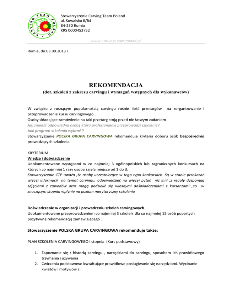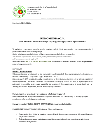 Stowarzyszenie Carving Team Poland ul. Suwalska 8/B4 84-230 Rumia KRS 0000452752 www.CarvingTeamPoland.pl Rumia, dn.03.09.2013 r. REKOMENDACJA (dot. szkoleń z zakresu carvingu i wymagań wstępnych dla wykonawców) W związku z rosnącym popularnością carvingu rośnie ilość przetargów na zorganizowanie i przeprowadzenie kursu carvingowego . Osoby składające zamówienie na taki przetarg stoją przed nie łatwym zadaniem Jak znaleźć odpowiedna osobę która profesjonalnie przeprowadzi szkolenie? Jaki program szkolenia wybrać ? Stowarzyszenie POLSKA GRUPA CARVINGOWA rekomenduje kryteria doboru osób bezpośrednio prowadzących szkolenia KRYTERIUM Wiedza i doświadczenie Udokumentowane występami w co najmniej 3 ogólnopolskich lub zagranicznych konkursach na których co najmniej 1 razy osoba zajęła miejsce od 1 do 3. Stowarzyszenie CTP uważa ,że osoby uczestniczące w tego typu konkursach .Są w stanie przekazać więcej informacji na temat carvingu, odpowiedzieć na więcej pytań niż inni ,z reguły dysponują zdjęciami z zawodów oraz mogą podzielić się własnymi doświadczeniami z kursantami ,co w znaczącym stopniu wpłynie na poziom merytoryczny szkolenia Doświadczenie w organizacji i prowadzeniu szkoleń carvingowych Udokumentowane przeprowadzeniem co najmniej 3 szkoleń dla co najmniej 15 osób popartych pozytywną rekomendacją zamawiającego . Stowarzyszenie POLSKA GRUPA CARVINGOWA rekomenduje także: PLAN SZKOLENIA CARVINGOWEGO I stopnia (Kurs podstawowy) 1. Zapoznanie się z historią carvingu , narzędziami do carvingu, sposobem ich prawidłowego trzymania i używania 2. Ćwiczenia podstawowe kształtujące prawidłowe posługiwanie się narzędziami. Wycinanie kwiatów i motywów z: Stowarzyszenie Carving Team Poland ul. Suwalska 8/B4 84-230 Rumia KRS 0000452752 www.CarvingTeamPoland.pl a. b. c. d. e. f. Kwiatki z rzodkiewki (2 rodzaje) Cukinii ( kwiaty i liście ) Marchewki ( szyszka i 1 rodzaj kwiatka ) Róża z kalarepy lub buraka Kwiat w melonie (dowolny rodzaj) z dodatkowymi motywami roślinnymi Arbuz lub dynia - według uznania instruktora ( może posłuży jako element egzaminu lub weryfikacji zdobytej wiedzy przez kursantów) 3. Tworzenie kompozycji kwiatowej z wyrzeźbionych owoców i warzyw 4. Omówienie sposobów przechowywania i pielęgnacji dekoracji carvingowych Pozostałe elementy instruktorzy mogą dobrać według swego uznania lub indywidualnych umów z zamawiającym W imieniu Zarządu 1. Paweł Sztenderski, sekretarz CTP 2. Grzegorz Gniech, skarbnik CTP