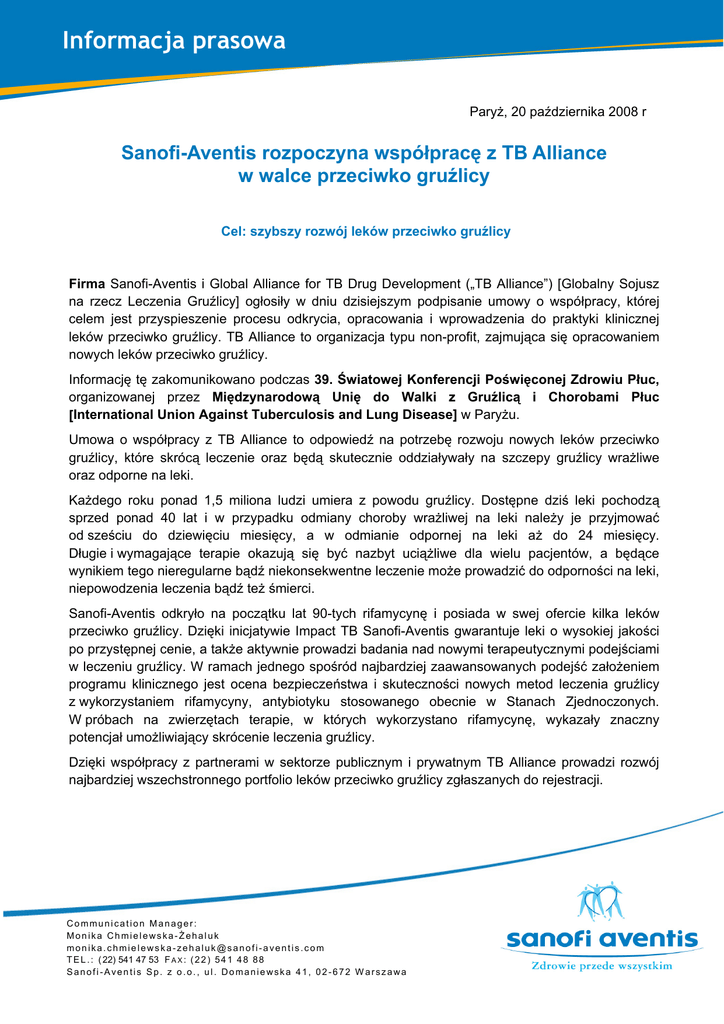 Informacja prasowa Paryż, 20 października 2008 r Sanofi-Aventis rozpoczyna współpracę z TB Alliance w walce przeciwko gruźlicy Cel: szybszy rozwój leków przeciwko gruźlicy Firma Sanofi-Aventis i Global Alliance for TB Drug Development („TB Alliance”) [Globalny Sojusz na rzecz Leczenia Gruźlicy] ogłosiły w dniu dzisiejszym podpisanie umowy o współpracy, której celem jest przyspieszenie procesu odkrycia, opracowania i wprowadzenia do praktyki klinicznej leków przeciwko gruźlicy. TB Alliance to organizacja typu non-profit, zajmująca się opracowaniem nowych leków przeciwko gruźlicy. Informację tę zakomunikowano podczas 39. Światowej Konferencji Poświęconej Zdrowiu Płuc, organizowanej przez Międzynarodową Unię do Walki z Gruźlicą i Chorobami Płuc [International Union Against Tuberculosis and Lung Disease] w Paryżu. Umowa o współpracy z TB Alliance to odpowiedź na potrzebę rozwoju nowych leków przeciwko gruźlicy, które skrócą leczenie oraz będą skutecznie oddziaływały na szczepy gruźlicy wrażliwe oraz odporne na leki. Każdego roku ponad 1,5 miliona ludzi umiera z powodu gruźlicy. Dostępne dziś leki pochodzą sprzed ponad 40 lat i w przypadku odmiany choroby wrażliwej na leki należy je przyjmować od sześciu do dziewięciu miesięcy, a w odmianie odpornej na leki aż do 24 miesięcy. Długie i wymagające terapie okazują się być nazbyt uciążliwe dla wielu pacjentów, a będące wynikiem tego nieregularne bądź niekonsekwentne leczenie może prowadzić do odporności na leki, niepowodzenia leczenia bądź też śmierci. Sanofi-Aventis odkryło na początku lat 90-tych rifamycynę i posiada w swej ofercie kilka leków przeciwko gruźlicy. Dzięki inicjatywie Impact TB Sanofi-Aventis gwarantuje leki o wysokiej jakości po przystępnej cenie, a także aktywnie prowadzi badania nad nowymi terapeutycznymi podejściami w leczeniu gruźlicy. W ramach jednego spośród najbardziej zaawansowanych podejść założeniem programu klinicznego jest ocena bezpieczeństwa i skuteczności nowych metod leczenia gruźlicy z wykorzystaniem rifamycyny, antybiotyku stosowanego obecnie w Stanach Zjednoczonych. W próbach na zwierzętach terapie, w których wykorzystano rifamycynę, wykazały znaczny potencjał umożliwiający skrócenie leczenia gruźlicy. Dzięki współpracy z partnerami w sektorze publicznym i prywatnym TB Alliance prowadzi rozwój najbardziej wszechstronnego portfolio leków przeciwko gruźlicy zgłaszanych do rejestracji. Communication Manager: Monika Chmielewska-Żehaluk [email protected] T E L . : ( 22) 541 47 53 F A X : ( 2 2 ) 5 4 1 4 8 8 8 Sanofi-Aventis Sp. z o.o., ul. Domaniewska 41, 02-672 Warszawa W chwili obecnej przygotowuje 12 związków, w tym 2 zgłoszone do rejestracji preparaty przeciwko gruźlicy znajdujące się w zaawansowanej fazie badań. Zgodnie z umową obie organizacje będą wymieniały informacje o swoich poszczególnych projektach oraz o odkryciach w badaniach nad lekami przeciwko gruźlicy. Ponadto, będą ze sobą konsultować istotne strategie dotyczące kwestii regulacyjnych, dostępów oraz możliwości prowadzenia badań klinicznych odnośnie do krajów rozwijających się. Działania te mogą otworzyć nowe kanały potencjalnej współpracy w przyszłości. “Współpraca z Sanofi-Aventis podkreśla zaangażowanie TB Alliance, wraz z partnerem dysponującym potencjałem wybitnych ekspertów, w dążeniu do udostępnienia pacjentom szybszych, lepszych oraz tańszych leków przeciwko gruźlicy w najkrótszym możliwym terminie,” oświadczył dr Jerome Premmereur, Prezes i Dyrektor Naczelny TB Alliance. “Dzięki specjalistycznej wiedzy TB Alliance w zakresie rozwoju leków partnerstwo pozwoli obu stronom szybciej wprowadzić na rynek nowe leki' oświadczył dr Robert Sebbag, Wiceprezes, Departament Dostępu do Leków Sanofi-Aventis. “Celem Impact TB, programu poświęconego gruźlicy, prowadzonego w ramach Departamentu Dostępu do Leków Sanofi-Aventis, jest dostarczenie nowych preparatów medycznych po cenie przystępnej dla wszystkich pacjentów, i jest to jednocześnie wizja, którą podzielamy z TB Alliance”, dodał. ”Badania i rozwój w Sanofi-Aventis poświęcone są w pełni odkryciu nowych leków do walki z gruźlicą” powiedział Jean-Marc Herbert, Starszy Wiceprezes Departamentu Badań Odkryć w Sanofi-Aventis. “Z tego względu cieszymy się, że nawiązaliśmy bliższe relacje z TB Alliance, który jest liderem w odkrywaniu nowych związków w tym obszarze.” O TB Alliance Global Alliance for TB Drug Development (TB Alliance) jest organizacją typu non-profit zajmującą się opracowaniem produktów przyspieszających odkrycie i rozwój nowych leków TB, które doprowadzą do skrócenia terapii, wykażą skuteczność względem wrażliwych i odpornych szczepów, oraz będą kompatybilne z terapiami antyretrowirusowymi pacjentów HIV-TB, w przypadku których obecnie stosuje się takie terapie oraz udoskonalą leczenie zakażeń utajonych. Dzięki współpracy z partnerami w sektorze publicznym i prywatnym TB Alliance prowadzi rozwój najbardziej wszechstronnego portfolio leków TB zgłaszanych do rejestracji w historii oraz dąży do zagwarantowania, by nowe, zarejestrowane terapie były tanie, skuteczne oraz dostępne dla ludzi, którzy potrzebują ich najbardziej. TB Alliance prowadzi działalność dzięki środkom otrzymywanym z fundacji: Bill & Melinda Gates Foundation, Rockefeller Foundation, oraz Irish Aid, Ministerstwa Spraw Zagranicznych Holandii (DGIS), Departamentu do Spraw Międzynarodowego Rozwoju Zjednoczonego Królestwa (DFID) oraz Agencji Stanów Zjednoczonych do Spraw Rozwoju Międzynarodowego (USAID). W celu uzyskania dodatkowych informacji o rozwoju leków TB oraz Alliance, zachęcamy do odwiedzania strony www.tballiance.org. 2 Communication Manager: Monika Chmielewska-Żehaluk [email protected] T E L . : ( 22) 541 47 53 F A X . : ( 2 2 ) 5 4 1 4 8 8 8 San