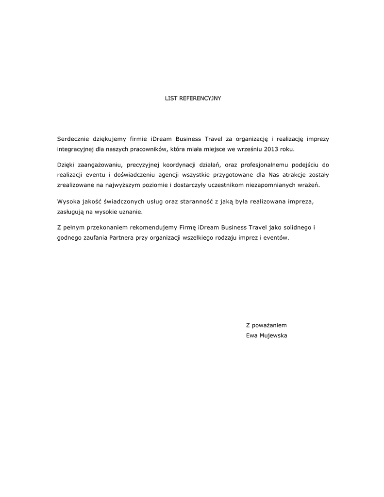 LIST REFERENCYJNY Serdecznie dziękujemy firmie iDream Business Travel za organizację i realizację imprezy integracyjnej dla naszych pracowników, która miała miejsce we wrześniu 2013 roku. Dzięki zaangażowaniu, precyzyjnej koordynacji działań, oraz profesjonalnemu podejściu do realizacji eventu i doświadczeniu agencji wszystkie przygotowane dla Nas atrakcje zostały zrealizowane na najwyższym poziomie i dostarczyły uczestnikom niezapomnianych wrażeń. Wysoka jakość świadczonych usług oraz staranność z jaką była realizowana impreza, zasługują na wysokie uznanie. Z pełnym przekonaniem rekomendujemy Firmę iDream Business Travel jako solidnego i godnego zaufania Partnera przy organizacji wszelkiego rodzaju imprez i eventów. Z poważaniem Ewa Mujewska