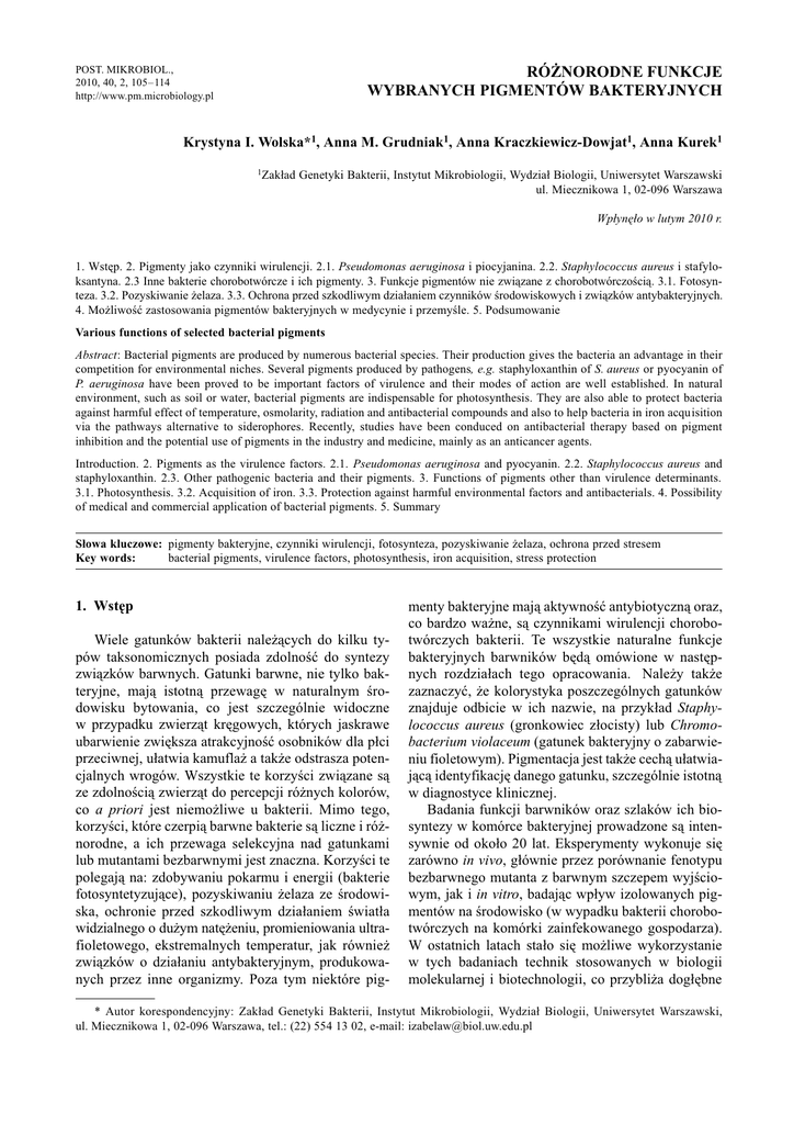 RÓ¯NORODNE FUNKCJE WYBRANYCH PIGMENTÓW BAKTERYJNYCH POST. MIKROBIOL., 2010, 40, 2, 105114 http://www.pm.microbiology.pl Krystyna I. Wolska*1, Anna M. Grudniak1, Anna Kraczkiewicz-Dowjat1, Anna Kurek1 1Zak³ad Genetyki Bakterii, Instytut Mikrobiologii, Wydzia³ Biologii, Uniwersytet Warszawski ul. Miecznikowa 1, 02-096 Warszawa Wp³ynê³o w lutym 2010 r. 1. Wstêp. 2. Pigmenty jako czynniki wirulencji. 2.1. Pseudomonas aeruginosa i piocyjanina. 2.2. Staphylococcus aureus i stafyloksantyna. 2.3 Inne bakterie chorobotwórcze i ich pigmenty. 3. Funkcje pigmentów nie zwi¹zane z chorobotwórczoci¹. 3.1. Fotosynteza. 3.2. Pozyskiwanie ¿elaza. 3.3. Ochrona przed szkodliwym dzia³aniem czynników rodowiskowych i zwi¹zków antybakteryjnych. 4. Mo¿liwoæ zastosowania pigmentów bakteryjnych w medycynie i przemyle. 5. Podsumowanie Various functions of selected bacterial pigments Abstract: Bacterial pigments are produced by numerous bacterial species. Their production gives the bacteria an advantage in their competition for environmental niches. Several pigments produced by pathogens, e.g. staphyloxanthin of S. aureus or pyocyanin of P. aeruginosa have been proved to be important factors of virulence and their modes of action are well established. In natural environment, such as soil or water, bacterial pigments are indispensable for photosynthesis. They are also able to protect bacteria against harmful effect of temperature, osmolarity, radiation and antibacterial compounds and also to help bacteria in iron acquisition via the pathways alternative to siderophores. Recently, studies have been conduced on antibacterial therapy based on pigment inhibition and the potential use of pigments in the industry and medicine, mainly as an anticancer agents. Introduction. 2. Pigments as the virulence factors. 2.1. Pseudomonas aeruginosa and pyocyanin. 2.2. Staphylococcus aureus and staphyloxanthin. 2.3. Other pathogenic bacteria and their pigments. 3. Functions of pigments other than virulence determinants. 3.1. Photosynthesis. 3.2. Acquisition of iron. 3.3. Protection against harmful environmental factors and antibacterials. 4. Possibility of medical and commercial application of bacterial pigments. 5. Summary S³owa kluczowe: pigmenty bakteryjne, czynniki wirulencji, fotosynteza, pozyskiwanie ¿elaza, ochrona przed stresem Key words: bacterial pigments, virulence factors, photosynthesis, iron acquisition, stress protection 1. Wstêp Wiele gatunków bakterii nale¿¹cych do kilku typów taksonomicznych posiada zdolnoæ do syntezy zwi¹zków barwnych. Gatunki barwne, nie tylko bakteryjne, maj¹ istotn¹ przewagê w naturalnym rodowisku bytowania, co jest szczególnie widoczne w przypadku zwierz¹t krêgowych, których jaskrawe ubarwienie zwiêksza atrakcyjnoæ osobników dla p³ci przeciwnej, u³atwia kamufla¿ a tak¿e odstrasza potencjalnych wrogów. Wszystkie te korzyci zwi¹zane s¹ ze zdolnoci¹ zwierz¹t do percepcji ró¿nych kolorów, co a priori jest niemo¿liwe u bakterii. Mimo tego, korzyci, które czerpi¹ barwne bakterie s¹ liczne i ró¿norodne, a ich przewaga selekcyjna nad gatunkami lub mutantami bezbarwnymi jest znaczna. Korzyci te polegaj¹ na: zdobywaniu pokarmu i energii (bakterie fotosyntetyzuj¹ce), pozyskiwaniu ¿elaza ze rodowiska, ochronie przed szkodliwym dzia³aniem wiat³a widzialnego o du¿ym natê¿eniu, promieniowania ultrafioletowego, ekstremalnych temperatur, jak równie¿ zwi¹zków o dzia³aniu antybakteryjnym, produkowanych przez inne organizmy. Poza tym niektóre pig- menty bakteryjne maj¹ aktywnoæ antybiotyczn¹ oraz, co bardzo wa¿ne, s¹ czynnikami wirulencji chorobotwórczych bakterii. Te wszystkie naturalne funkcje bakteryjnych barwników bêd¹ omówione w nastêpnych rozdzia³ach tego opracowania. Nale¿y tak¿e zaznaczyæ, ¿e kolorystyka poszczególnych gatunków znajduje odbicie w ich nazwie, na przyk³ad Staphylococcus aureus (gronkowiec z³ocisty) lub Chromobacterium violaceum (gatunek bakteryjny o zabarwieniu fioletowym). Pigmentacja jest tak¿e cech¹ u³atwiaj¹c¹ identyfikacjê danego gatunku, szczególnie istotn¹ w diagnostyce klinicznej. Badania funkcji barwników oraz szlaków ich biosyntezy w komórce bakteryjnej prowadzone s¹ intensywnie od oko³o 20 lat. Eksperymenty wykonuje siê zarówno in vivo, g³ównie przez porównanie fenotypu bezbarwnego mutanta z barwnym szczepem wyjciowym, jak i in vitro, badaj¹c wp³yw izolowanych pigmentów na rodowisko (w wypadku bakterii chorobotwórczych na komórki zainfekowanego gospodarza). W ostatnich latach sta³o siê mo¿liwe wykorzystanie w tych badaniach technik stosowanych w biologii molekularnej i biotechnologii, co przybli¿a dog³êbne * Autor korespondencyjny: Zak³ad Genetyki Bakterii, Instytut Mikrobiologii, Wydzia³ Biologii, Uniwersytet Warszawski, ul. Miecznikowa 1, 02-096 Warszawa, tel.: (22) 554 13 02, e-mail: [email protected] 106 KRYSTYNA I. WOLSKA, ANNA M. GRUDNIAK, ANNA KRACZKIEWICZ-DOWJAT, ANNA KUREK poznanie zarówno regulacji syntezy pigmentów jak i mechanizmów ró¿norodnego (plejotropowego) ich dzia³ania na komórki organizmów wy¿szych oraz molekularnych podstaw udzia³u barwników w chorobotwórczoci bakterii. 2. Pigmenty jako czynniki wirulencji 2.1. Pseudomonas aeruginosa i piocyjanina Gramujemne pa³eczki, P. aeruginosa (klasa Gammaproteobacteria, rodzina Psedomonadaceae) charakteryzuj¹ siê zdolnoci¹ do przeprowadzania bardzo licznych reakcji biochemicznych, które nale¿¹ do ró¿norodnych szlaków metabolicznych. W zwi¹zku z tym, bakterie te mo¿e rosn¹æ w ró¿nych rodowiskach i maj¹ zdolnoæ do infekcji wielu gatunków organizmów eukariotycznych, od ameby do cz³owieka. U ludzi wywo³uj¹ liczne schorzenia, w tym: zapalenie ucha rodkowego, zapalenie stawów, zapalenie wsierdzia, choroby uk³adu moczowego, zaka¿enia ran, na przyk³ad powsta³ych w wyniku poparzeñ. Ogromny potencja³ chorobotwórczy P. aeruginosa zwi¹zany jest z syntez¹ przez tê bakt