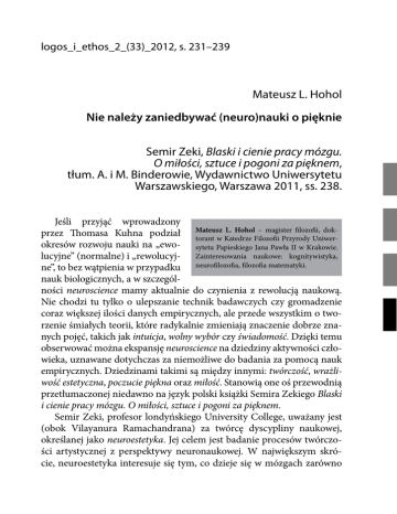 logos_i_ethos_2_(33)_2012, s. 231–239 Mateusz L. Hohol Nie należy zaniedbywać (neuro)nauki o pięknie Semir Zeki, Blaski i cienie pracy mózgu. O miłości, sztuce i pogoni za pięknem, tłum. A. i M. Binderowie, Wydawnictwo Uniwersytetu Warszawskiego, Warszawa 2011, ss. 238. Jeśli przyjąć wprowadzony przez Thomasa Kuhna podział Mateusz L. Hohol – magister filozofii, doktorant w Katedrze Filozofii Przyrody Uniwerokresów rozwoju nauki na „ewo- sytetu Papieskiego Jana Pawła II w Krakowie. lucyjne” (normalne) i „rewolucyj- Zainteresowania naukowe: kognitywistyka, ne”, to bez wątpienia w przypadku neurofilozofia, filozofia matematyki. nauk biologicznych, a w szczególności neuroscience mamy aktualnie do czynienia z rewolucją naukową. Nie chodzi tu tylko o ulepszanie technik badawczych czy gromadzenie coraz większej ilości danych empirycznych, ale przede wszystkim o tworzenie śmiałych teorii, które radykalnie zmieniają znaczenie dobrze znanych pojęć, takich jak intuicja, wolny wybór czy świadomość. Dzięki temu obserwować można ekspansję neuroscience na dziedziny aktywności człowieka, uznawane dotychczas za niemożliwe do badania za pomocą nauk empirycznych. Dziedzinami takimi są między innymi: twórczość, wrażliwość estetyczna, poczucie piękna oraz miłość. Stanowią one oś przewodnią przetłumaczonej niedawno na język polski książki Semira Zekiego Blaski i cienie pracy mózgu. O miłości, sztuce i pogoni za pięknem. Semir Zeki, profesor londyńskiego University College, uważany jest (obok Vilayanura Ramachandrana) za twórcę dyscypliny naukowej, określanej jako neuroestetyka. Jej celem jest badanie procesów twórczości artystycznej z perspektywy neuronaukowej. W największym skrócie, neuroestetyka interesuje się tym, co dzieje się w mózgach zarówno 232 Mateusz L. Hohol artystów, jak i odbiorców dzieł sztuki. Tak ogólny cel pozwala naukowcom skupić się z jednej strony na samym dziele, z drugiej na mechanizmach rządzących percepcją, kreatywnością i poczuciem przyjemności. Entuzjaści neuroestetyki twierdzą ponadto, że może być ona niezwykle przydatna w badaniach nad świadomością (qualiami). Gromadzone dane oraz teorie formułowane przez adeptów neuroestetyki mogą być również inspirujące dla filozofów sztuki oraz „klasycznych” estetyków. Można powiedzieć więc, że neuroestetyka łączy przyjemne z pożytecznym. Niewątpliwie można powiedzieć to również o książce Blaski i cienie pracy mózgu. Semir Zeki nie jest typem naukowca, który patrzy na dzieło sztuki jedynie „szkiełkiem i okiem”, dokładnie tak samo jak na żabę „krojoną” podczas lekcji anatomii. Tym, co uderza podczas lektury (szczególnie w III i IV części książki), jest wrażliwość artystyczna autora. Wręcz w idealny sposób łączy on pasję naukowca z pasją odbiorcy dzieła. Lub więcej: z pasją estety. Nie jest to jednak sprawozdanie naukowca z wrażeń doznawanych podczas kontemplacji dzieł w ramach rekreacji po długich godzinach spędzonych przed komputerem czy w laboratorium. Przyjrzyjmy się pokrótce Blaskom i cieniom pracy mózgu. Książka rozpoczyna się od przedstawienia uniwersalnej funkcji mózgu, jaką jest „zdobywanie wiedzy, które odbywa się poprzez tworzenie pojęć” (s. 15). Zgodnie z takim „uniwersalistycznym” podejściem rozwiązywanie problemów odbywa się poprzez modyfikacje dobrze sprawdzonych mechanizmów, które ułatwiały przetrwanie. Dzięki temu możliwe jest minimalizowanie lub omijanie wyzwań, jakie organizmy napotykają na swojej ewolucyjnej drodze. Zeki polemizuje (jednak nieotwarcie) z dwoma wpływowymi i istotnymi koncepcjami z pogranicza filozofii i nauk biologicznych. Pierwszą z nich jest Popperowski postulat, mówiący, że procesy ewolucyjne przebiegają metodą prób i błędów. Drugą zaś jest modularna teoria umysłu, zgodnie z którą system poznawczy złożony jest z ogromnej liczby wyspecjalizowanych i działających niezależnie od siebie modułów (teoria ta pochodzi od Jerry’ego Fodora, a przyjmowana jest obecnie przez przedstawicieli psychologii ewolucyjnej). Zwolennicy teorii modularnej próbują odnaleźć argumenty za istnieniem wykształconego Nie należy zaniedbywać (neuro)nauki o pięknie 233 ewolucyjnie, wyspecjalizowanego w estetyce modułu umysłu. Zeki odrzuca taką możliwość, idąc tropem neuronauki poznawczej (cognitive neuroscience). Najogólniej rzecz ujmując, twierdzi on, że nasze zdolności estetyczne wynikają z tych samych mechanizmów biologicznych, które odpowiedzialne są za zdobywanie wiedzy poprzez tworzenie pojęć (reprezentacji). Zdaniem Zekiego, wspólną cechą łączącą komórki nerwowe, należące do różnych obszarów funkcjonalnych, wyspecjalizowanych w różnych typach percepcji, jest zdolność do abstrahowania, tj. pomijania cech szczegółowych na rzecz wydobywania cech ogólnych. Zdolność ta przejawia się zarówno na poziomie pojedynczych neuronów, jak i bardziej złożonych struktur mózgowych (zarówno podkorowych, jak i korowych). Tego typu założenie pomocne jest, zdaniem Zekiego, przy badaniu np. neuronalnych korelatów przeżycia estetycznego, przy wykorzystaniu technik obrazowania mózgu. Co więcej, zdolność do abstrakcji przejawia się także na wysokim poziomie poznawczym, jakim jest stałość percepcyjna (stabilność percepcji). Polega ona na tym, że przypisujemy pewnym obiektom – takim, jak np. ludzkie twarze – tę samą tożsamość mimo zmiennego punktu widzenia, naświetlenia, a także występowania dodatkowych cech szczegółowych (np. zmiana fryzury). W pierwszej części książki Zeki przedstawia również teorię powstawania pojęć. Idąc tropem Immanuela Kanta (do którego często nawiązuje), autor twierdzi, że ludzki aparat poznawczy składa się z dwóch systemów pojęć czy, mówiąc nieco szerzej, kategorii – wrodzonych oraz nabytych. Pierwsze z ni