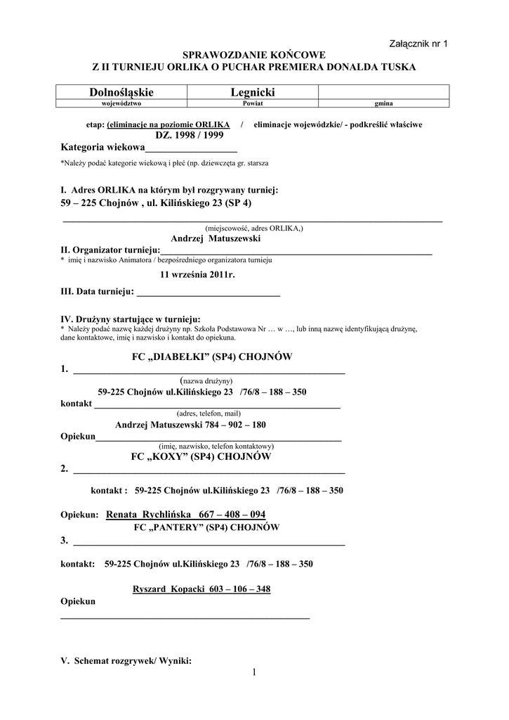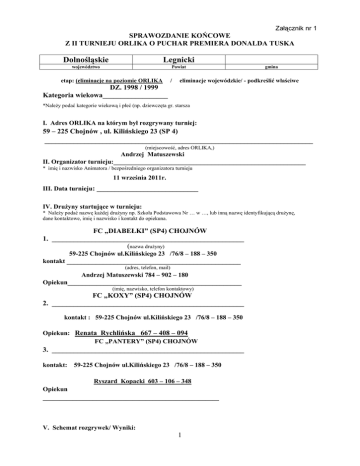 Załącznik nr 1 SPRAWOZDANIE KOŃCOWE Z II TURNIEJU ORLIKA O PUCHAR PREMIERA DONALDA TUSKA Dolnośląskie Legnicki województwo Powiat etap: (eliminacje na poziomie ORLIKA / gmina eliminacje wojewódzkie/ - podkreślić właściwe DZ. 1998 / 1999 Kategoria wiekowa__________________ *Należy podać kategorie wiekową i płeć (np. dziewczęta gr. starsza I. Adres ORLIKA na którym był rozgrywany turniej: 59 – 225 Chojnów , ul. Kilińskiego 23 (SP 4) __________________________________________________________________________ (miejscowość, adres ORLIKA,) Andrzej Matuszewski II. Organizator turnieju:_____________________________________________________ * imię i nazwisko Animatora / bezpośredniego organizatora turnieju 11 września 2011r. III. Data turnieju: ____________________________ IV. Drużyny startujące w turnieju: * Należy podać nazwę każdej drużyny np. Szkoła Podstawowa Nr … w …, lub inną nazwę identyfikującą drużynę, dane kontaktowe, imię i nazwisko i kontakt do opiekuna. FC „DIABEŁKI” (SP4) CHOJNÓW 1. _____________________________________________________ (nazwa drużyny) 59-225 Chojnów ul.Kilińskiego 23 /76/8 – 188 – 350 kontakt ________________________________________________ (adres, telefon, mail) Andrzej Matuszewski 784 – 902 – 180 Opiekun________________________________________________ (imię, nazwisko, telefon kontaktowy) FC „KOXY” (SP4) CHOJNÓW 2. _____________________________________________________ kontakt : 59-225 Chojnów ul.Kilińskiego 23 /76/8 – 188 – 350 Opiekun: Renata Rychlińska 667 – 408 – 094 FC „PANTERY” (SP4) CHOJNÓW 3. _____________________________________________________ kontakt: 59-225 Chojnów ul.Kilińskiego 23 /76/8 – 188 – 350 Ryszard Kopacki 603 – 106 – 348 Opiekun _____________________________________________________ V. Schemat rozgrywek/ Wyniki: 1 *. Należy podać wyniki wszystkich meczów rozgrywanych w turnieju FC „Koxy” - FC „Diabełki” FC „Diabełki” - FC „Pantery” FC „Pantery” – FC „Koxy” 1:2 (1:1) 2:0 (0:0) 1:3 (1:1) VI. Klasyfikacja końcowa: *.. Należy podać nazwy drużyn, w przypadku drużyn, które zajęły miejsca I, II, III należy podać dane zawodników – imiona i nazwiska. (przy pierwszym, drugim i trzecim miejscu prosimy o podanie imienia i nazwiska i telefonu kontaktowego) I miejsce – FC „DIABEŁKI” (SP4) CHOJNÓW w składzie: 1 . PAULINA SAFIN 2 . SANDRA SPIRYDOWICZ 3 . ANNA CIEŚLA 4 . JULIA JÓZEFÓW 5 . STANISŁAWA JANSCH 6 . ANGELIKA ŻOK 7 .AGATA WYTRWAŁ 8 . KAROLINA MAŚLEJ 9 . ALEKSANDRA BARANOWSKA 10. LAURA PIRSZLEWICZ Opiekun : Andrzej Matuszewski tel. kontaktowy : 784 – 902 – 180 II miejsce - FC „KOXY” w składzie: 1. Małgorzata Klatka 2. Dominika Miłuch 3. Weronika Waganiak 4. Marta Wytrwał 5. Amelia Kamińska 6. Klaudia Bąk 7. Katarzyna Furmanek 8. Justyna Kłusek 9. Joanna Konabrocka 10. Sandra Traczyk Opiekun: Renata Rychlińska tel. Kontaktowy: 667 – 408 – 094 III miejsce – FC „PANTERY” w składzie: 1. Aleksandra Chrzanowska 2. Aleksandra Chojnacka 3. Patrycja Chołodowska 4. Karolina Gawron 5. Sylwia Jędras 6. Alicja Kaczan 7. Patrycja Malik 8. Kamila Chochołowicz 2 9. Dorota Amarowicz 10. Beata Przyłucka Opiekun : Ryszard Kopacki tel. kontaktowy: 603 – 106 – 348 Opis turnieju: *.. Prosimy o kilka zdań opisujących przebieg turnieju, informacje o patronatach, o przebiegu ceremonii wręczenia nagród, można dołączyć zdjęcia itd. Turniej rozegrano w dniu 11 września 2011r. systemem „każdy z każdym”. Czas gry: 2 x 10min. Wszystkim zespołom wręczono pamiątkowe koszulki. Puchary dla 3 zespołów ufundował Burmistrz Miasta Chojnowa Pan Jan Serkies. Andrzej Matuszewski ________________________________________________ Podpis Animatora / Organizatora turnieju 3 4