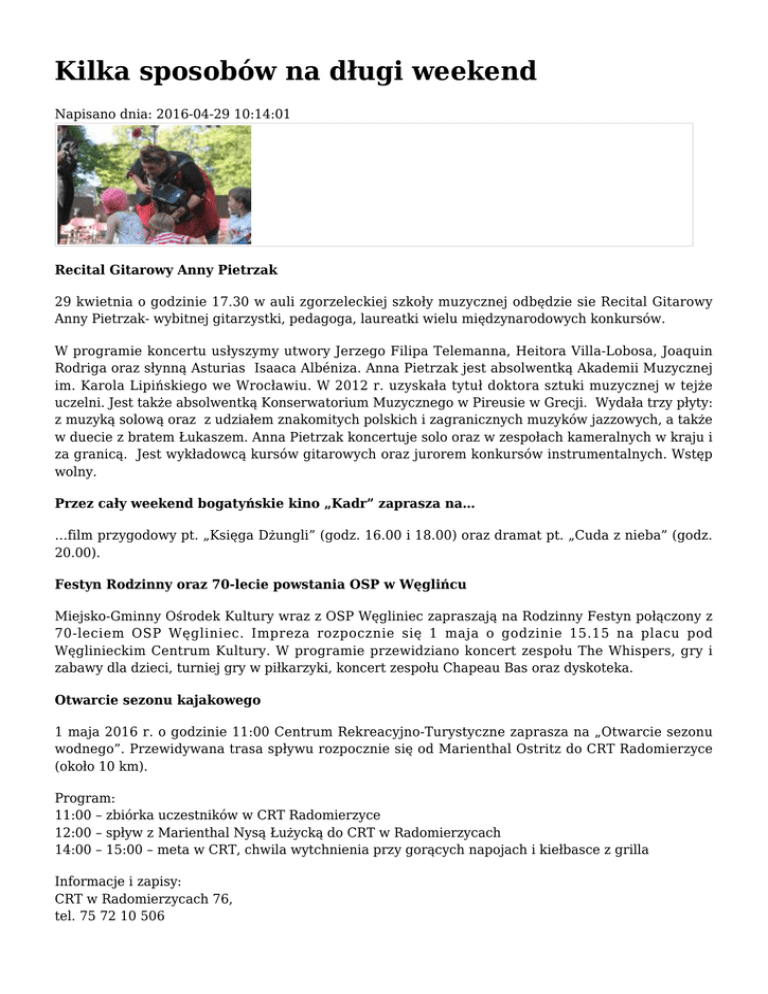 Kilka sposobów na długi weekend Napisano dnia: 2016-04-29 10:14:01 Recital Gitarowy Anny Pietrzak 29 kwietnia o godzinie 17.30 w auli zgorzeleckiej szkoły muzycznej odbędzie sie Recital Gitarowy Anny Pietrzak- wybitnej gitarzystki, pedagoga, laureatki wielu międzynarodowych konkursów. W programie koncertu usłyszymy utwory Jerzego Filipa Telemanna, Heitora Villa-Lobosa, Joaquin Rodriga oraz słynną Asturias Isaaca Albéniza. Anna Pietrzak jest absolwentką Akademii Muzycznej im. Karola Lipińskiego we Wrocławiu. W 2012 r. uzyskała tytuł doktora sztuki muzycznej w tejże uczelni. Jest także absolwentką Konserwatorium Muzycznego w Pireusie w Grecji. Wydała trzy płyty: z muzyką solową oraz z udziałem znakomitych polskich i zagranicznych muzyków jazzowych, a także w duecie z bratem Łukaszem. Anna Pietrzak koncertuje solo oraz w zespołach kameralnych w kraju i za granicą. Jest wykładowcą kursów gitarowych oraz jurorem konkursów instrumentalnych. Wstęp wolny. Przez cały weekend bogatyńskie kino „Kadr” zaprasza na… …film przygodowy pt. „Księga Dżungli” (godz. 16.00 i 18.00) oraz dramat pt. „Cuda z nieba” (godz. 20.00). Festyn Rodzinny oraz 70-lecie powstania OSP w Węglińcu Miejsko-Gminny Ośrodek Kultury wraz z OSP Węgliniec zapraszają na Rodzinny Festyn połączony z 70-leciem OSP Węgliniec. Impreza rozpocznie się 1 maja o godzinie 15.15 na placu pod Węglinieckim Centrum Kultury. W programie przewidziano koncert zespołu The Whispers, gry i zabawy dla dzieci, turniej gry w piłkarzyki, koncert zespołu Chapeau Bas oraz dyskoteka. Otwarcie sezonu kajakowego 1 maja 2016 r. o godzinie 11:00 Centrum Rekreacyjno-Turystyczne zaprasza na „Otwarcie sezonu wodnego”. Przewidywana trasa spływu rozpocznie się od Marienthal Ostritz do CRT Radomierzyce (około 10 km). Program: 11:00 – zbiórka uczestników w CRT Radomierzyce 12:00 – spływ z Marienthal Nysą Łużycką do CRT w Radomierzycach 14:00 – 15:00 – meta w CRT, chwila wytchnienia przy gorących napojach i kiełbasce z grilla Informacje i zapisy: CRT w Radomierzycach 76, tel. 75 72 10 506 Ilość miejsc ograniczona, decyduje kolejność zgłoszeń. Organizator zapewnia dojazd do Marienthal. 6. Gminny Bieg Uliczny W poniedziałek, 2 maja 2016 r., przy świetlicy wiejskiej w Ręczynie odbędzie się 6. Gminny Bieg Uliczny. W tym dniu w godzinach od 11:00 do 12:00 będą trwały zapisy uczestników, natomiast start rozpocznie się w samo południe. Na uczestników jak i przybyłych gości czekać będzie gorący posiłek w postaci grochówki i pieczonej kiełbasy na grillu, a dla najmłodszych – wata cukrowa i kramy z zabawkami. Więcej informacji można uzyskać pod nr telefonu: (75) 77 525 59 Koncert Poznańskiego Chóru Nauczycieli 2 maja w holu Miejskiego Domu Kultury w Zgorzelcu, ze świątecznym koncertem pieśni patriotycznych wystąpi Poznański Chór Nauczycieli im. Ignacego Paderewskiego. Początek o godzinie 17.00. Miejskie obchody 225. rocznicy uchwalenia Konstytucji 3 Maja Zgorzeleckie obchody Święta Konstytucji 3 Maja rozpocznie tradycyjna msza święta w intencji Ojczyzny, która zostanie odprawiona o godzinie 11.00 w kościele pw. św. Bonifacego. Później pod Pomnikiem Millenium odbędzie się uroczystość patriotyczna. Po południu, na skwerze im. księdza Jerzego Popiełuszki, uczniowie LO im. Braci Śniadeckich i burmistrz Zgorzelca od godziny 16.00 będą nam czytać fragmenty Konstytucji 3 Maja. Kiedy skończą, dzieci z zespołu Lusatia z Osieka Łużyckiego i seniorzy z Miejskiego Klubu Seniora zaproszą do wspólnego poloneza. Święto narodowe 3 Maja w Sulikowie Wójt Gminy Sulików zaprasza na gminne obchody Święta Narodowego 3 Maja. Uroczystości rozpoczną się mszą św. w intencji Ojczyzny w kościele parafialnym pw. Podwyższenia Krzyża Świętego. Początek o godzinie 12.30. Część patriotyczną zaplanowano około godziny 13.30 na Placu Wolności. Majowe uroczystości patriotyczne w Pieńsku Burmistrz Miasta i Gminy Pieńsk oraz rada miejska serdecznie zapraszają do wzięcia udziału w obchodach 225. rocznicy uchwalenia Konstytucji 3 Maja oraz 71. rocznicy zakończenia II Wojny Światowej. Uroczystości rozpoczną się o godzinie 10.00 mszą świętą w kościele pw. Świętego Franciszka z Asyżu. Na godzinę 11.00 zaplanowano przemarsz na Plac Wolności. Recital fortepianowy Janusza Olejniczaka Również 3 maja o godz. 17.00 w Miejskim Domu Kultury zagra swój recital Janusz Olejniczak, jeden z najwybitniejszych polskich pianistów, laureat Konkursu Chopinowskiego, pedagog i aktor. Koncert organizuje Państwowa Szkoła Muzyczna I i II st. im. Feliksa Nowowiejskiego w Zgorzelcu z okazji swojego Jubileuszu, w ramach projektu 2016 Rok Muzyki w Zgorzelcu. Podczas Recitalu Fortepianowego Janusza Olejniczaka zabrzmią utwory Fryderyka Chopina (Polonezy A-dur i As-dur, Mazurki, Walc cis-moll i Scherzo b-moll), a także miniatury fortepianowe francuskiego kompozytora przełomu XIX i XX wieku- Clauda Debussego. Koncert poprowadzi Dorota Adaszewska. Zapraszamy zgorzeleckich melomanów, miłośników muzyki romantycznej, a zwłaszcza wielbicieli Fryderyka Chopina. Wstęp wolny.