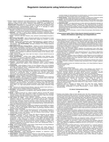 Regulamin świadczenia usług telekomunikacyjnych I. Wstęp oraz definicje. §1 1. Niniejszy regulamin świadczenia usług telekomunikacyjnych, zwany dalej Regulaminem, określa warunki i zasady świadczenia usług telekomunikacyjnych, polegających w szczególności na zapewnieniu dostępu do sieci Internet, świadczeniu usług telefonii i/lub usług telewizji przez Dostawcę usług: Beskid Media Sp. z o.o., ul. Kościuszki 115, 32650 Kęty, NIP 5492417339, Biura Obsługi Klienta: ul. Sienkiewicza 14, 32650 Kęty oraz ul. Lwowska 19, 34100 Wadowice, email: [email protected], www.beskidmedia.pl, telefon: 33 484 19 19, wpisanego do rejestru przedsiębiorców telekomunikacyjnych Prezesa UKE pod nr 9501. 2. Użyte w niniejszym Regulaminie określenia posiadają następujące znaczenie: 1. Abonent osoba fizyczna, osoba prawna, jednostka organizacyjna nieposiadająca osobowości prawnej, która zawarła Umowę o świadczenie usług telekomunikacyjnych z Dostawcą usług; 2. Aktywacja – czynności, w wyniku których następuje uruchomienie świadczenia Usług w Zakończeniu Sieci, umożliwiające Abonentowi rozpoczęcie korzystania z Usług lub korzystanie z nich na zmienionych warunkach; 3. Awaria – techniczna wada Sieci Dostawcy usług, całkowicie uniemożliwiająca korzystanie z Usług; 4. Biuro Obsługi Klienta/BOK miejsce obsługiwania Abonentów oraz Zamawiających w lokalu Dostawcy usług. Informacja o aktualnym adresie BOK znajduje się w Umowie i na stronie internetowej Dostawcy usług; 5. Cenniki łącznie cenniki świadczenia usług telekomunikacyjnych w zakresie dostępu do Internetu – dalej Cennik usług, usług telefonii – dalej Cennik usług telefonii, oraz cennik usług telewizji – dalej Cennik telewizji, stanowiące zestawienie cen za Usługi świadczone przez Dostawcę usług; 6. EBOK (Elektroniczne Biuro Obsługi Klienta) dostępna na stronie internetowej Dostawcy usług aplikacja, umożliwiająca w określonym w Umowie i Regulaminie zakresie zarządzanie Umową i usługami dla Abonenta i przez Abonenta, do której dostęp następuje poprzez podanie przydzielonego Abonentowi Numeru Identyfikacyjnego i hasła dostępu; 7. Instalacja – czynności techniczne, mające na celu wykonanie Zakończenia Sieci i/lub montaż Sprzętu w Lokalu, prowadzące do zapewnienia Abonentowi dostępu do Sieci Dostawcy usług i świadczenia mu Usług; 8. Lokal – budynek lub jego część (lokal) bądź inne miejsce, w których Abonent korzysta lub zamierza korzystać z Usług; 9. Numer Identyfikacyjny oznacza numer nadany Abonentowi przez Dostawcę usług, umożliwiający m.in. rozliczenia z Abonentem, identyfikację Abonenta w kontaktach z Dostawcą usług, w tym do logowania się do EBOK i/lub TV Panelu; 10. Okres Rozliczeniowy – okres jednego miesiąca kalendarzowego, za który dokonywane są rozliczenia należności Abonenta wobec Dostawcy usług z tytułu świadczonych Usług; 11. Programy uporządkowane zestawy audycji telewizyjnych, reklam i innych przekazów, regularnie nadawane przez nadawcę w ściśle określonych ramach czasowych (ramówce programowej); 12. Przedstawiciel – osoba działająca w imieniu i na rzecz Dostawcy usług, w tym na podstawie stosownego, pisemnego upoważnienia, uprawniona do składania i przyjmowania oświadczeń woli w zakresie zawierania, zmiany i rozwiązywania Umowy i/lub do wykonania Instalacji i innych czynności technicznych w Lokalu; 13. Rachunek – dokument, w tym faktura bądź faktura elektroniczna, na podstawie którego Abonent uiszcza opłaty za Usługi. Rachunkiem jest także elektroniczny obraz faktury, udostępniany Abonentowi za pośrednictwem EBOK lub podanego przez Abonenta adresu poczty elektronicznej, jeśli Abonent nie prowadzący działalności gospodarczej nie zgłosił Dostawcy usług zamiaru otrzymywania faktur lub nie zażądał faktury; 14. Regulamin – niniejszy regulamin świadczenia usług telekomunikacyjnych; 15. Regulamin promocji – regulamin określający szczególne, promocyjne warunki świadczenia Usług przez Dostawcę usług, polegające w szczególności na obniżeniu opłat za Usługi bądź innych opłat związanych z zawarciem i realizacją Umowy; 16. Set Top Box/STB/Dekoder urządzenie pozwalające na dekodowanie dostarczanego sygnału telewizyjnego w Lokalu Abonenta oraz na dostęp do wszelkich innych Usług Dodatkowych dostępnych z jego wykorzystaniem i oferowanych przez Dostawcę usług. STB może zostać wydzierżawiony lub kupiony przez Abonenta od Dostawcy usług. Abonent może wykorzystać własny STB, o ile z jego wykorzystaniem technicznie możliwe będzie świadczenie Usług telewizji; 17. Sieć – publiczna sieć telekomunikacyjna Dostawcy usług oraz wszelkie środki techniczne, z wykorzystaniem których następuje świadczenie Usług Abonentowi; 18. Siła wyższa – zdarzenie niezależne od Abonenta i Dostawcy usług, zewnętrzne, niemożliwe do przewidzenia i do zapobieżenia, w szczególności wojny, katastrofy naturalne, burze, wichury, powodzie, strajki; 19. Sprzęt – urządzenia techniczne (np. radiowe urządzenie odbiorcze, terminal ONT, dekoder telewizyjny STB, bramka VoIP) umieszczone w Lokalu oraz Zakończenie Sieci, stanowiące własność Dostawcy usług bądź posiadane przez niego na podstawie innego tytułu prawnego, niezbędne do świadczenia i korzystania z Usług przez Abonenta; 20. Tytuł prawny do Lokalu prawo własności, użytkowanie wieczyste, własnościowe spółdzielcze prawo do lokalu mieszkalnego lub spółdzielcze prawo do lokalu użytkowego, spółdzielcze lokatorskie prawo do lokalu, prawo do domu jednorodzinnego w spółdzielni mieszkaniowej, użytkowanie, służebność mieszkania, umowa o dożywocie, dzierżawa, najem, użyczenie bądź inna podobna umowa. Oznacza także uzyskaną przez Abonenta zgodę osoby, której przysługuje powyższe prawo do Lokalu na zainstalowanie Sprzętu i Zakończenia Sieci w Lokalu celem świadczenia Abonentowi Usług