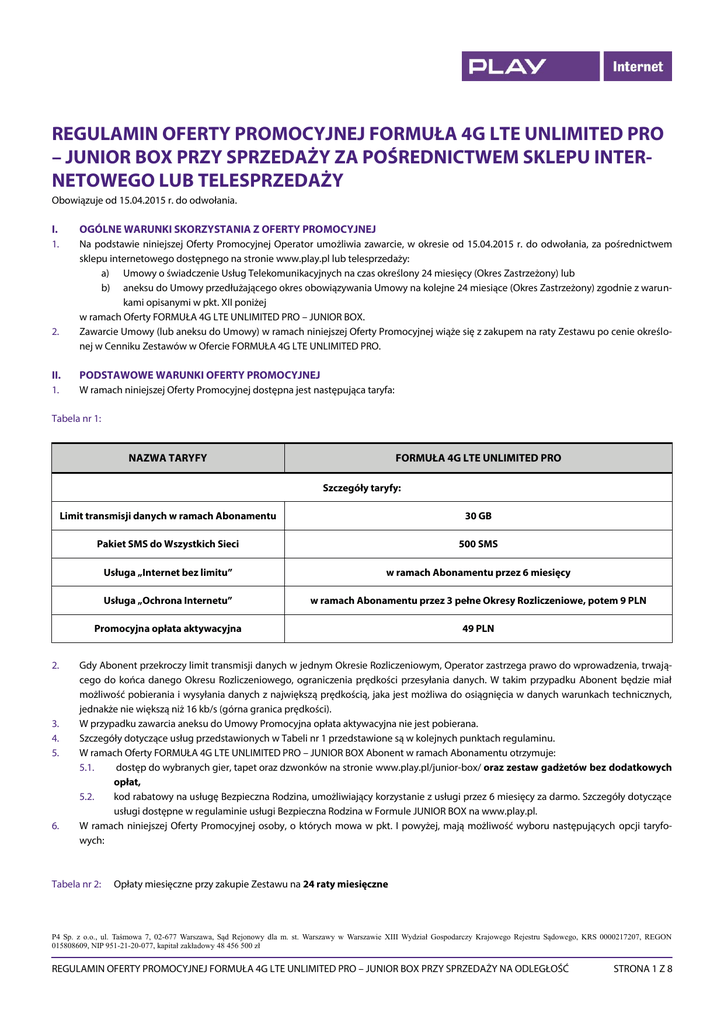 REGULAMIN OFERTY PROMOCYJNEJ FORMUŁA 4G LTE UNLIMITED PRO – JUNIOR BOX PRZY SPRZEDAŻY ZA POŚREDNICTWEM SKLEPU INTERNETOWEGO LUB TELESPRZEDAŻY Obowiązuje od 15.04.2015 r. do odwołania. I. OGÓLNE WARUNKI SKORZYSTANIA Z OFERTY PROMOCYJNEJ 1. Na podstawie niniejszej Oferty Promocyjnej Operator umożliwia zawarcie, w okresie od 15.04.2015 r. do odwołania, za pośrednictwem sklepu internetowego dostępnego na stronie www.play.pl lub telesprzedaży: a) Umowy o świadczenie Usług Telekomunikacyjnych na czas określony 24 miesięcy (Okres Zastrzeżony) lub b) aneksu do Umowy przedłużającego okres obowiązywania Umowy na kolejne 24 miesiące (Okres Zastrzeżony) zgodnie z warunkami opisanymi w pkt. XII poniżej w ramach Oferty FORMUŁA 4G LTE UNLIMITED PRO – JUNIOR BOX. Zawarcie Umowy (lub aneksu do Umowy) w ramach niniejszej Oferty Promocyjnej wiąże się z zakupem na raty Zestawu po cenie określonej w Cenniku Zestawów w Ofercie FORMUŁA 4G LTE UNLIMITED PRO. 2. II. PODSTAWOWE WARUNKI OFERTY PROMOCYJNEJ 1. W ramach niniejszej Oferty Promocyjnej dostępna jest następująca taryfa: Tabela nr 1: NAZWA TARYFY FORMUŁA 4G LTE UNLIMITED PRO Szczegóły taryfy: 2. 3. 4. 5. 6. Limit transmisji danych w ramach Abonamentu 30 GB Pakiet SMS do Wszystkich Sieci 500 SMS Usługa „Internet bez limitu” w ramach Abonamentu przez 6 miesięcy Usługa „Ochrona Internetu” w ramach Abonamentu przez 3 pełne Okresy Rozliczeniowe, potem 9 PLN Promocyjna opłata aktywacyjna 49 PLN Gdy Abonent przekroczy limit transmisji danych w jednym Okresie Rozliczeniowym, Operator zastrzega prawo do wprowadzenia, trwającego do końca danego Okresu Rozliczeniowego, ograniczenia prędkości przesyłania danych. W takim przypadku Abonent będzie miał możliwość pobierania i wysyłania danych z największą prędkością, jaka jest możliwa do osiągnięcia w danych warunkach technicznych, jednakże nie większą niż 16 kb/s (górna granica prędkości). W przypadku zawarcia aneksu do Umowy Promocyjna opłata aktywacyjna nie jest pobierana. Szczegóły dotyczące usług przedstawionych w Tabeli nr 1 przedstawione są w kolejnych punktach regulaminu. W ramach Oferty FORMUŁA 4G LTE UNLIMITED PRO – JUNIOR BOX Abonent w ramach Abonamentu otrzymuje: 5.1. dostęp do wybranych gier, tapet oraz dzwonków na stronie www.play.pl/junior-box/ oraz zestaw gadżetów bez dodatkowych opłat, 5.2. kod rabatowy na usługę Bezpieczna Rodzina, umożliwiający korzystanie z usługi przez 6 miesięcy za darmo. Szczegóły dotyczące usługi dostępne w regulaminie usługi Bezpieczna Rodzina w Formule JUNIOR BOX na www.play.pl. W ramach niniejszej Oferty Promocyjnej osoby, o których mowa w pkt. I powyżej, mają możliwość wyboru następujących opcji taryfowych: Tabela nr 2: Opłaty miesięczne przy zakupie Zestawu na 24 raty miesięczne P4 Sp. z o.o., ul. Taśmowa 7, 02-677 Warszawa, Sąd Rejonowy dla m. st. Warszawy w Warszawie XIII Wydział Gospodarczy Krajowego Rejestru Sądowego, KRS 0000217207, REGON 015808609, NIP 951-21-20-077, kapitał zakładowy 48 456 500 zł REGULAMIN OFERTY PROMOCYJNEJ FORMUŁA 4G LTE UNLIMITED PRO – JUNIOR BOX PRZY SPRZEDAŻY NA ODLEGŁOŚĆ STRONA 1 Z 8 WYSOKOŚĆ OPŁAT W TRAKCIE OKRESU ZASTRZEŻONEGO Z EFAKTURĄ (PRZY TERMINOWYCH PŁATNOŚCIACH) I ZGODAMI MARKETINGOWYMI WYSOKOŚĆ OPŁAT W TRAKCIE OKRESU ZASTRZEŻONEGO Z EFAKTURĄ (PRZY TERMINOWYCH PŁATNOŚCIACH) ALBO ZGODAMI MARKETINGOWYMI WYSOKOŚĆ OPŁAT W TRAKCIE OKRESU ZASTRZEŻONEGO BEZ E-FAKTURY I BEZ ZGÓD MARKETINGOWYCH FORMUŁA 4G LTE UNLIMITED PRO – JUNIOR BOX 59,99 5 ZŁ MNIEJ Opłata miesięczna, w tym: wysokość Abonamentu wysokość miesięcznej raty za urządzenie 59,99 PLN 65,98 PLN 71,97 PLN 29,99 PLN 35,98 PLN 41,97 PLN 30,00 PLN 30,00 PLN 30,00 PLN FORMUŁA 4G LTE UNLIMITED PRO – JUNIOR BOX 69,99 5 ZŁ MNIEJ Opłata miesięczna, w tym: wysokość Abonamentu wysokość miesięcznej raty za urządzenie 69,99 PLN 75,98 PLN 81,97 PLN 29,99 PLN 35,98 PLN 41,97 PLN 40,00 PLN 40,00 PLN 40,00 PLN FORMUŁA 4G LTE UNLIMITED PRO – JUNIOR BOX 69,99 Opłata miesięczna, w tym: wysokość Abonamentu wysokość miesięcznej raty za urządzenie 69,99 PLN 75,98 PLN 81,97 PLN 34,99 PLN 40,98 PLN 46,97 PLN 35,00 PLN 35,00 PLN 35,00 PLN FORMUŁA 4G LTE UNLIMITED PRO – JUNIOR BOX 79,99 Opłata miesięczna, w tym: wysokość Abonamentu wysokość miesięcznej raty za urządzenie 79,99 PLN 85,98 PLN 91,97 PLN 34,99 PLN 40,98 PLN 46,97 PLN 45,00 PLN 45,00 PLN 45,00 PLN FORMUŁA 4G LTE UNLIMITED PRO – JUNIOR BOX 99,99 Opłata miesięczna, w tym: wysokość Abonamentu wysokość miesięcznej raty za urządzenie 99,99 PLN 105,98 PLN 111,97 34,99 PLN 40,98 PLN 46,97 PLN 65,00 PLN 65,00 PLN 65,00 PLN FORMUŁA 4G LTE UNLIMITED PRO – JUNIOR BOX 109,99 Opłata miesięczna, w tym: wysokość Abonamentu wysokość miesięcznej raty za urządzenie 109,99 PLN 115,98 PLN 121,97 PLN 34,99 PLN 40,98 PLN 46,97 PLN 75,00 PLN 75,00 PLN 75,00 PLN FORMUŁA 4G LTE UNLIMITED PRO – JUNIOR BOX 119,99 Opłata miesięczna, w tym: 119,99 PLN 125,98 PLN 131,97 PLN P4 Sp. z o.o., ul. Taśmowa 7, 02-677 Warszawa, Sąd Rejonowy dla m. st. Warszawy w Warszawie XIII Wydział Gospodarczy Krajowego Rejestru Sądowego, KRS 0000217207, REGON 015808609, NIP 951-21-20-077, kapitał zakładowy 48 456 500 zł REGULAMIN OFERTY PROMOCYJNEJ FORMUŁA 4G LTE UNLIMITED PRO – JUNIOR BOX PRZY SPRZEDAŻY NA ODLEGŁOŚĆ STRONA 2 Z 8 wysokość Abonamentu wysokość miesięcznej raty za urządzenie WYSOKOŚĆ OPŁAT W TRAKCIE OKRESU ZASTRZEŻONEGO Z EFAKTURĄ (PRZY TERMINOWYCH PŁATNOŚCIACH) I ZGODAMI MARKETINGOWYMI WYSOKOŚĆ OPŁAT W TRAKCIE OKRESU ZASTRZEŻONEGO Z EFAKTURĄ (PRZY TERMINOWYCH PŁATNOŚCIACH) ALBO ZGODAMI MARKETINGOWYMI WYSOKOŚĆ OPŁAT W TRAKCIE OKRESU ZASTRZEŻONEGO BEZ E-FAKTURY I BEZ ZGÓD MARKETINGOWYCH 34,99 PLN 40,98 PLN 46,97 PLN 85,00 PLN 85,00 PLN 85,00 PLN FORMUŁA 4G LTE UNLIMITED PRO – JUNIOR BOX 129,99 Opłata miesięczna, w tym: wyso
