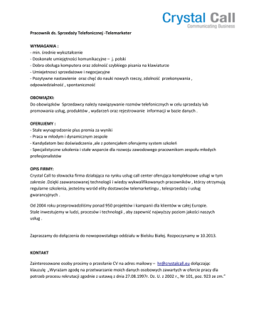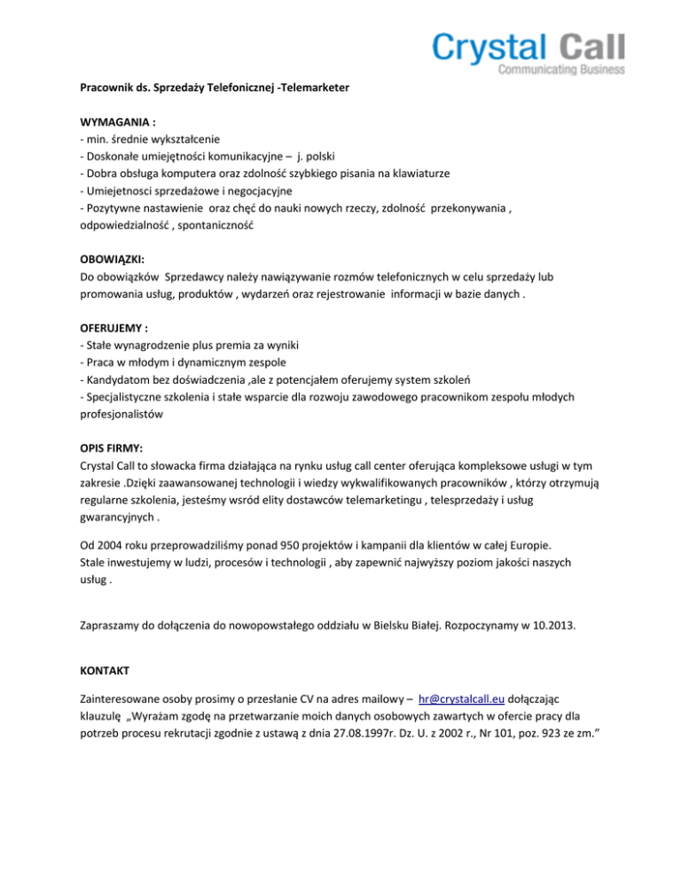 Pracownik ds. Sprzedaży Telefonicznej -Telemarketer WYMAGANIA : - min. średnie wykształcenie - Doskonałe umiejętności komunikacyjne – j. polski - Dobra obsługa komputera oraz zdolność szybkiego pisania na klawiaturze - Umiejetnosci sprzedażowe i negocjacyjne - Pozytywne nastawienie oraz chęć do nauki nowych rzeczy, zdolność przekonywania , odpowiedzialność , spontaniczność OBOWIĄZKI: Do obowiązków Sprzedawcy należy nawiązywanie rozmów telefonicznych w celu sprzedaży lub promowania usług, produktów , wydarzeń oraz rejestrowanie informacji w bazie danych . OFERUJEMY : - Stałe wynagrodzenie plus premia za wyniki - Praca w młodym i dynamicznym zespole - Kandydatom bez doświadczenia ,ale z potencjałem oferujemy system szkoleń - Specjalistyczne szkolenia i stałe wsparcie dla rozwoju zawodowego pracownikom zespołu młodych profesjonalistów OPIS FIRMY: Crystal Call to słowacka firma działająca na rynku usług call center oferująca kompleksowe usługi w tym zakresie .Dzięki zaawansowanej technologii i wiedzy wykwalifikowanych pracowników , którzy otrzymują regularne szkolenia, jesteśmy wsród elity dostawców telemarketingu , telesprzedaży i usług gwarancyjnych . Od 2004 roku przeprowadziliśmy ponad 950 projektów i kampanii dla klientów w całej Europie. Stale inwestujemy w ludzi, procesów i technologii , aby zapewnić najwyższy poziom jakości naszych usług . Zapraszamy do dołączenia do nowopowstałego oddziału w Bielsku Białej. Rozpoczynamy w 10.2013. KONTAKT Zainteresowane osoby prosimy o przesłanie CV na adres mailowy – [email protected] dołączając klauzulę „Wyrażam zgodę na przetwarzanie moich danych osobowych zawartych w ofercie pracy dla potrzeb procesu rekrutacji zgodnie z ustawą z dnia 27.08.1997r. Dz. U. z 2002 r., Nr 101, poz. 923 ze zm.”