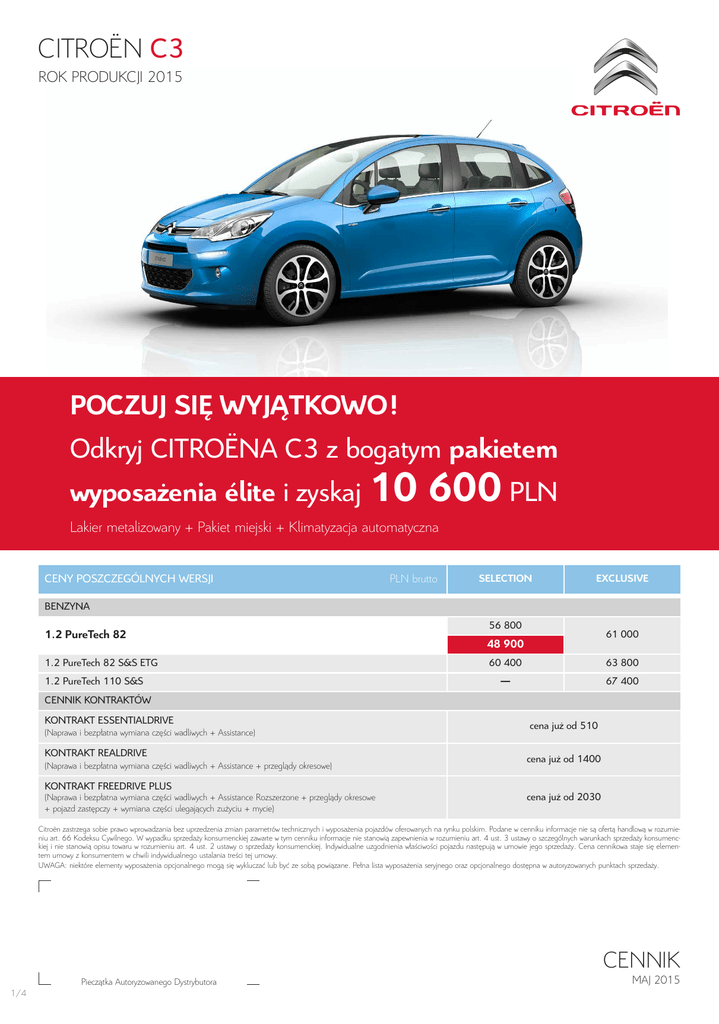 CITROËN C3 ROK PRODUKCJI 2015 Poczuj się wyjątkowo! Odkryj CITROËNA C3 z bogatym pakietem wyposażenia élite i zyskaj 10 600 plN Lakier metalizowany + Pakiet miejski + Klimatyzacja automatyczna CENy pOSzCzEGÓlNyCH WERSJI PLN brutto sELEction EXcLusiVE bENzyNA 1.2 Puretech 82 1.2 pureTech 82 S&S ETG 1.2 pureTech 110 S&S 56 800 61 000 48 900 60 400 63 800 — 67 400 CENNIK KONTRAKTÓW KONTRAKT ESSENTIAlDRIVE (Naprawa i bezpłatna wymiana części wadliwych + Assistance) KONTRAKT REAlDRIVE (Naprawa i bezpłatna wymiana części wadliwych + Assistance + przeglądy okresowe) cena już od 510 cena już od 1400 KONTRAKT FREEDRIVE plUS (Naprawa i bezpłatna wymiana części wadliwych + Assistance Rozszerzone + przeglądy okresowe + pojazd zastępczy + wymiana części ulegających zużyciu + mycie) cena już od 2030 Citroën zastrzega sobie prawo wprowadzania bez uprzedzenia zmian parametrów technicznych i wyposażenia pojazdów oferowanych na rynku polskim. Podane w cenniku informacje nie są ofertą handlową w rozumieniu art. 66 Kodeksu Cywilnego. W wypadku sprzedaży konsumenckiej zawarte w tym cenniku informacje nie stanowią zapewnienia w rozumieniu art. 4 ust. 3 ustawy o szczególnych warunkach sprzedaży konsumenckiej i nie stanowią opisu towaru w rozumieniu art. 4 ust. 2 ustawy o sprzedaży konsumenckiej. Indywidualne uzgodnienia właściwości pojazdu następują w umowie jego sprzedaży. Cena cennikowa staje się elementem umowy z konsumentem w chwili indywidualnego ustalania treści tej umowy. UWAGA: niektóre elementy wyposażenia opcjonalnego mogą się wykluczać lub być ze sobą powiązane. Pełna lista wyposażenia seryjnego oraz opcjonalnego dostępna w autoryzowanych punktach sprzedaży. CENNIK Pieczątka Autoryzowanego Dystrybutora 1/4 MAJ 2015 CITROËN C3 WAŻNIEJSzE ElEMENTy WypOSAŻENIA pOzIOM PLN brutto sELEction EXcLusiVE AbS 2 2 System stabilizacji toru jazdy (ESp) 2 2 System wspomagania hamowania awaryjnego (AFU) 2 2 Automatyczne włączanie świateł awaryjnych w przypadku nagłego hamowania 2 2 Elektroniczny rozdział siły hamowania (REF) 2 2 Regulator prędkości z ogranicznikiem Citroën Connect box 2 — 2 1200 poduszka bezpieczeństwa pasażera z możliwością odłączenia 2 2 poduszka bezpieczeństwa kierowcy 2 2 poduszki bezpieczeństwa boczne w I rzędzie 2 2 poduszki bezpieczeństwa kurtynowe w I i II rzędzie 2 2 pasy bezpieczeństwa trzypunktowe w II rzędzie 2 2 pasy bezpieczeństwa z napinaczami pirotechnicznymi i ogranicznikami napięcia 2 blokada zabezpieczająca otwarcie drzwi tylnych (manualna) blokada zabezpieczająca otwarcie drzwi tylnych (elektryczna) 2 — 2 — Automatyczne blokowanie zamków po ruszeniu 2 2 Czujnik ciśnienia w ogumieniu pośredni (DSGi) 2 2 Dwa mocowania ISOFIX w II rzędzie 2 2 Światła dzienne lED 2 2 Reflektory przeciwmgłowe 2 — 2 1000 Szyba przednia panoramiczna zenith 2 2 Szyby przednie sterowane elektrycznie, z blokada antyprzytrzaskową po stronie kierowcy i pasażera, sekwencyjne po stronie kierowcy 2 — Szyby tylne sterowane manualnie 2 — Szyba wsteczna ogrzewana 2 2 lusterka boczne regulowane elektrycznie z czujnikiem temperatury zewnętrznej 2 2 Regulacja foteli wzdłużna i kąta oparcia ręczna 2 2 Fotel kierowcy regulowany na wysokość Fotel pasażera regulowany na wysokość 2 — 2 2 (1) Kanapa tylna dzielona 1/3 - 2/3 2 2 Kieszenie w oparciach foteli przednich 2 — 2 2 (1) Szuflada pod siedzeniem kierowcy — 2 Schowek wentylowany i podświetlany 2 2 Schowki w przednich i tylnych drzwiach 2 — 2 2 — 2 Rozpylacz zapachów Komputer pokładowy wielofunkcyjny 2 2 lusterko wsteczne z funkcją dzień/noc (manualne) 2 2 Osłona przestrzeni bagażowej ruchoma 2 2 PakiEt éLitE 2 2 2 (2) 2 — 2 500 2 2 2 bEzpIECzEŃSTWO Kamera cofania 2 KOMFORT podgrzewane fotele przednie Dywaniki przód i tył Kolumna kierownicy regulowana na wysokość i głębokość kLimatyzacja automatyczna Gniazdo 12V Uchwyt na napoje w panelu środkowym zamek centralny sterowany pilotem podłokietnik środkowy przedni ze schowkiem SMEG Audio | Tablet dotykowy (7") | odtwarzacz CD/MP3 | radio, 4 głośniki, gniazdo jack, złącze USB | zestaw głośnomówiący Bluetooth | sterowanie z poziomu kierownicy 2/4 2 - Standard — - Nie występuje 200 - Cena opcji 2 2 2 CITROËN C3 WAŻNIEJSzE ElEMENTy WypOSAŻENIA pOzIOM PLN brutto sELEction EXcLusiVE SMEG Navi | Tablet dotykowy (7") | nawigacja satelitarna | odtwarzacz CD/MP3 | radio, 6 głośników, gniazdo jack, złącze USB | zestaw głośnomówiący Bluetooth | sterowanie z poziomu kierownicy 2400 2400 pack look | Chromowane wstawki na zderzaku przednim i klapie bagażnika | Chromowane listwy zewnętrzne w dolnej części szyb bocznych | Klamki zewnętrzne chromowane — 2 pack look 2 | Chromowane listwy zewnętrzne w dolnej części szyb bocznych | Klamki zewnętrzne chromowane 2 — — 2 PakiEt miEjski | Wspomaganie parkowania (czujniki tył) | Szyby tylne sterowane elektrycznie | Szyby przednie sterowane elektrycznie, sekwencyjne, z blokadą antyprzytrzaskową po stronie kierowcy i pasażera | Blokada elektryczna zabezpieczająca otwarcie drzwi tylnych i szyb | Lusterka boczne składane elektrycznie i ogrzewane PakiEt éLitE 2 pakiet Widoczność | Wycieraczki przednie automatyczne (czujnik deszczu) | Automatyczne włączanie świateł | Lusterko wsteczne wewnętrzne elektrochromatyczne — 1000 2 600 2 600 Nakładki dekoracyjne na progach drzwi przednich — Koło kierownicy pokryte skórą z przeszyciami Koło kierownicy pokryte skórą z przeszyciami i satynowymi wstawkami 2 — 2 — listwa na desce rozdzielczej Gris Moondust — 2 — Obręcze aluminiowe 16" VAlONGA 2 — Obręcze aluminiowe ClOVER 17" białe — 2 1100 Obręcze aluminiowe ClOVER 17" czarne — 1100 Opony Michelin 195/55 R16 T Energy Saver TbRR 2 2 2 400 2 400 2 2550 2 2550 bLEu EncRE (M) PakiEt éLitE 1800 bLEu ViRtuEL (M) (3) PakiEt éLitE 1800 gRis aLuminium (M) PakiEt éLitE 1800 gRis shaRk (M)