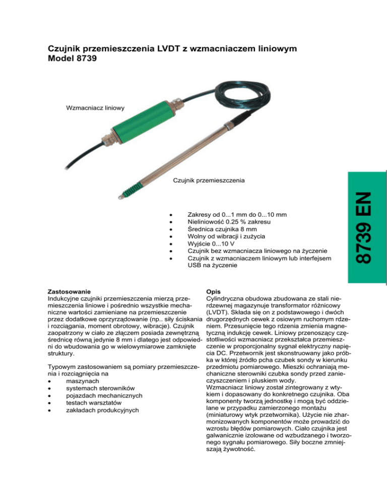Czujnik przemieszczenia LVDT z wzmacniaczem liniowym Model 8739 Wzmacniacz liniowy Czujnik przemieszczenia • • • • • • • Zakresy od 0...1 mm do 0...10 mm Nieliniowość 0.25 % zakresu Średnica czujnika 8 mm Wolny od wibracji i zużycia Wyjście 0...10 V Czujnik bez wzmacniacza liniowego na życzenie Czujnik z wzmacniaczem liniowym lub interfejsem USB na życzenie Zastosowanie Indukcyjne czujniki przemieszczenia mierzą przemieszczenia liniowe i pośrednio wszystkie mechaniczne wartości zamieniane na przemieszczenie przez dodatkowe oprzyrządowanie (np.. siły ściskania i rozciągania, moment obrotowy, wibracje). Czujnik zaopatrzony w ciało ze złączem posiada zewnętrzną średnicę równą jedynie 8 mm i dlatego jest odpowiedni do wbudowania go w wielowymiarowe zamknięte struktury. Typowym zastosowaniem są pomiary przemieszczenia i rozciągnięcia na • maszynach • systemach sterowników • pojazdach mechanicznych • testach warsztatów • zakładach produkcyjnych Opis Cylindryczna obudowa zbudowana ze stali nierdzewnej magazynuje transformator różnicowy (LVDT). Składa się on z podstawowego i dwóch drugorzędnych cewek z osiowym ruchomym rdzeniem. Przesunięcie tego rdzenia zmienia magnetyczną indukcję cewek. Liniowy przenoszący częstotliwości wzmacniacz przekształca przemieszczenie w proporcjonalny sygnał elektryczny napięcia DC. Przetwornik jest skonstruowany jako próbka w której źródło pcha czubek sondy w kierunku przedmiotu pomiarowego. Mieszki ochraniają mechaniczne sterowniki czubka sondy przed zanieczyszczeniem i pluskiem wody. Wzmacniacz liniowy został zintegrowany z wtykiem i dopasowany do konkretnego czujnika. Oba komponenty tworzą jednostkę i mogą być oddzielane w przypadku zamierzonego montażu (miniaturowy wtyk przetwornika). Użycie nie zharmonizowanych komponentów może prowadzić do wzrostu błędów pomiarowych. Ciało czujnika jest galwanicznie izolowane od wzbudzanego i tworzonego sygnału pomiarowego. Siły boczne zmniejszają żywotność. Dane techniczne Model 8739 Wymiary [mm] Kod Zakres L A B H Częstotliwość [Hz] Siła w pełnej skali max [N] Waga [g] 8739-5001-V501 0... 1 mm 103 97.5 15.5 4 100 2.3 25 8739-5002-V501 0... 2 mm 103 97.5 15.5 4 100 2.3 25 8739-5005-V501 0... 5 mm 140 130 23 7 100 2.3 25 8739-5010-V501 0... 10 mm 146 140 27 11 100 3.3 25 Model 8739 z zewnętrznym wzmacniaczem liniowym Kod Zakres Czułość Wzbudzenie napięcia czujnika [V] Częstotliwość pracy [kHz] Rezystor kalibracyjny [kΩ] 8739-5001-V000 0... ± 0.5 mm 106 mV/V /mm 2 5 2.3 8739-5002-V000 0... ± 1 mm 106 mV/V /mm 2 5 2.3 8739-5005-V000 0...± 2.5 mm 62 mV/V 2 5 2.3 8739-5010-V000 0... ± 5 mm 62 mV/V 2 5 3.3 Czujnik LVDT Wartości elektryczne Wzbudzenie napięcia (ochraniane przed błędną polaryzacją): 13.5... 28 V DC Prąd na wyjściu: < 30 mA Zakres pomiarowy napięcia na wyjściu: 0... + 10 V Rozprzestrzenianie napięcia wyjściowego: 20 mVss Częstotliwość wewnętrznego kolektora: 4 kHz Rezystancja na wyjściu: 1 kΩ Ładowanie rezystora: polecane: > 1MΩ Wzmacniacz liniowy Informacja o zamówieniu Indukcyjny czujnik przemieszczenia z zakresem 0...5 mm zawierający liniowy wzmacniacz z wyjściem analogowym 0...+10 V Model 8739-5005-V501 Indukcyjny czujnik przemieszczenia z zakresem 0...2 mm Model 8739-5002-V000 Akcesoria Zaciski do modelu 8739 (odniesienie do rys.) Warunki środowiskowe Model 8739-Z005 Zakres temperatur roboczych: -20 C... 80C Klamra mocująca do modelu 8739 (odniesienie do rys.) Model 8739-Z003 Zakres temperatur składowania: -20 C... 80 C Wpływ temperatury*: 0.03 % zakresu/K Gwintowana tulejka (odniesienie do rys.) Model 8739-Z004 *odnośnie nominalnego zakresu temperatury. Wartości mechaniczne Wtyk 12-nóżkowy do urządzeń burstera Model 9941 Nieliniowość: < 0.25 % zakresu Montaż wtyku do kabla Model 99004 Niepowtarzalność: ± 0.1 % zakresu Wtyk 9-nóżkowy Min-D do modelu 9310 Histereza: ± 0.1 % zakresu Model 9900-V209 Sonda wbijana: kierowana przez czop kulkowy Przy podłączaniu czujnika do Digiforce 9310 wersji wyCzubek próbki (dołączony do standardowej dostawy): M 2.5 świetlacza zewnętrzne wzbudzenie napięcia jest wymaPodstawowy materiał obudowy czujnika: ST25, platerowany gane dla wersji z liniowym (model 8739-...-V505 lub – nikiel V506). Podstawowy materiał obudowy wzmacniacza: aluminium Urządzenia lub systemy do pomiaru wartości lub monitoKlasa ochrony: zgodna z EN60529: model 8739 IP60 ringu procesu (odniesienie do rozdziału 9 katalogu burKlasa ochrony wzmacniacza: IP65 stera) Wymiary wzmacniacza: 25 x 73.7 [mm] Opcje Wymiary z PG bolcami: 25 x 114 [mm] Złącza elektryczne: ekranowane, przewód izolowany V302: Obudowa czujnika z gwintami mocującymi M24 x PVC, całkowita długość 4 m, wzmacniacz zamontowany cen- 1.5 x 45 zawiera 2 głowic (odniesienie do montażu urzątralnie i nierozdzielnie, promień ugięcia ≥ 10 mm, z dzenia). Gwintowana tulejka jest montowana równo z obudową 4 – nóżkowym wtykiem do czujnika, z drugiej strony wolne Indukcyjny czujnik z końce. Okablowanie: z wzmacniaczem bez wzmacniacza prądem wyjścia 4-20 mA, na życzenie. wzbudzenie: (+) brązowy 1 sygnał (+) zielony 3 wzbudzenie/sygnał (-) biały 2 Uziemienie ekranowania (GND) Indukcyjny czujnik przemieszczenia z interfejsem USB i oprogramowaniem obliczeniowym (na życzenie) Rada montażowa: montaż ciała czujnika przy użyciu klamry lub dopasowanej gwintowanej tulejki (patrz rysunek) Zakładowy Certyfikat Kalibracji (WKS) Standardowa kalibracja zakładowa, przyrost co 20% zakresu z lub bez wskaźnika.