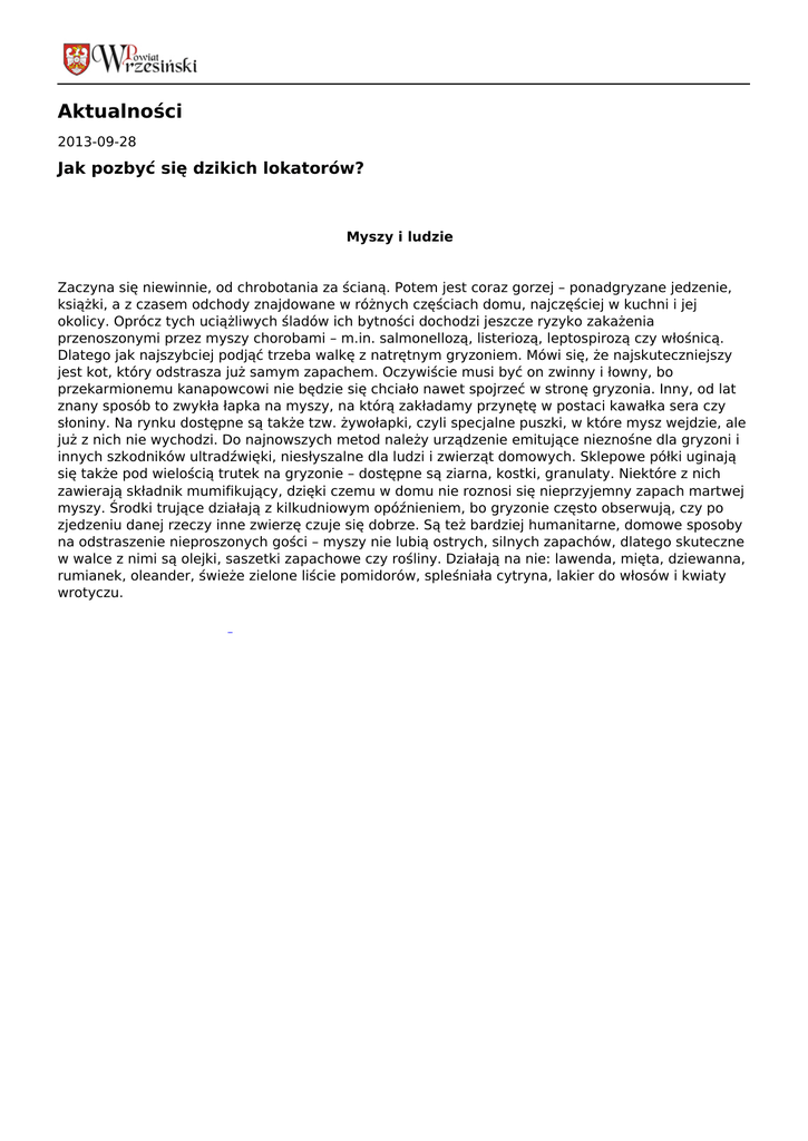 Aktualności 2013-09-28 Jak pozbyć się dzikich lokatorów? Myszy i ludzie Zaczyna się niewinnie, od chrobotania za ścianą. Potem jest coraz gorzej – ponadgryzane jedzenie, książki, a z czasem odchody znajdowane w różnych częściach domu, najczęściej w kuchni i jej okolicy. Oprócz tych uciążliwych śladów ich bytności dochodzi jeszcze ryzyko zakażenia przenoszonymi przez myszy chorobami – m.in. salmonellozą, listeriozą, leptospirozą czy włośnicą. Dlatego jak najszybciej podjąć trzeba walkę z natrętnym gryzoniem. Mówi się, że najskuteczniejszy jest kot, który odstrasza już samym zapachem. Oczywiście musi być on zwinny i łowny, bo przekarmionemu kanapowcowi nie będzie się chciało nawet spojrzeć w stronę gryzonia. Inny, od lat znany sposób to zwykła łapka na myszy, na którą zakładamy przynętę w postaci kawałka sera czy słoniny. Na rynku dostępne są także tzw. żywołapki, czyli specjalne puszki, w które mysz wejdzie, ale już z nich nie wychodzi. Do najnowszych metod należy urządzenie emitujące nieznośne dla gryzoni i innych szkodników ultradźwięki, niesłyszalne dla ludzi i zwierząt domowych. Sklepowe półki uginają się także pod wielością trutek na gryzonie – dostępne są ziarna, kostki, granulaty. Niektóre z nich zawierają składnik mumifikujący, dzięki czemu w domu nie roznosi się nieprzyjemny zapach martwej myszy. Środki trujące działają z kilkudniowym opóźnieniem, bo gryzonie często obserwują, czy po zjedzeniu danej rzeczy inne zwierzę czuje się dobrze. Są też bardziej humanitarne, domowe sposoby na odstraszenie nieproszonych gości – myszy nie lubią ostrych, silnych zapachów, dlatego skuteczne w walce z nimi są olejki, saszetki zapachowe czy rośliny. Działają na nie: lawenda, mięta, dziewanna, rumianek, oleander, świeże zielone liście pomidorów, spleśniała cytryna, lakier do włosów i kwiaty wrotyczu. Karaluchy pod poduchy Inni nieproszeni dzicy lokatorzy to karaluchy, zwane też karaczanami. Te wzbudzające odrazę owady są nosicielami zarazków, m.in. gruźlicy, tyfusu, cholery, czerwonki, trądu, tężca. Unoszące się w powietrzu cząstki ich odchodów lub wylinek mogą wywoływać alergie bądź reakcje astmatyczne. Karaluchy lubią wilgoć i ciepło, stąd często przestraszyć nas mogą w łazience. Jak je wytępić? Oprócz całej gamy środków chemicznych, jak spreje na owady, płytki wabiące i inne trutki, skuteczną jest ponoć pasta, którą smaruje się framugi, progi i brzegi kratek wentylacyjnych. Jej zapach odstrasza na tyle skutecznie, że insekty nie wchodzą do domu. Z babcinych sposobów poleca się mieszankę kwasu borowego z żółtkiem. Dawniej gospodynie robił także rozmaite pułapki – do głębokiego naczynia – balii lub słoika wkładały kartofle, kości, fusy od kawy albo wlewały piwo, robiły prowizoryczną drabinkę, po której karaluchy wchodziły do środka, ale wyjść już nie mogły – złapane owady polewano wrzątkiem, topiono. Często na noc wykładano także w różnych częściach domu namoczone w piwie szmatki. Rano upojone alkoholem karaczany wrzucano do ognia. Imperium mrówek Mrówki faraona spotkać można wszędzie tam, gdzie jest ciepło i jedzenie. Są rude i małe – mierzą od 1,5 do 4 mm. Jedzą dosłownie wszystko, łącznie z pastą do butów, krochmalem czy gumą. Ich obecność stwarza duże ryzyko infekcji, przenoszą bowiem rozmaite zarazki, którymi potem zanieczyszczają jedzenie. Zaleca się utrzymywanie absolutnego, wręcz sterylnego porządku w kuchni, by nie dopuścić do zagnieżdżenia się mrówek. Wabi je każdy okruch, pozostawione na wierzchu jedzenie. Domowymi sposobami zwalczania tych owadów jest przygotowanie trutki z żółtka i boraksu zmieszanych w proporcji 10:1 albo roztworu składającego się z 200 ml wody, 100 ml octu oraz 2-3 łyżek płynu do mycia naczyń. Odstrasza je też zapach cynamonu, kocimiętki i skórki cytrynowej. Na rynku dostępnych jest wiele specyfików chemicznych zwalczających faraonki. Mrówki najczęściej spotkać można w blokach, gdzie atakują od razu wiele mieszkań. – Z dnia na dzień pojawiły się u mnie w mieszkaniu – opowiada pani Dorota mieszkająca na jednym z wrzesińskich osiedli. – Malutkie, jeszcze mniejsze niż normalne mrówki. Właziły dosłownie wszędzie – do jedzenia, do szaf z rzeczami, a nawet krążyły w łazience wokół proszków do prania i mydeł. Często robiły gniazda w nietypowych miejscach, np. w piekarniku, w rogaliku marcińskim lub w zakamarkach szuflad. Było ich tysiące. Wystarczy, że na stole pozostawiło się okruszek chleba, to zaraz zlatywały się całe armie wygłodniałych szkodników. To było straszne. Nie tylko ja miałam z nimi problem, ale cały 4-piętrowy pion bloku mieszkalnego. Stosowaliśmy głównie chemiczne preparaty, by odstraszyć insekty, lecz to nie pomagało. Dopiero po interwencji firmy i zastosowaniu preparatu do opryskiwania powoli zaczęły ginąć. Trzeba pamiętać, że gdy owady albo gryzonie atakują blok, ważne jest wspólne działanie wszystkich lokatorów w celu odstraszenia insekta. Najskuteczniejsza jest oczywiście profilaktyka – pozalepianie jeszcze latem wszelkich szpar, dziur, uszczelnienie drzwi i okien, utrzymywanie naszych domostw w porządku. Jeśli jednak szkodnik wdarł się już do naszego domu, trzeba niezwłocznie podjąć z nim walkę, nie dopuszczając do zagnieżdżenia się całej kolonii. Najskuteczniej chyba jest jednak połączyć kilka metod – wtedy mamy pewność, że natrętni goście wyniosą się szybko i nieprędko wrócą. A gdy domowe i sklepowe sposoby nie pomagają, można zawsze wezwać profesjonalną firmę zajmująca się usuwaniem intruzów. Agnieszka Przysiuda-Zielkowska Jesień wraz z deszczem i zmianą temperatury przynosi jeszcze inne „niespodzianki” – dzikich lokatorów, na których nie działają żadne nakazy eksmisji. Kiedy 