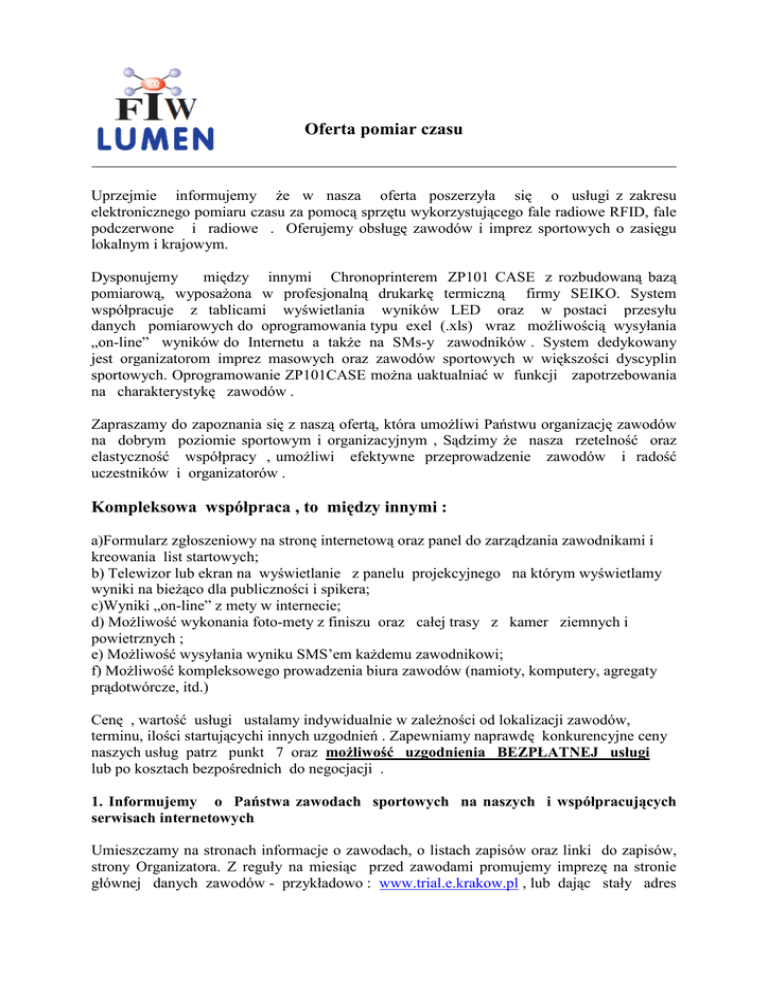Oferta pomiar czasu Uprzejmie informujemy że w nasza oferta poszerzyła się o usługi z zakresu elektronicznego pomiaru czasu za pomocą sprzętu wykorzystującego fale radiowe RFID, fale podczerwone i radiowe . Oferujemy obsługę zawodów i imprez sportowych o zasięgu lokalnym i krajowym. Dysponujemy między innymi Chronoprinterem ZP101 CASE z rozbudowaną bazą pomiarową, wyposażona w profesjonalną drukarkę termiczną firmy SEIKO. System współpracuje z tablicami wyświetlania wyników LED oraz w postaci przesyłu danych pomiarowych do oprogramowania typu exel (.xls) wraz możliwością wysyłania „on-line” wyników do Internetu a także na SMs-y zawodników . System dedykowany jest organizatorom imprez masowych oraz zawodów sportowych w większości dyscyplin sportowych. Oprogramowanie ZP101CASE można uaktualniać w funkcji zapotrzebowania na charakterystykę zawodów . Zapraszamy do zapoznania się z naszą ofertą, która umożliwi Państwu organizację zawodów na dobrym poziomie sportowym i organizacyjnym , Sądzimy że nasza rzetelność oraz elastyczność współpracy , umożliwi efektywne przeprowadzenie zawodów i radość uczestników i organizatorów . Kompleksowa współpraca , to między innymi : a)Formularz zgłoszeniowy na stronę internetową oraz panel do zarządzania zawodnikami i kreowania list startowych; b) Telewizor lub ekran na wyświetlanie z panelu projekcyjnego na którym wyświetlamy wyniki na bieżąco dla publiczności i spikera; c)Wyniki „on-line” z mety w internecie; d) Możliwość wykonania foto-mety z finiszu oraz całej trasy z kamer ziemnych i powietrznych ; e) Możliwość wysyłania wyniku SMS’em każdemu zawodnikowi; f) Możliwość kompleksowego prowadzenia biura zawodów (namioty, komputery, agregaty prądotwórcze, itd.) Cenę , wartość usługi ustalamy indywidualnie w zależności od lokalizacji zawodów, terminu, ilości startującychi innych uzgodnień . Zapewniamy naprawdę konkurencyjne ceny naszych usług patrz punkt 7 oraz możliwość uzgodnienia BEZPŁATNEJ usługi lub po kosztach bezpośrednich do negocjacji . 1. Informujemy o Państwa zawodach sportowych na naszych i współpracujących serwisach internetowych Umieszczamy na stronach informacje o zawodach, o listach zapisów oraz linki do zapisów, strony Organizatora. Z reguły na miesiąc przed zawodami promujemy imprezę na stronie głównej danych zawodów - przykładowo : www.trial.e.krakow.pl , lub dając stały adres www przykładowo : - www.bmx.jaslo.karpaty.pl - a także informując - mailami zawodników o istotnych walorach imprezy. 2. Zapisy elektroniczne w Internecie z automatycznymi bezpłatnymi numerami płatnymi elektronicznie numerami startowymi . lub Udostępniamy system informatyczny do prowadzenia zapisów internetowych. Są to konfigurowalne pod potrzeby konkretnej imprezy formularze zapisujące wszystkie niezbędne informacje do baz danych. System zapisów umożliwia między innymi: rejestrację danych zawodnika drukowanie list zgłoszonych zawodników a także eksportowanie ich do excela wraz informacją majlową dla zawodnika o udzielonym numerze drukowanie wypełnionych danymi oraz innych kart zgłoszeń rejestrowanie ręczne lub automatyczne wpłat zawodników nadawanie numerów startowych korektynajczęściej występujących omyłek lub braków danych W zakresie usługi internetowej możemy współpracować w następujący sposób: Przekazujemy Państwu longiny i hasła dostępu abyście mogli sami nadzorować zapisy, rejestrować wpłaty, nadawać numery i przygotowywać dane dla zawodów Zarządzamy zapisami w Państwa imieniu, rejestrujemy przekazane przez Was wpłaty, nadajemy numery, porządkujemy dane przygotowujemy do zawodów, pobieramy opłaty startowe nowoczesnymi kanałami płatności elektronicznych i automatycznie przekazujemy dane dla Państwa , 3. Numery startowe Współpracujemy z producentami numerów startowych a także sami je przygotowujemy , w formie dostosowanej do warunków zawodów sportowych, czyli trudno rozrywalnym i wodoodpornym. Numery przygotowywane są jako w pełni kolorowe wg. Państwa projektu lub według naszego wzoru .W razie potrzeby służymy pomocą przy projektowaniu numeru. W przypadku stosowania chipów jednorazowych lub wielorazowych - przyklejanych do numeru startowego lub w innym miejscu , przy zamówieniu u nas numerów zostają do nich od razu przyklejone chipy z zabezpieczeniami oraz są one od razu zaprogramowane i przetestowane przed dostawą do Państwa. 4. Biuro zawodów Prowadzimy lub pomagamy Państwu organizować pracę biura zawodów - przekazujemy stosowne instrukcje i materiały - wydrukowane karty zgłoszeń, listy, układy stoisk itd. Nasi pracownicy rejestrują do komputerów w biurze zawodów dane nowo zgłaszających się zawodników. 5. Wyniki w czasie zawodów -Transmisję na żywo w Internecie. W specjalnie przygotowanym dla Państwa imprezy panelu lub TV wyświetlane są na bieżąco wyniki, międzyczasy z trasy, zdjęcia i filmy z rejonu mety. W przypadku dłuższych zawodów umożliwiamy śledzenie zawodników na schemacie trasy na podstawie dokonanych na trasie pomiarów. Automatycznie generujemy grafikę do wyświetlania rankingów na ekranach LED. - Ekrany LED mobilny na którym specjalnie przygotowana aplikacja wyświetla rankingi, loga sponsorów, obraz z mety oraz na życzenie pozdrowienia dla finiszujących zawodników zamówione za pośrednictwem portalu zawodników. -SMS z wynikiem - w czasie zawodów wysyłamy do zawodników sms-a z wynikiem. Przy masowych imprezach umożliwia to natychmiastowy dostęp zawodnikom do ich rezultatów bez konieczności wyszukiwania swojego rezultatu pośród setek nazwisk na listach wydruków. -Stanowisko komentatora - udostępniamy na życzenie komputer, sprzężony z serwerem mety, na którym wyświetlane są na bieżąco dane finiszujących zawodników dla komentatora. 6. Po zawodach Po zawodach udostępniamy komplet rezult